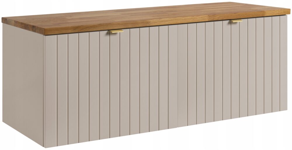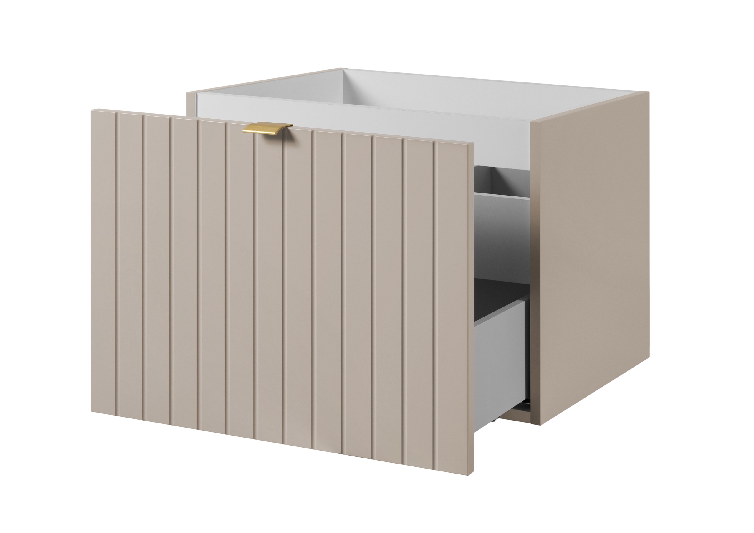 Kolekcja HARMO łączy elegancki design z praktycznymi rozwiązaniami, które doskonale komponują się z nowoczesnymi łazienkami. Pionowo frezowane fronty z płyty MDF w kaszmirowym półmacie podkreślają subtelny i nowoczesny charakter mebla, a wisząca konstrukcja dodaje lekkości i ułatwia sprzątanie. Szafka o szerokości 120 cm składa się z dwóch segmentów po 60 cm, wyposażonych w pojemne szuflady zewnętrzne na prowadnicach Hettich Quadro z funkcją cichego domyku oraz dodatkowe wewnętrzne szufladki, które doskonale sprawdzą się do przechowywania drobnych akcesoriów. W zestawie znajdują się trzy warianty uchwytów: czarny, złoty i srebrny szczotkowany. Meble wyprodukowane w Polsce z wysokiej jakości materiałów.
