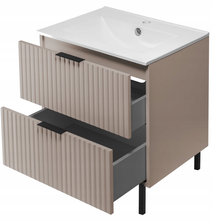 Kaszmirowa szafka z kolekcji FLOW to subtelne i stylowe rozwiązanie dla nowoczesnych łazienek. Fronty w odcieniu ciepłego beżu z dekoracyjnym ryflowaniem doskonale współgrają z matowym korpusem, tworząc elegancką i spójną całość.