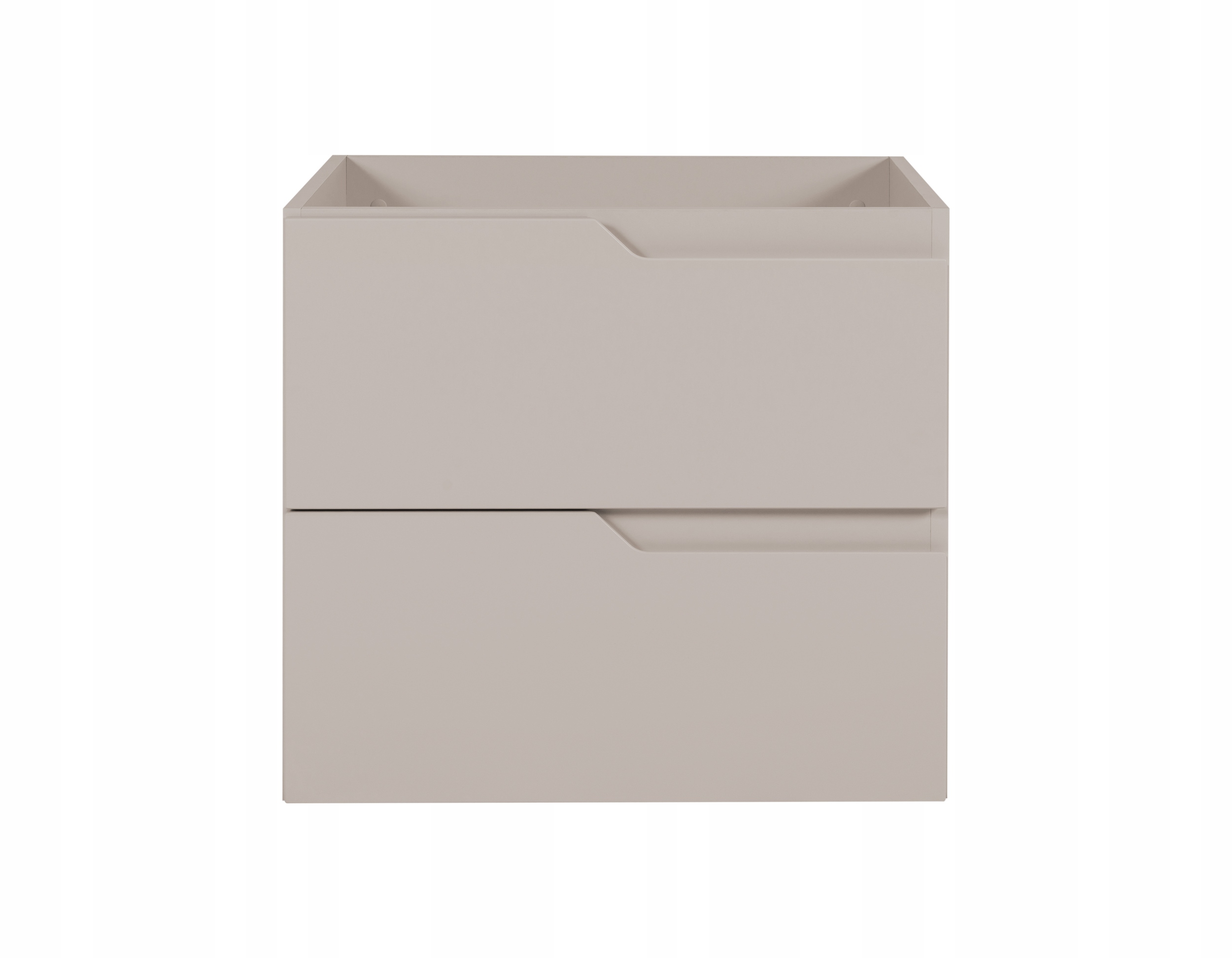 Model o szerokości 60 cm, wysokości 57 cm i głębokości 46 cm wyposażono w dwie pojemne szuflady z systemem cichego domykania SOFT CLOSE, który zapewnia wysoki komfort codziennego użytkowania. Frezowane uchwyty podkreślają minimalistyczny charakter mebla i pozwalają zachować gładką, nowoczesną linię frontu. Szafka doskonale komponuje się z umywalkami nablatowymi lub wpuszczanymi, stanowiąc funkcjonalne i stylowe rozwiązanie dla każdej łazienki.