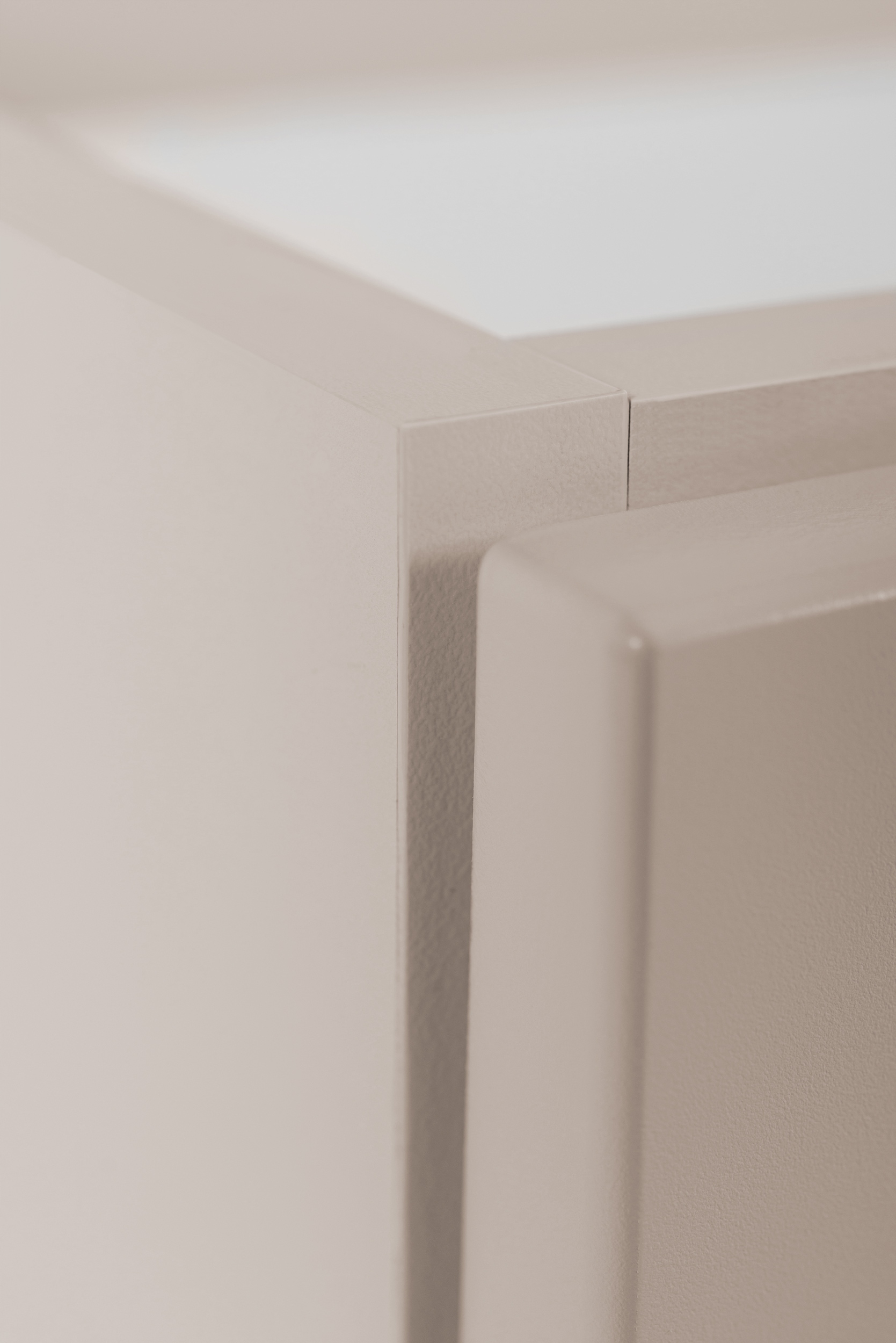 Korpus wykonano z płyty laminowanej 16 mm w kolorze kaszmiru, a fronty z płyty MDF 16 mm wykończonej folią matową. Obrzeża zabezpieczono tworzywem ABS 0,5 mm, co zwiększa odporność na wilgoć i uszkodzenia. Wnętrze szuflad w jasnoszarym odcieniu dodaje całości elegancji, a solidna konstrukcja gwarantuje trwałość na lata.