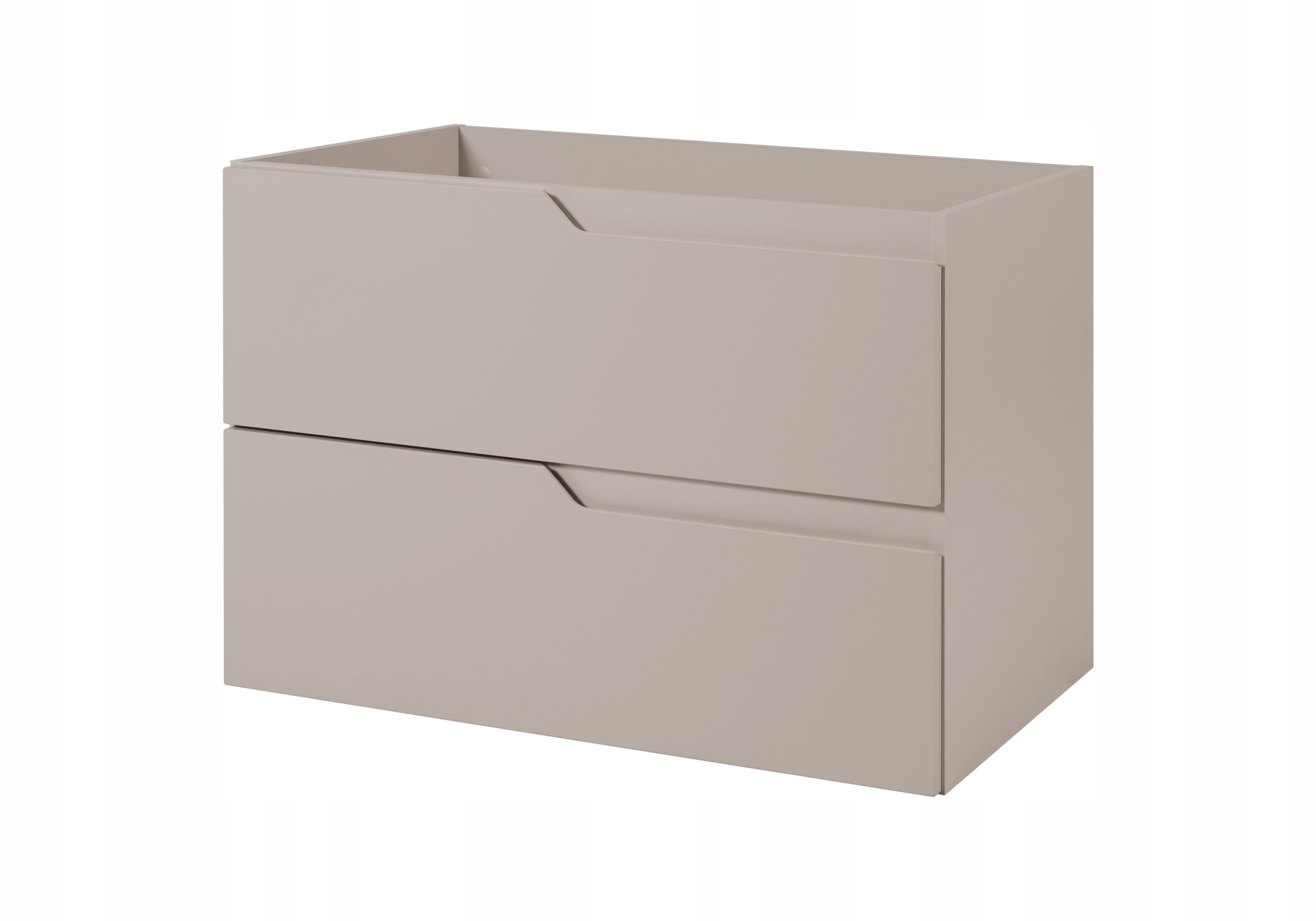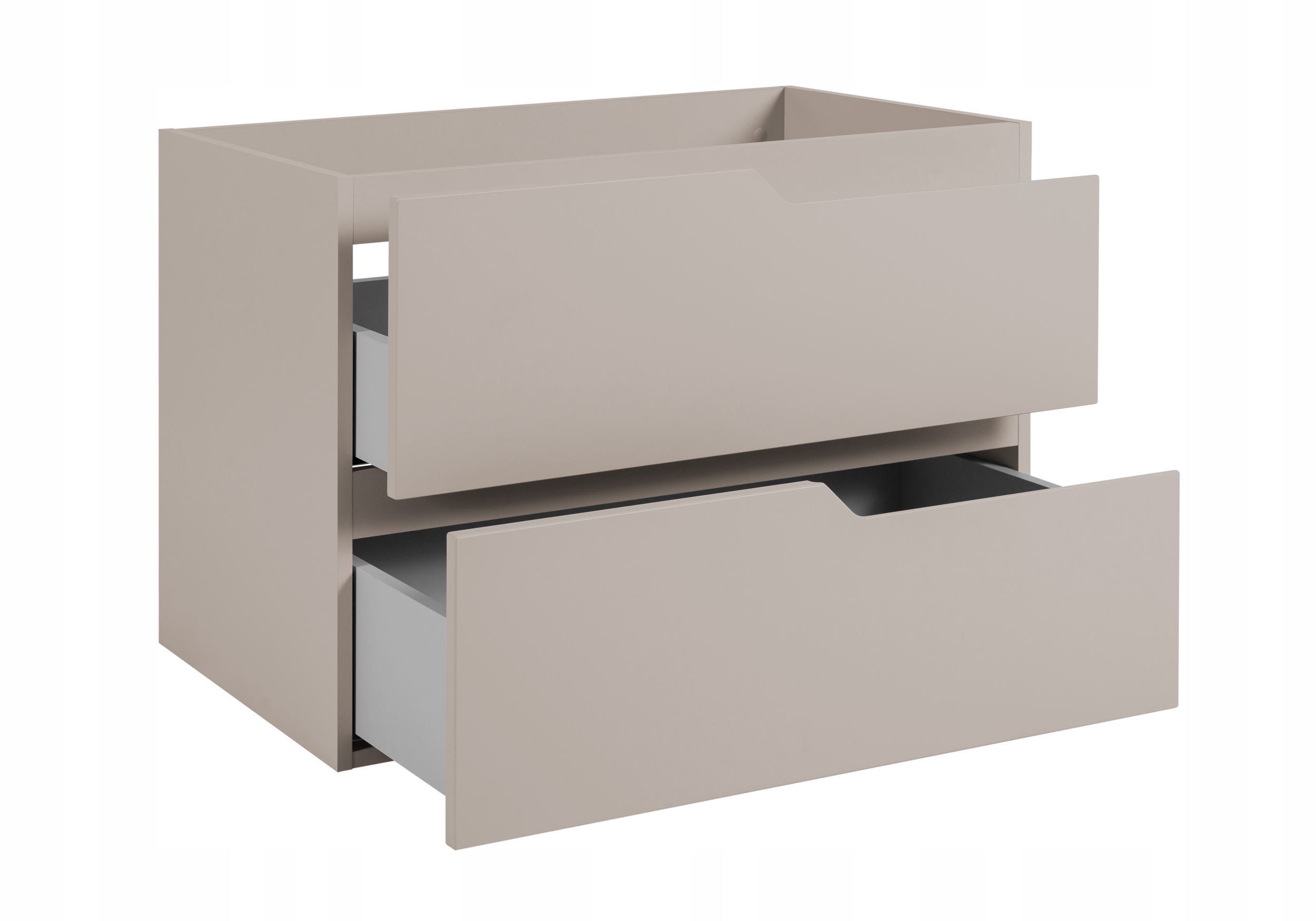 Model o szerokości 80 cm, wysokości 57 cm i głębokości 46 cm został wyposażony w dwie pojemne szuflady z systemem cichego domykania SOFT CLOSE, który gwarantuje wygodę i płynne działanie mechanizmów. Frezowane uchwyty podkreślają subtelny charakter mebla, zachowując jednocześnie pełną wygodę otwierania. Szafka doskonale sprawdzi się jako baza pod umywalkę nablatową lub wpuszczaną, tworząc elegancki i funkcjonalny punkt centralny łazienki.