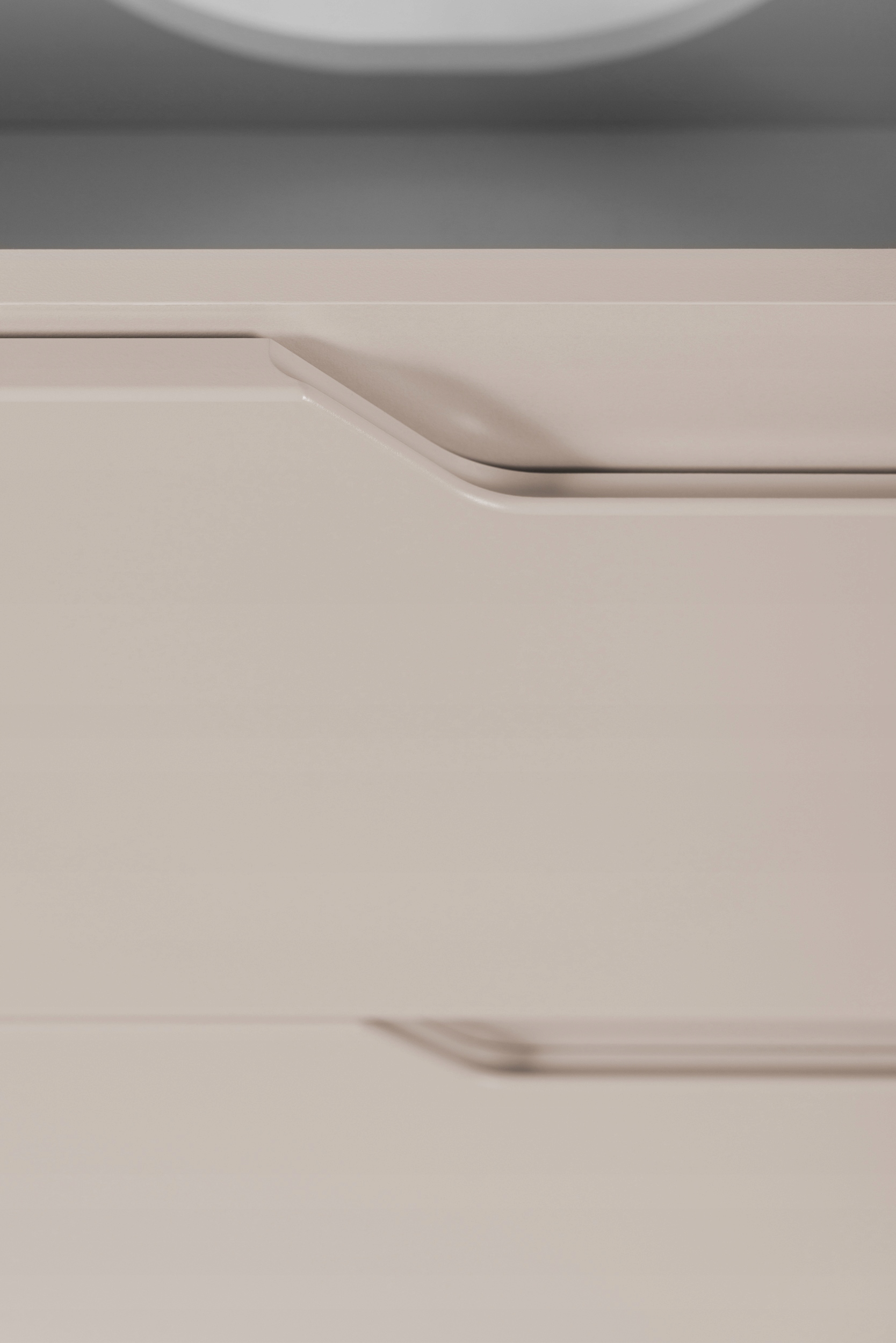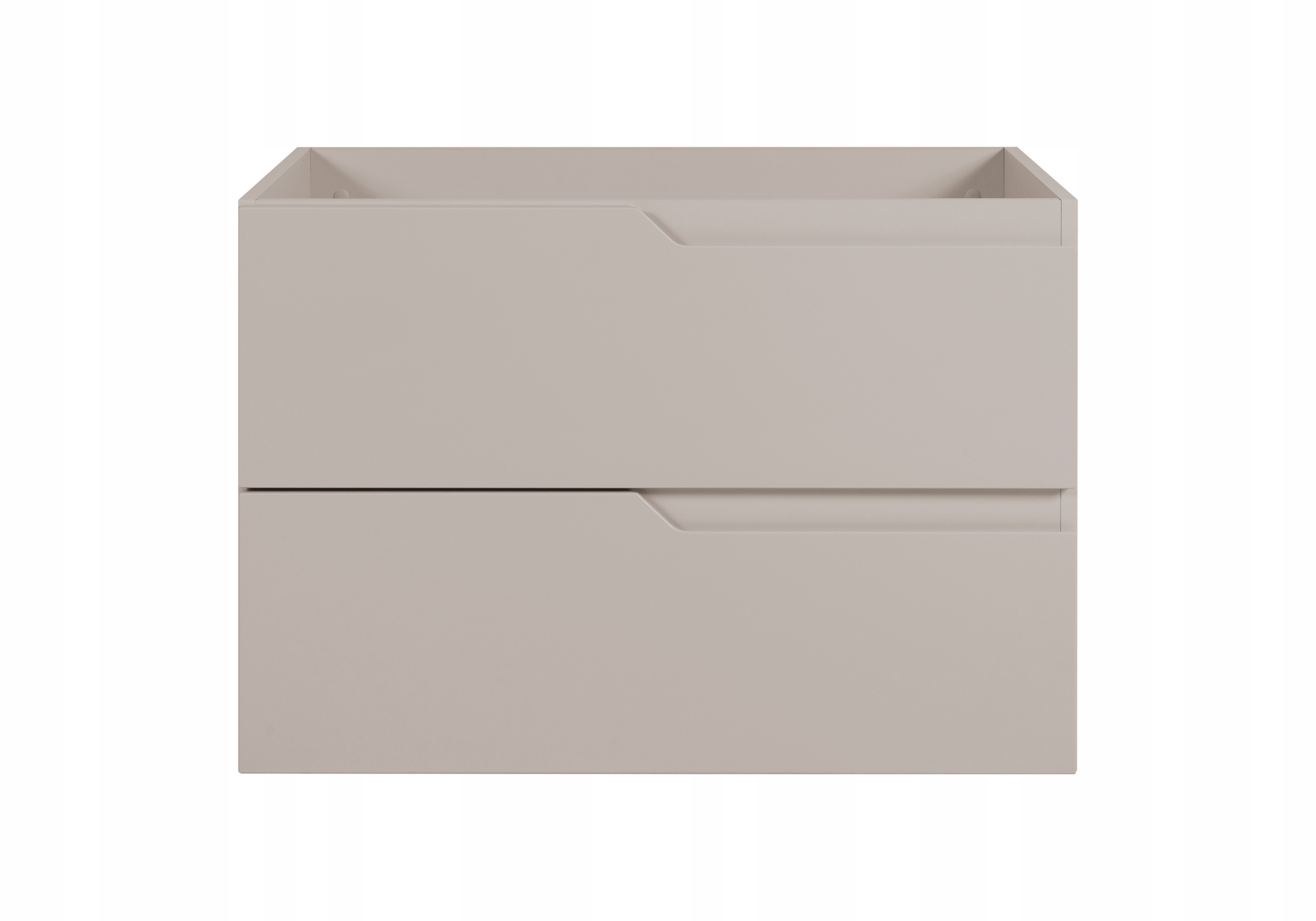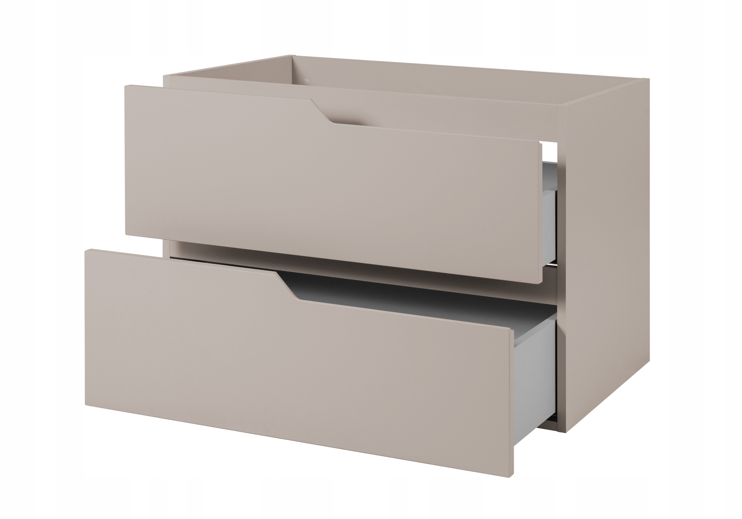 Korpus wykonano z płyty laminowanej 16 mm, a fronty z płyty MDF o tej samej grubości, wykończonej matową folią w kolorze kaszmiru. Obrzeża zabezpieczono tworzywem ABS 0,5 mm, które zwiększa odporność na wilgoć i codzienne użytkowanie. Wnętrze szuflad w jasnym, szarym kolorze dodaje całości estetyki i elegancji, a solidna konstrukcja zapewnia trwałość i niezawodność przez lata.