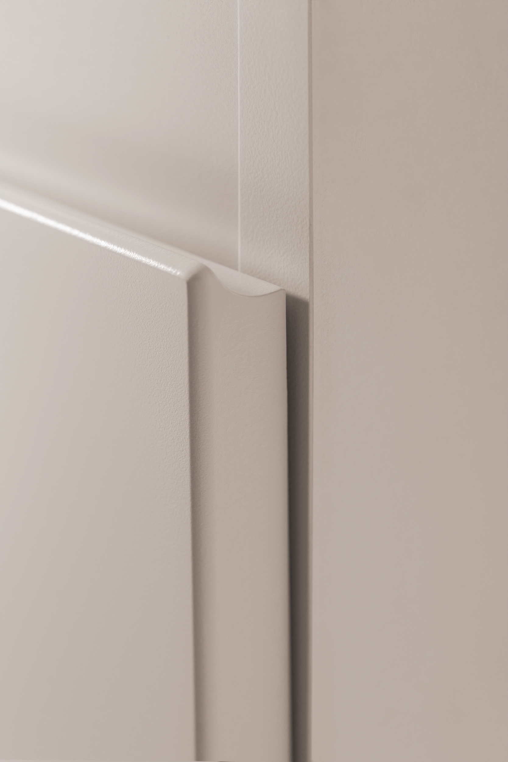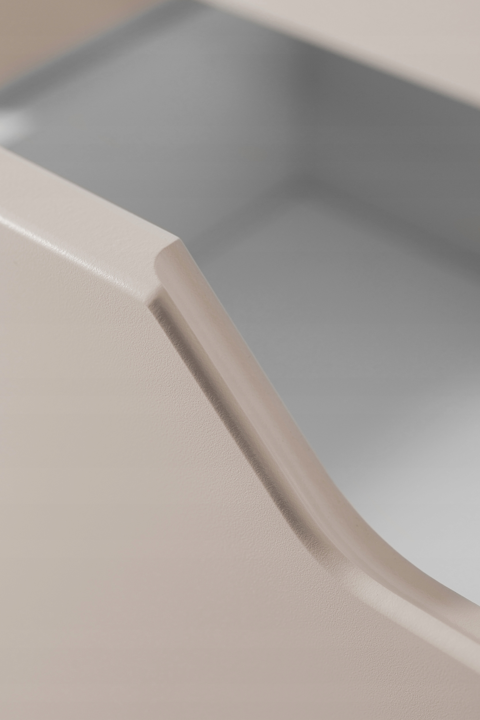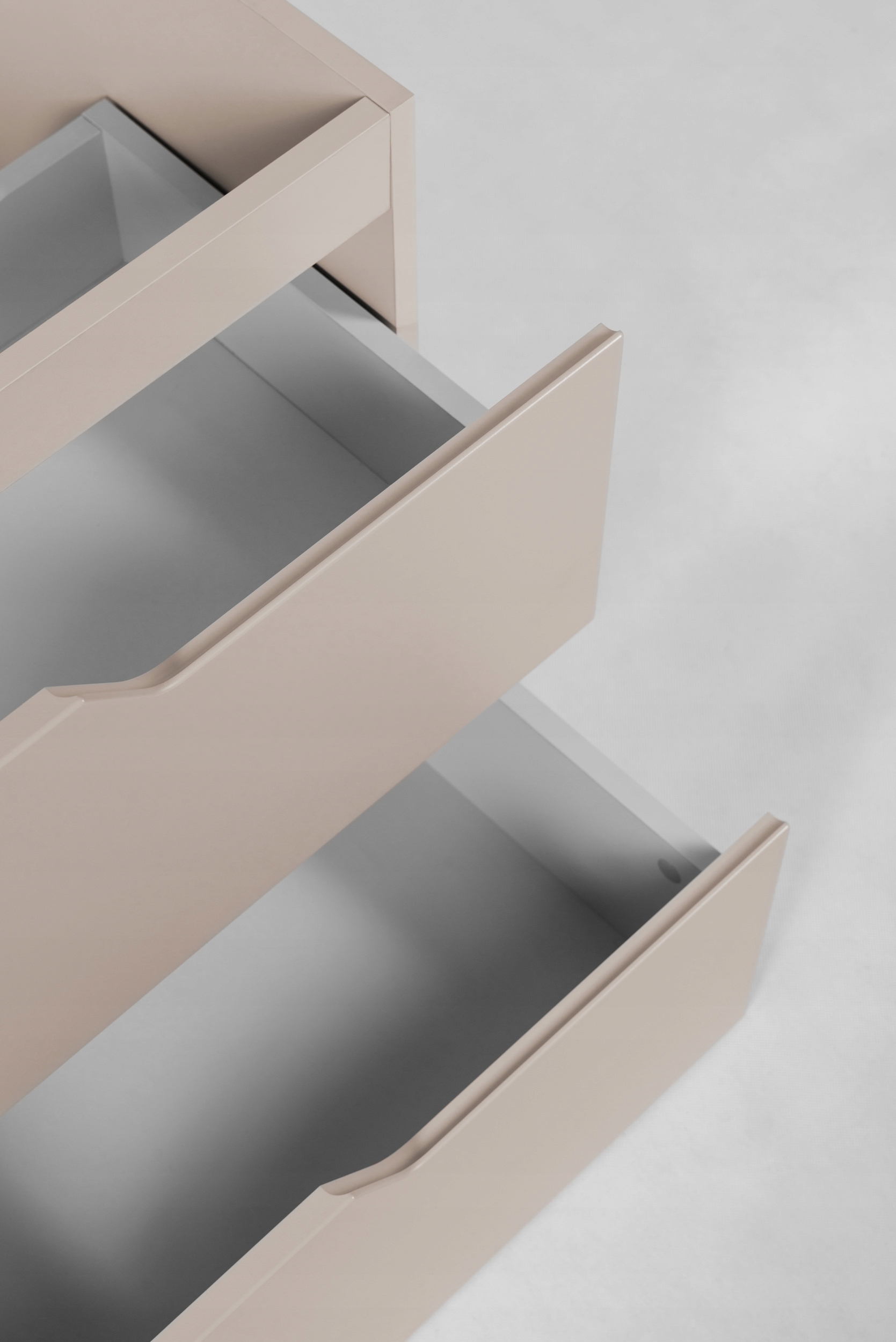 Korpus wykonano z płyty laminowanej 16 mm, a fronty z płyty MDF o tej samej grubości, wykończonej matową folią w kolorze kaszmiru. Obrzeża zabezpieczono tworzywem ABS 0,5 mm, które zwiększa odporność na wilgoć i codzienne użytkowanie. Wnętrze szuflad w jasnym, szarym kolorze dodaje całości estetyki i elegancji, a solidna konstrukcja zapewnia trwałość i niezawodność przez lata.