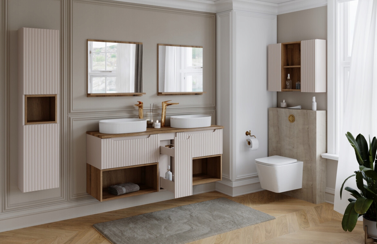Kolekcja NOVA KASZMIR to połączenie nowoczesnego minimalizmu z eleganckim, ciepłym odcieniem kaszmiru, który wprowadza do łazienki spokój i harmonię. Charakterystyczne pionowe ryflowania frontów oraz zintegrowany podchwyt nadają meblom ponadczasowy wygląd, dzięki czemu kolekcja doskonale odnajduje się zarówno w nowoczesnych, jak i bardziej klasycznych aranżacjach.