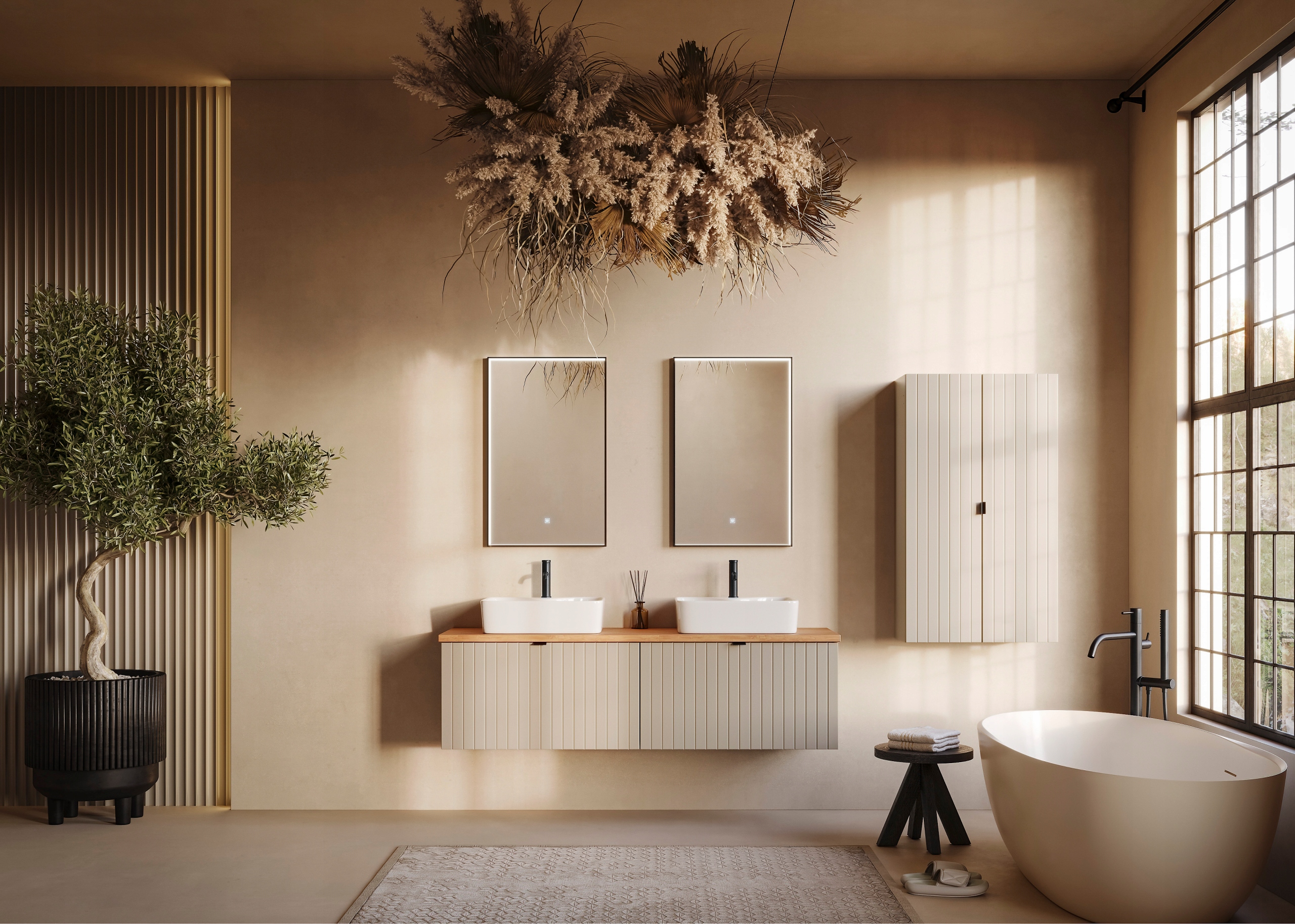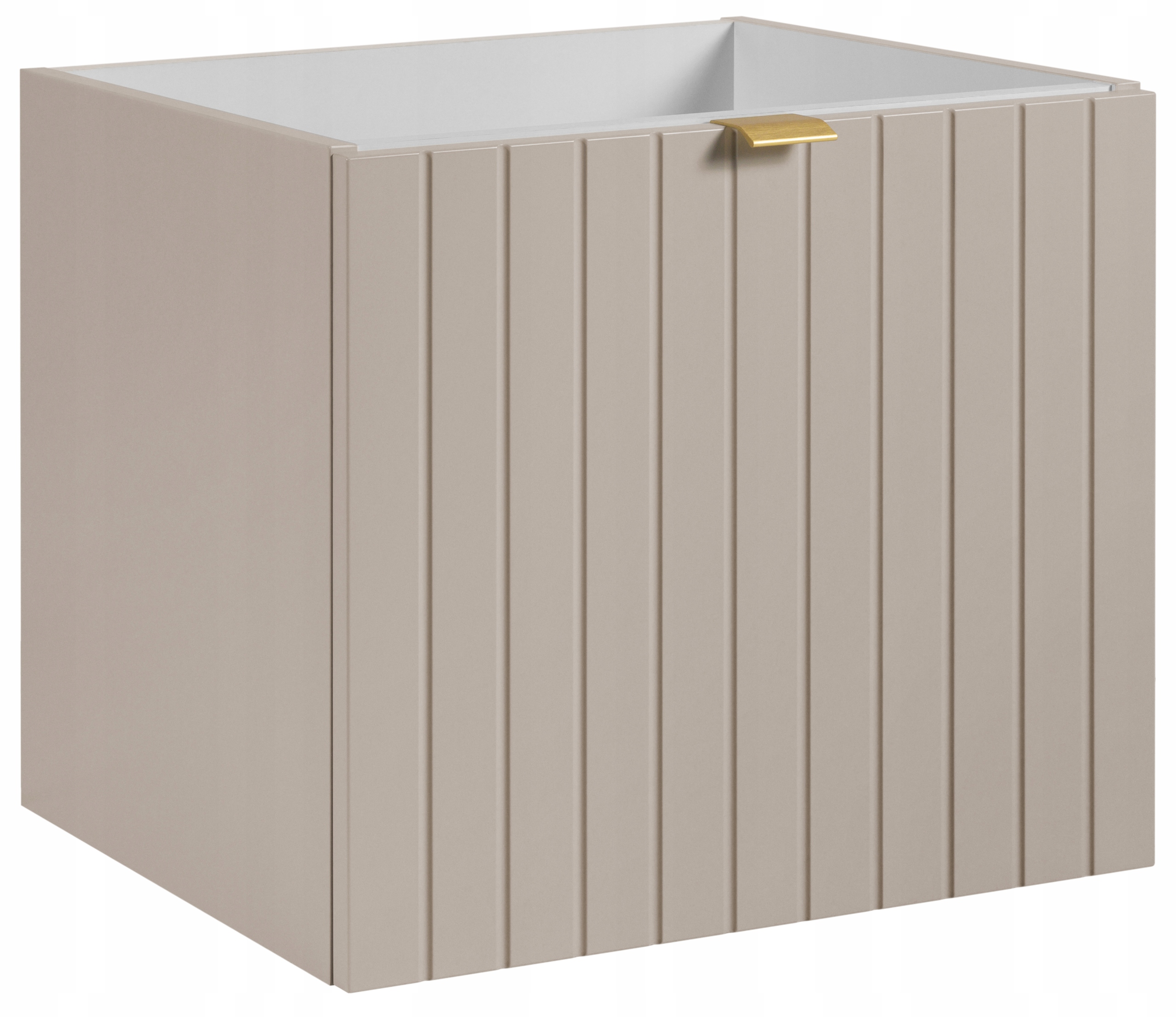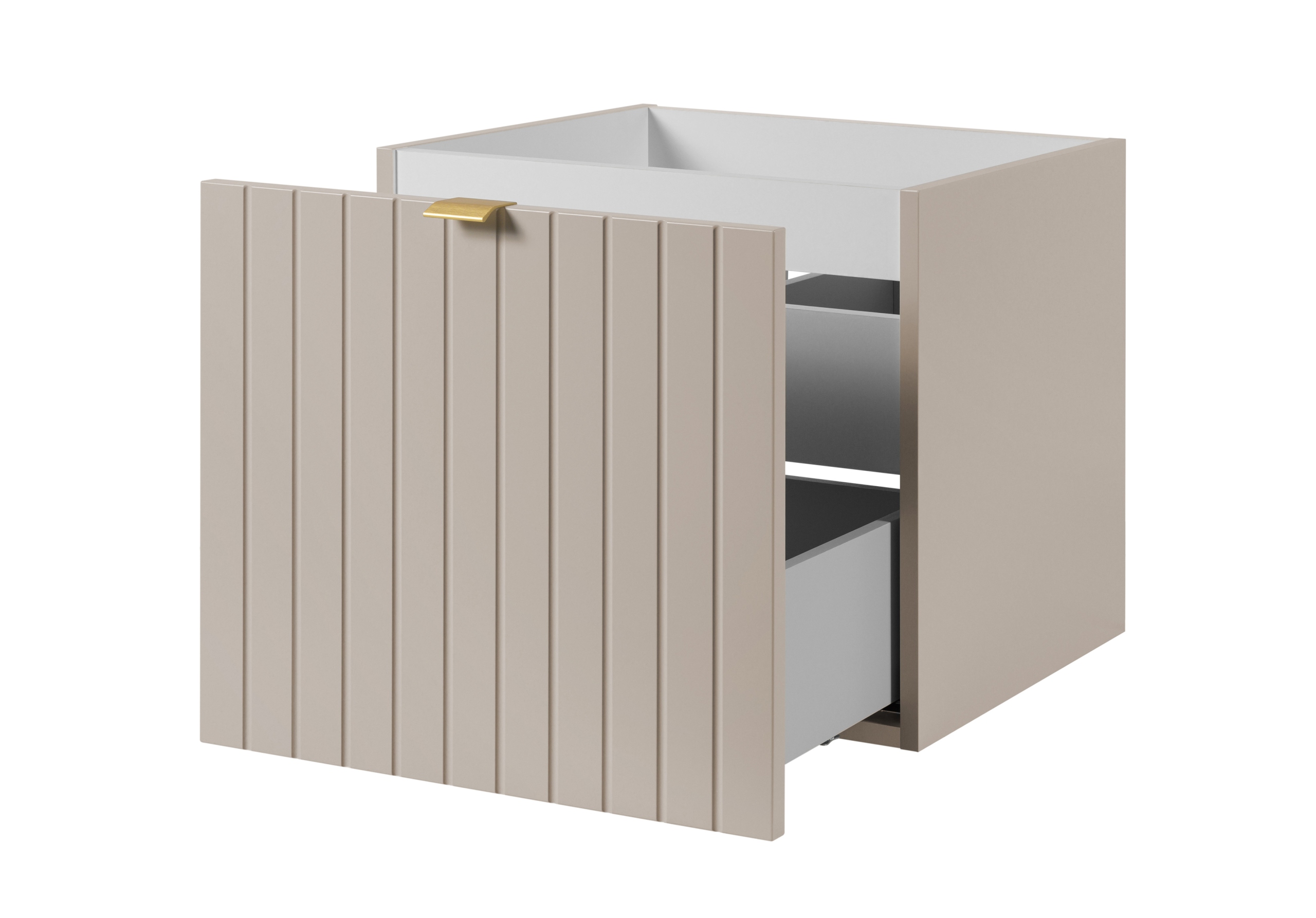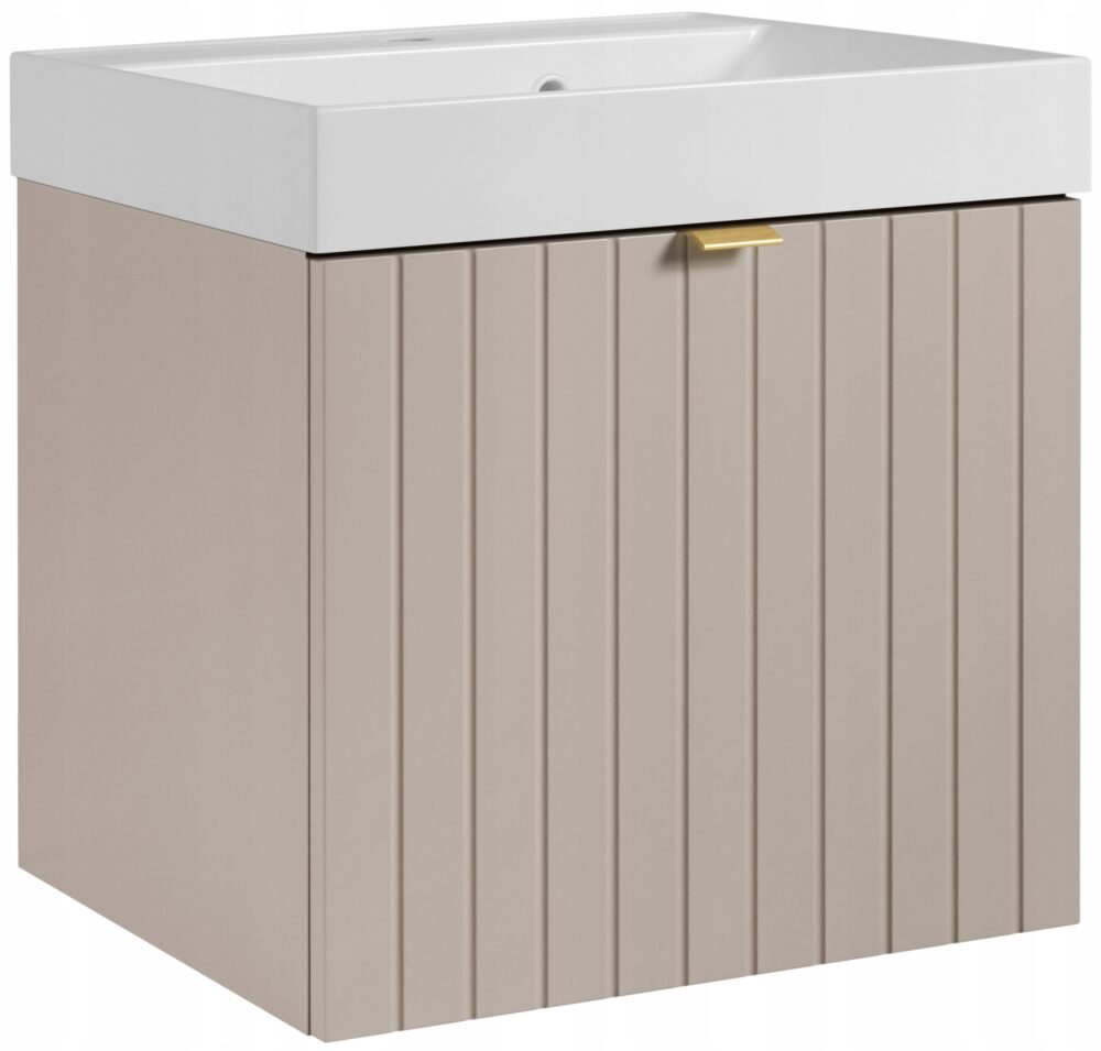 Kolekcja HARMO łączy elegancki design z praktycznymi rozwiązaniami, które doskonale komponują się z nowoczesnymi łazienkami. Pionowo frezowane fronty z płyty MDF w kaszmirowym półmacie podkreślają subtelny styl mebla, a wisząca konstrukcja nadaje lekkości i ułatwia sprzątanie. Szafka wyposażona jest w pojemną szufladę zewnętrzną na prowadnicach Hettich Quadro z funkcją cichego domyku oraz dodatkową wewnętrzną szufladkę, która idealnie sprawdzi się do przechowywania drobnych akcesoriów. W zestawie znajdują się trzy warianty uchwytów: czarny, złoty i srebrny szczotkowany. Meble wyprodukowane w Polsce z wysokiej jakości materiałów.