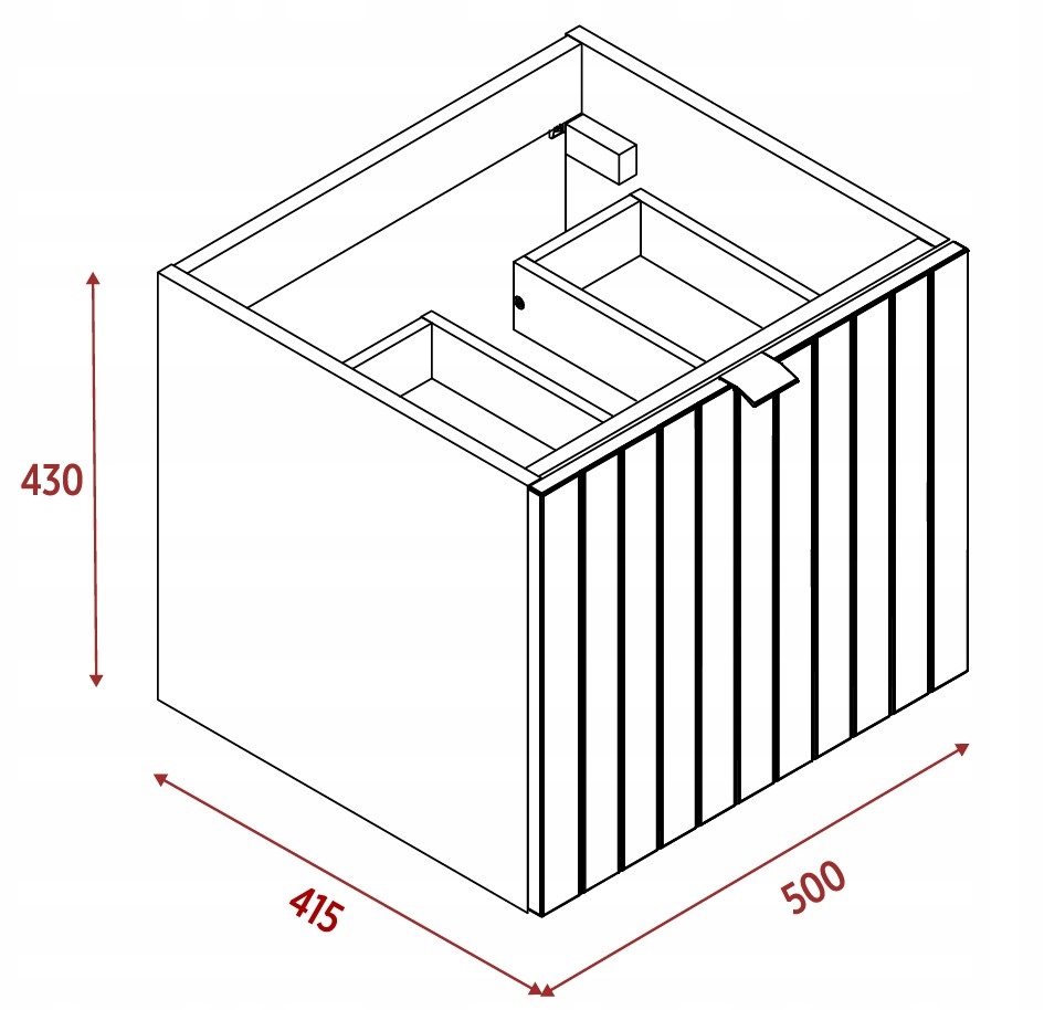 Szerokość – 50 cm, wysokość – 43 cm, głębokość – 41,5 cm. Korpus i front w kaszmirowym półmacie, lakierowane. Uchwyty metalowe w trzech wariantach kolorystycznych.