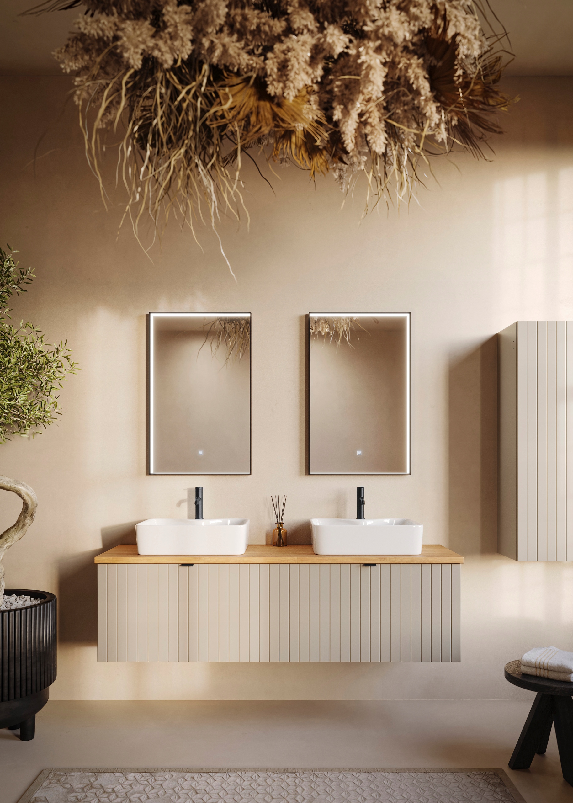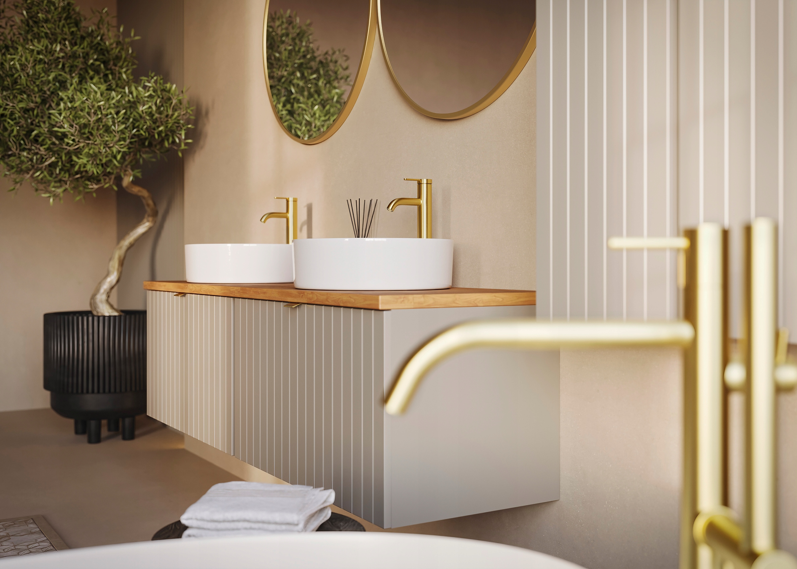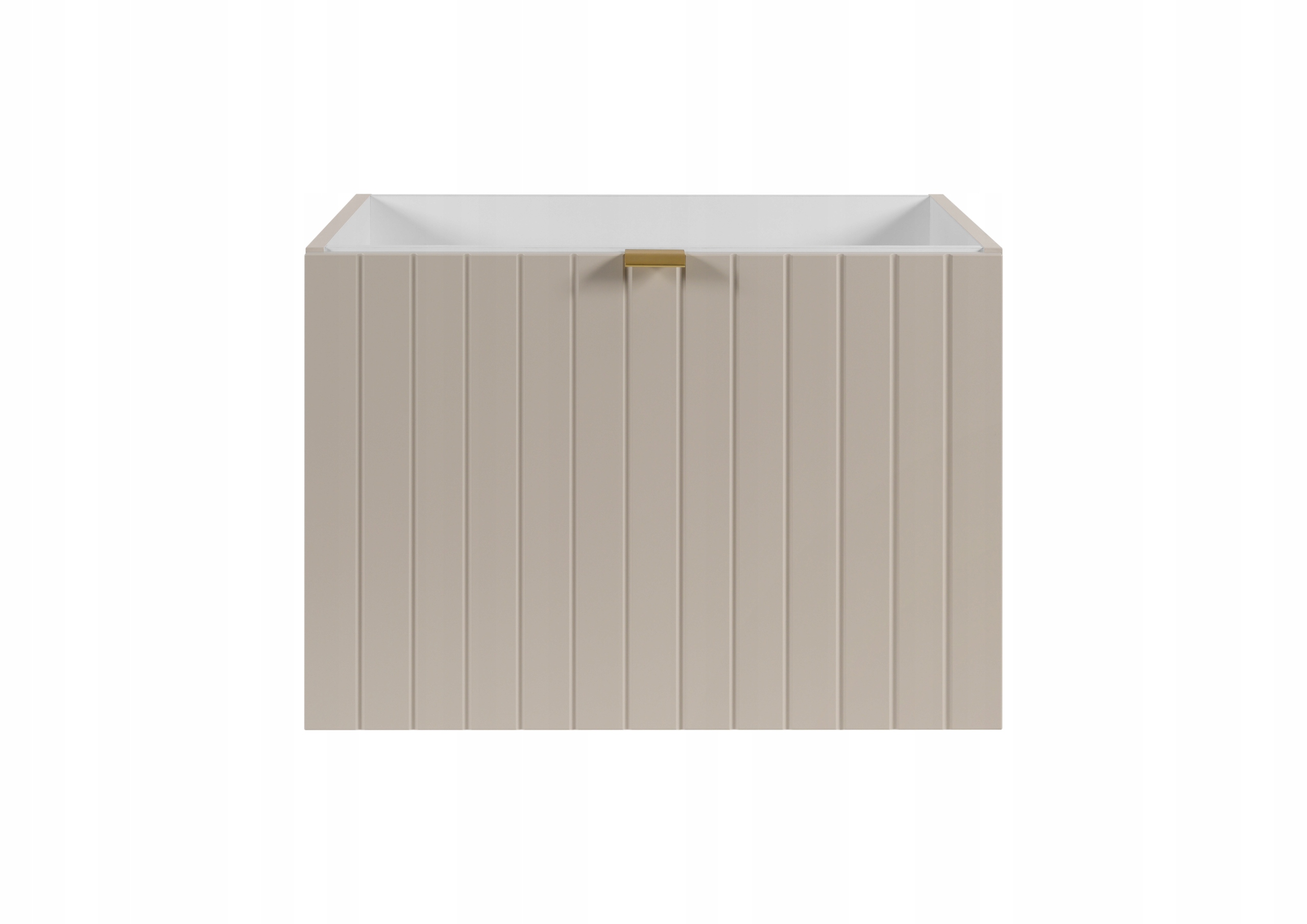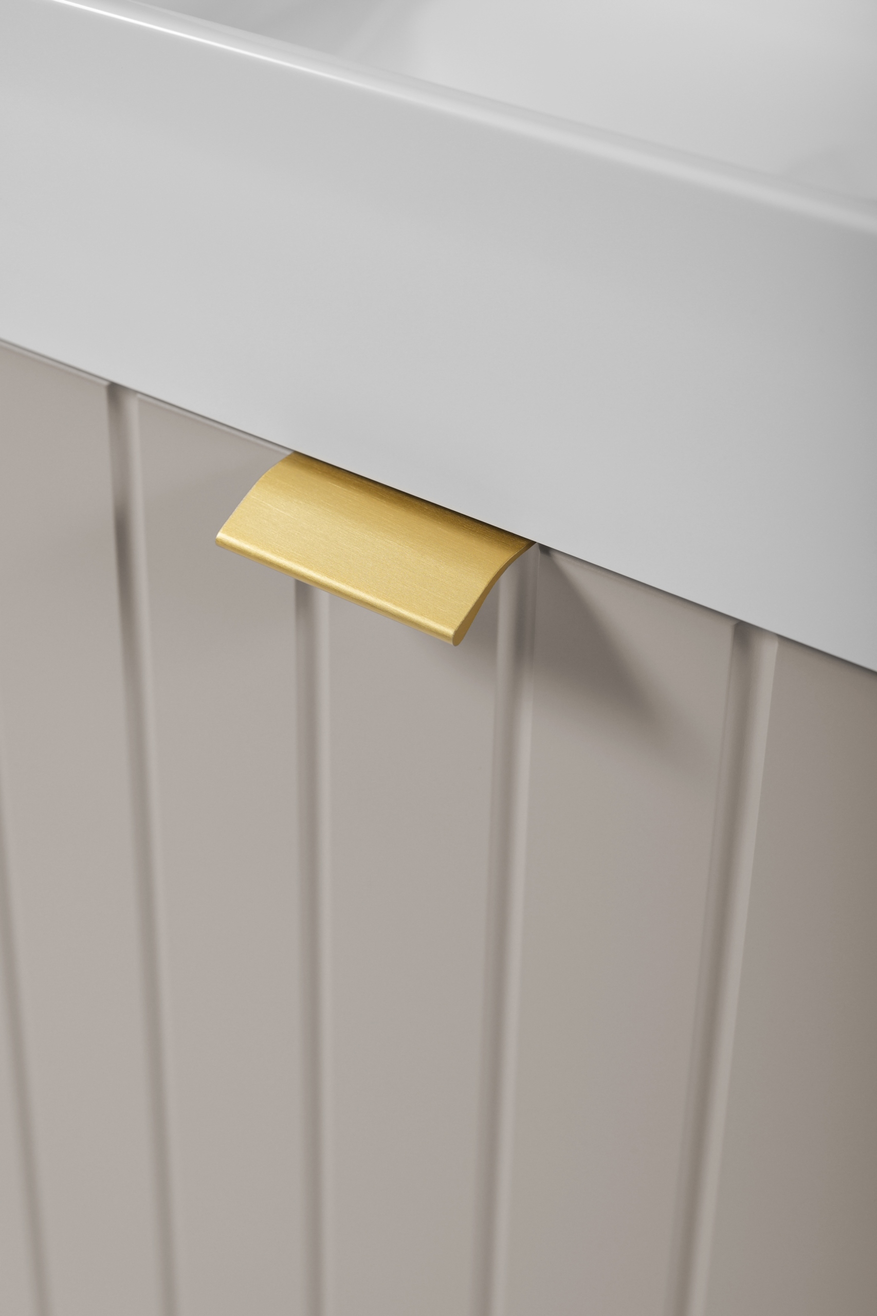 Kolekcja HARMO łączy elegancki design z funkcjonalnymi rozwiązaniami, które doskonale komponują się z nowoczesnymi łazienkami. Pionowo frezowane fronty z płyty MDF w kaszmirowym półmacie podkreślają subtelny i nowoczesny charakter mebla, a wisząca konstrukcja nadaje lekkości i ułatwia sprzątanie. Szafka wyposażona jest w pojemną szufladę zewnętrzną na prowadnicach Hettich Quadro z funkcją cichego domyku oraz dodatkową wewnętrzną szufladkę, która idealnie sprawdzi się do przechowywania drobnych akcesoriów. W zestawie znajdują się trzy warianty uchwytów: czarny, złoty i srebrny szczotkowany. Meble wyprodukowane w Polsce z wysokiej jakości materiałów.