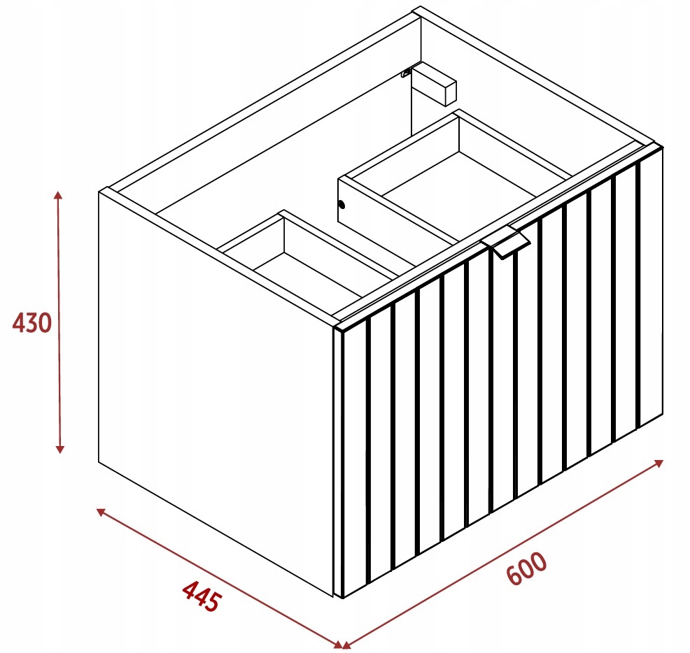 Szerokość – 60 cm, wysokość – 43 cm, głębokość – 44,5 cm. Korpus i front w kaszmirowym półmacie, lakierowane. Uchwyty metalowe w trzech wariantach kolorystycznych.