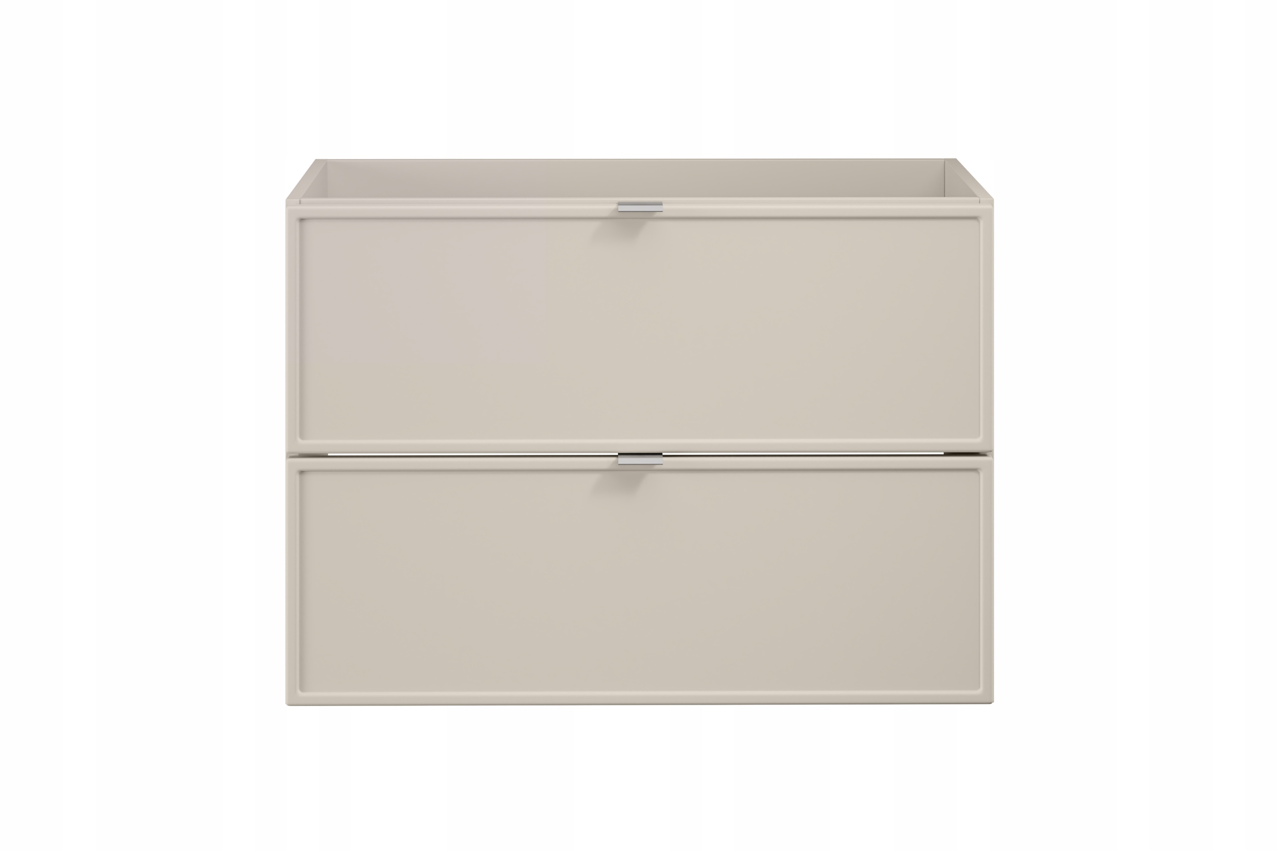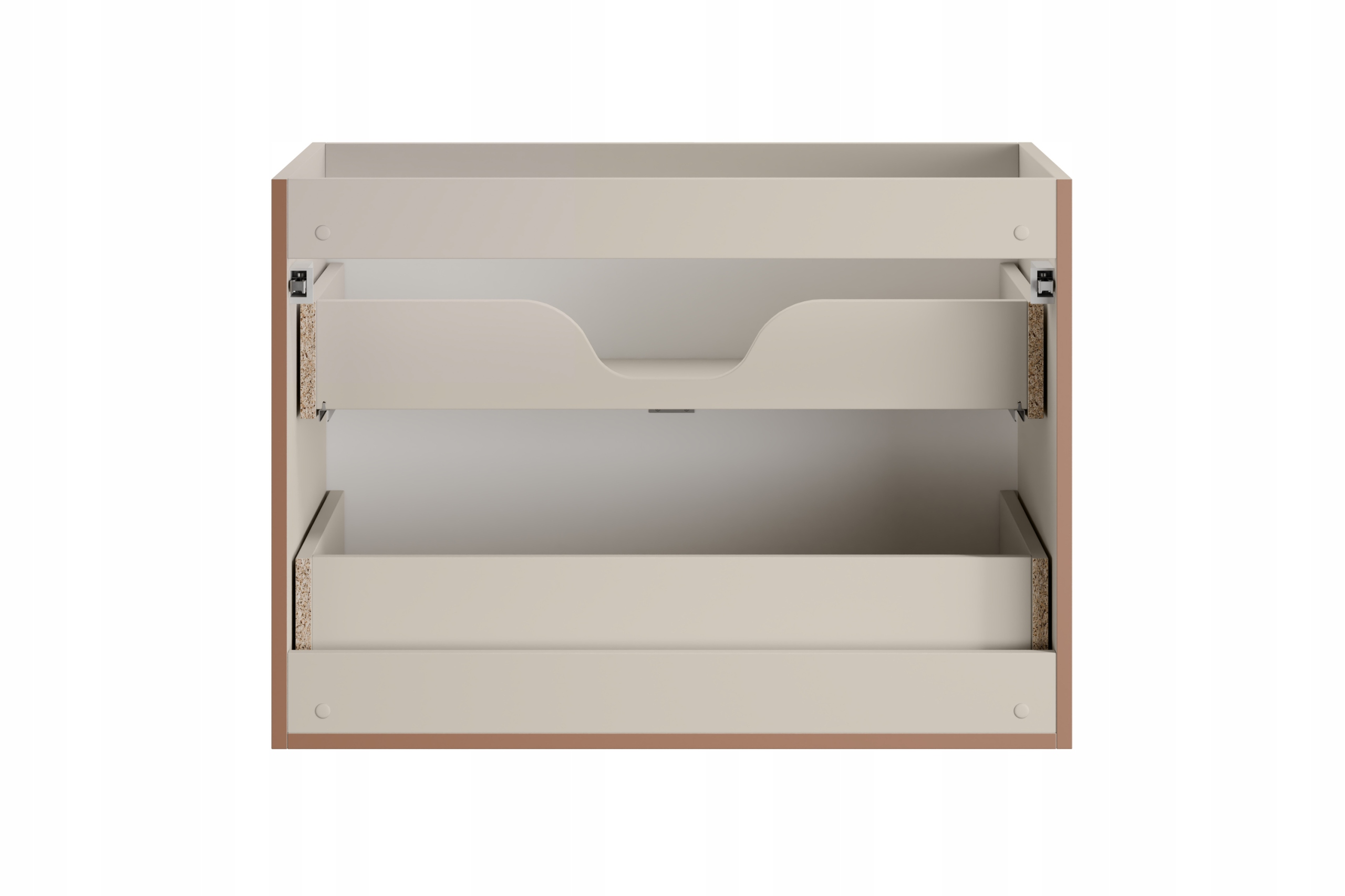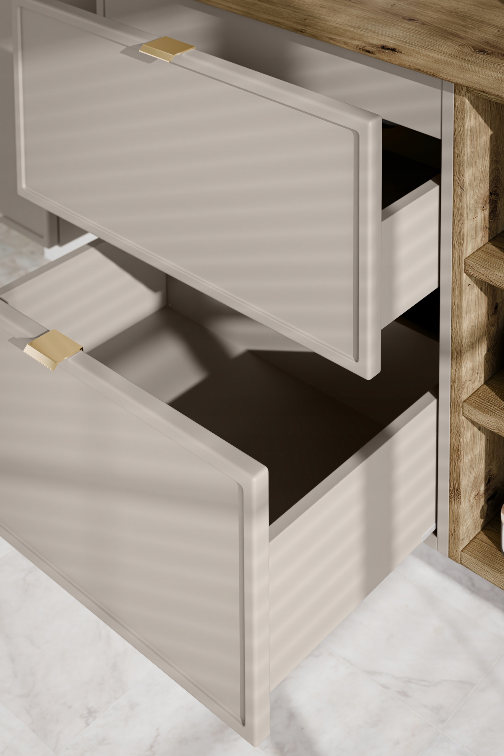 Kolekcja Bella Cashmere to połączenie elegancji, funkcjonalności i ponadczasowego stylu. Szafka łazienkowa o szerokości 80 cm zachwyca kaszmirowym odcieniem oraz subtelnymi frezowaniami na frontach, które tworzą ozdobne ramki. Dwie praktyczne szuflady zapewniają wygodny dostęp do codziennych akcesoriów i kosmetyków, pomagając utrzymać porządek w przestrzeni łazienkowej. Prosty, geometryczny design idealnie wpisuje się w nowoczesne oraz klasyczne wnętrza. W zestawie znajdują się trzy warianty uchwytów: złoty, chromowany oraz czarny – dzięki czemu można dopasować mebel do indywidualnych preferencji. Całość wykonana z wytrzymałych materiałów: korpus z płyty laminowanej, fronty z frezowanego MDF. Szafka została wyprodukowana w Polsce, z troską o detale i jakość wykończenia.