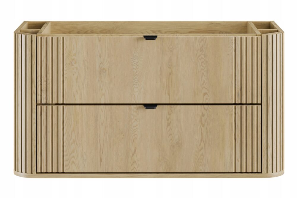 Kolekcja Ovalia Dąb Cremona to połączenie naturalnego uroku drewna z nowoczesnym wzornictwem. Szafka o szerokości 100 cm zachwyca zaokrąglonymi narożnikami oraz pionowym ryflowaniem na frontach, które dodają jej unikalnego charakteru. Ciepły odcień dębu wprowadza do wnętrza przytulność, a czarne, metalowe uchwyty nadają całości nowoczesnego stylu. W komplecie znajduje się niska, meblowa umywalka PURE wykonana z trwałego konglomeratu w białym połysku – estetyczna i funkcjonalna, idealnie dopasowana do bryły szafki. Dwie pojemne szuflady ułatwiają codzienną organizację, a całość prezentuje się niezwykle elegancko. Produkt wykonany w Polsce z materiałów wysokiej jakości, z dbałością o każdy detal.
