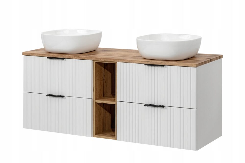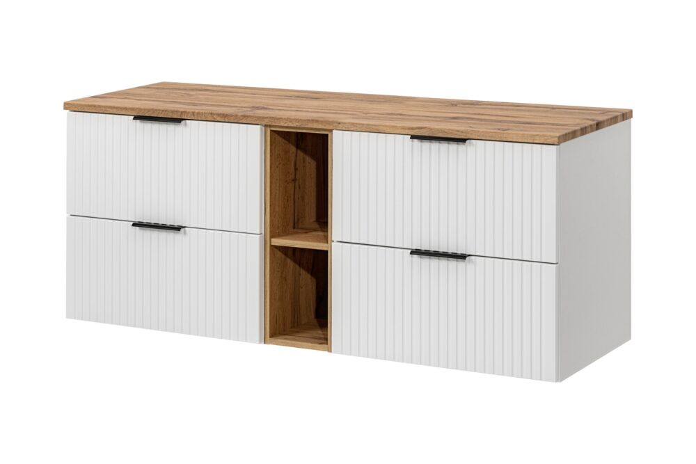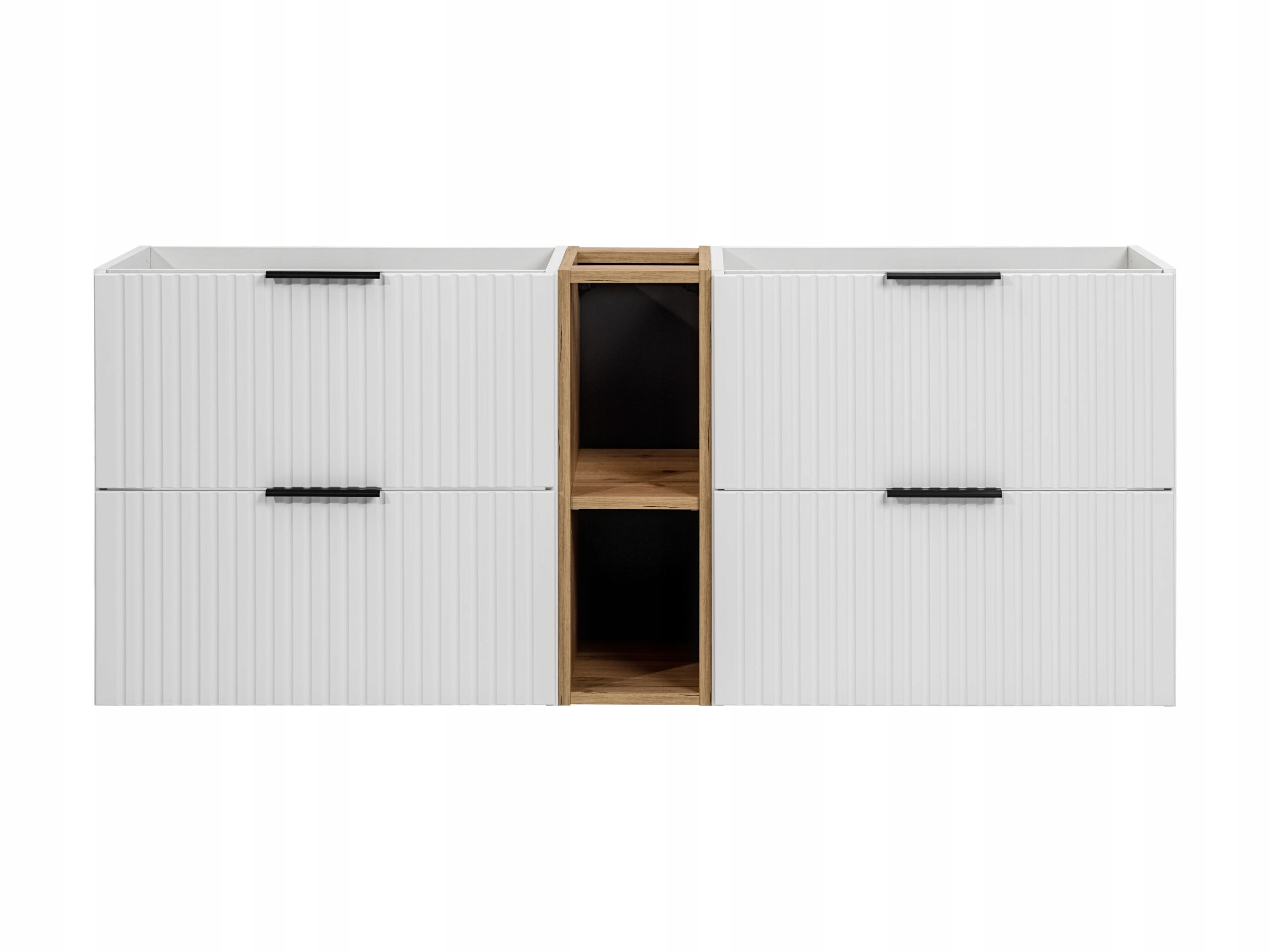 Szafka łazienkowa ADEL WHITE to stylowa propozycja dla osób ceniących nowoczesny design i funkcjonalność. Dzięki ryflowanym frontom w białym macie oraz eleganckiemu regałowi w kolorze dąb Wotan, zestaw tworzy harmonijne połączenie, które idealnie wpisuje się zarówno w minimalistyczne, jak i klasyczne wnętrza.