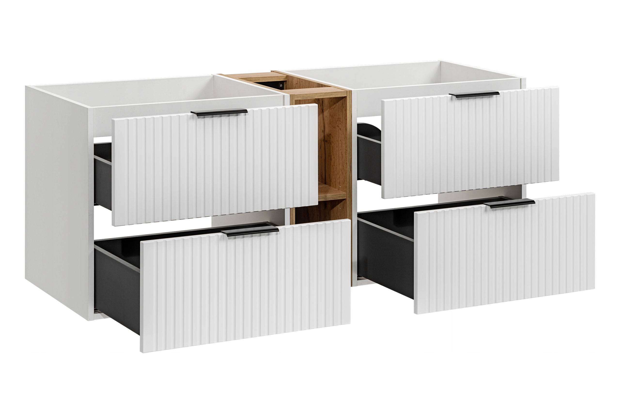 Wyposażona w cztery szuflady z funkcją SOFT CLOSE, szafka zapewnia ciche i komfortowe użytkowanie, a wybór trzech wariantów kolorystycznych uchwytów – czarny, chrom, złoty – pozwala na pełną personalizację wyglądu. Konstrukcja wisząca oraz dodatkowy regał czynią ten zestaw doskonałym rozwiązaniem dla większych łazienek, zapewniając przestrzeń i styl w codziennym użytkowaniu.