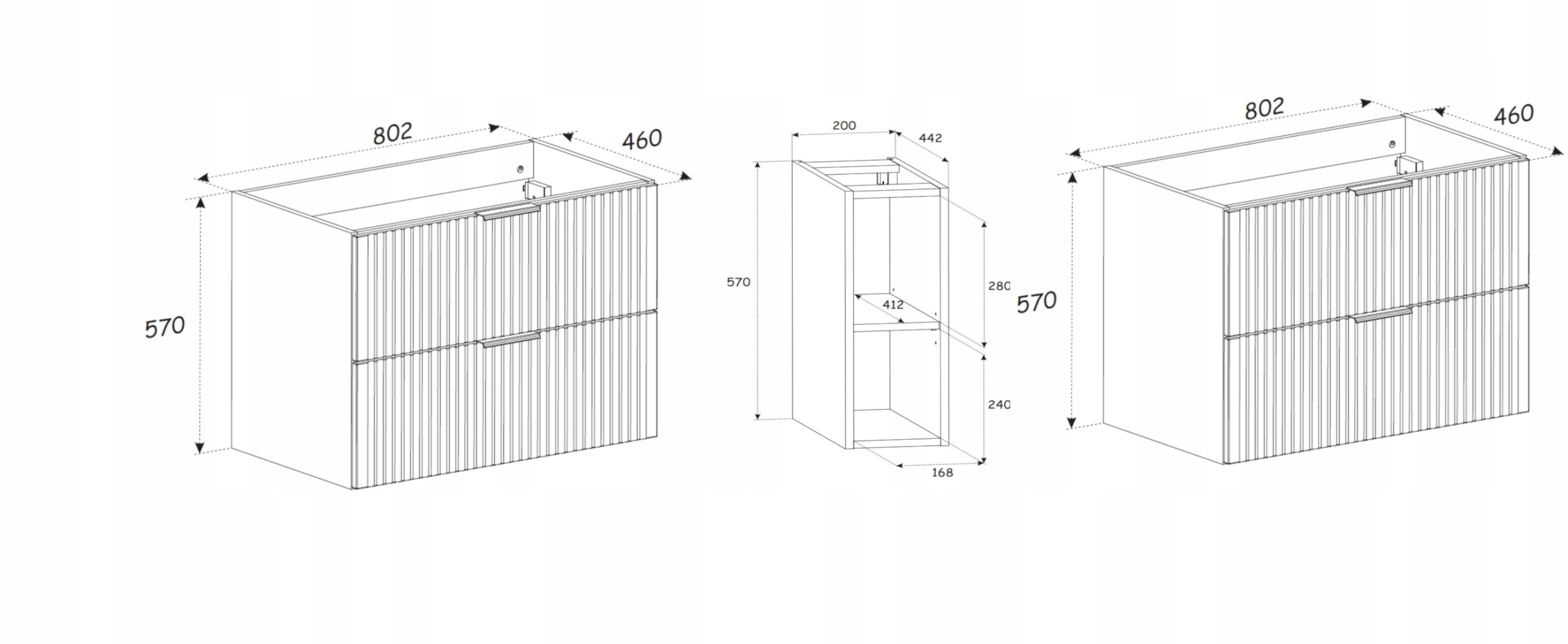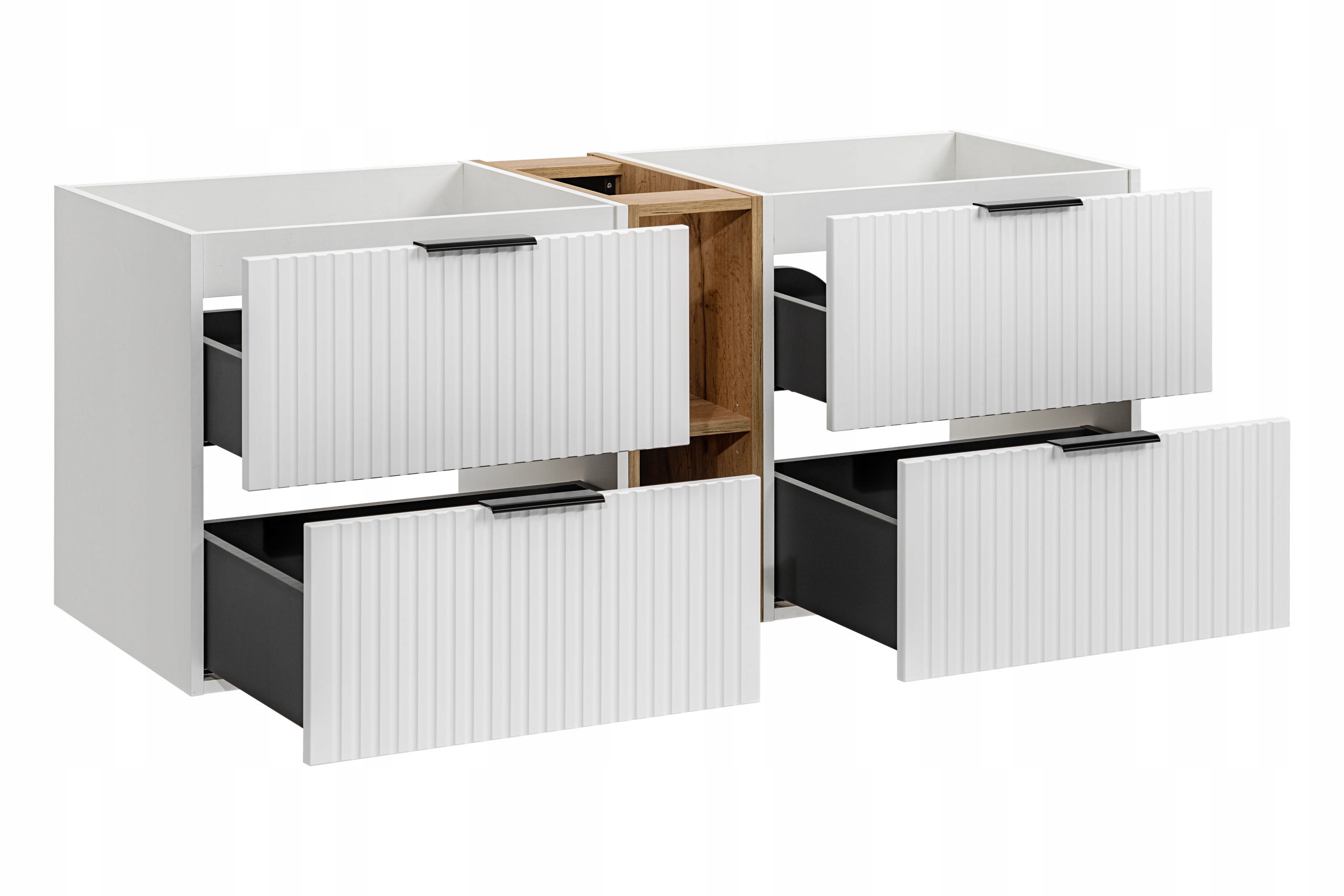 Zestaw posiada cztery pojemne szuflady z systemem cichego domyku, dzięki czemu zapewnia wygodne miejsce do przechowywania kosmetyków, ręczników i akcesoriów łazienkowych. Górne szuflady są przygotowane pod syfon — posiadają specjalne wycięcie na tylnej ściance, co ułatwia montaż umywalek nablatowych.