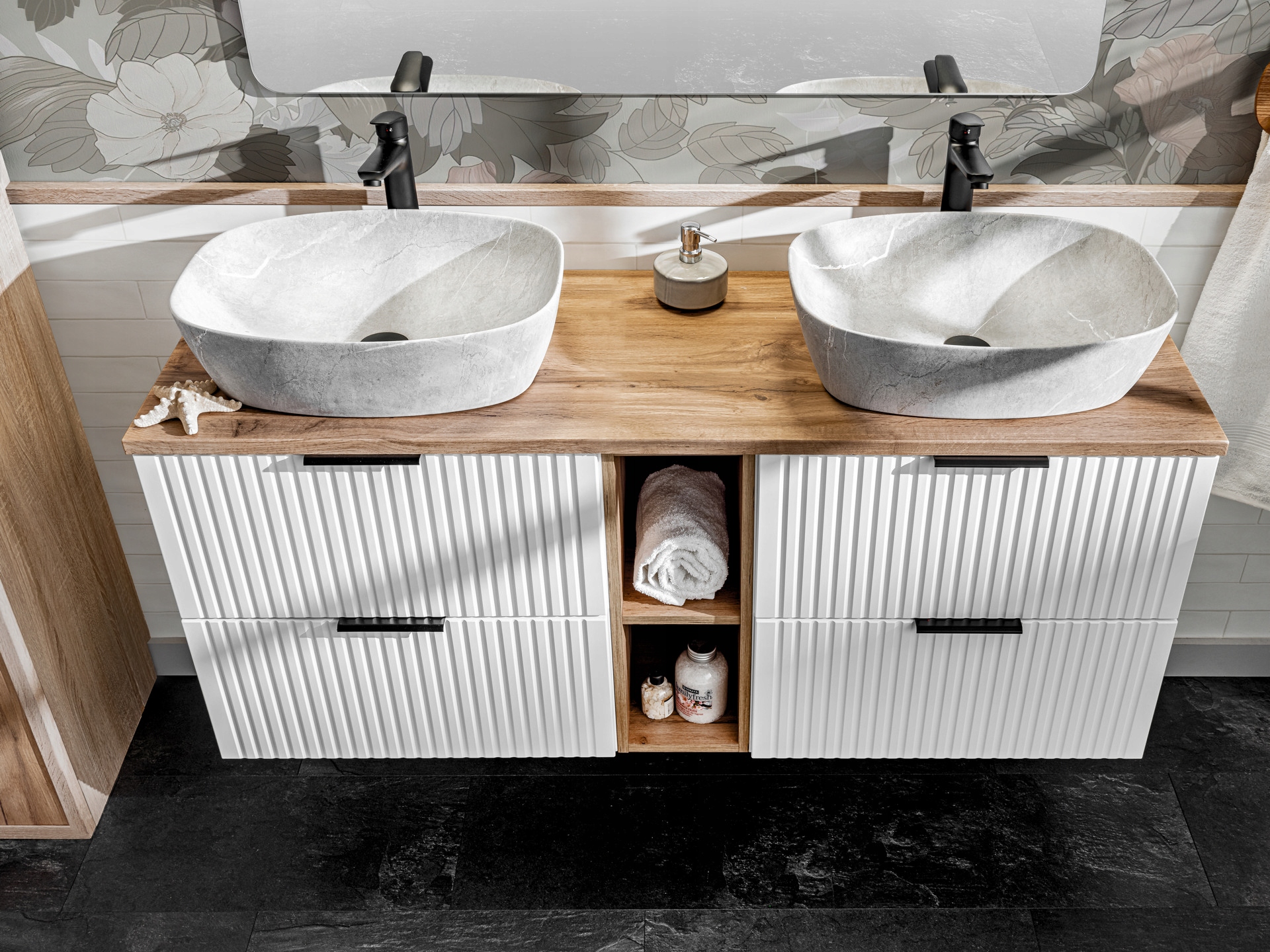 Szafki wyróżniają się ryflowanymi frontami, które nadają całości modny i dekoracyjny charakter. Biała kolorystyka rozjaśnia wnętrze, a regał w odcieniu dąb wotan ociepla aranżację i wprowadza naturalny akcent. To połączenie świetnie sprawdzi się w nowoczesnych, skandynawskich, minimalistycznych i eleganckich łazienkach.