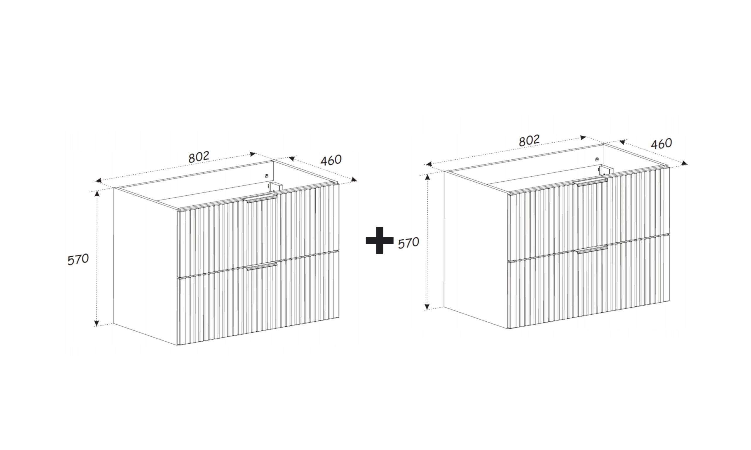 Dzięki wiszącej konstrukcji meble prezentują się lekko i nowocześnie, a jednocześnie ułatwiają utrzymanie czystości w łazience. Dwie szafki tworzą szeroki zestaw o łącznej szerokości 160 cm, zapewniając dużą przestrzeń do przechowywania.