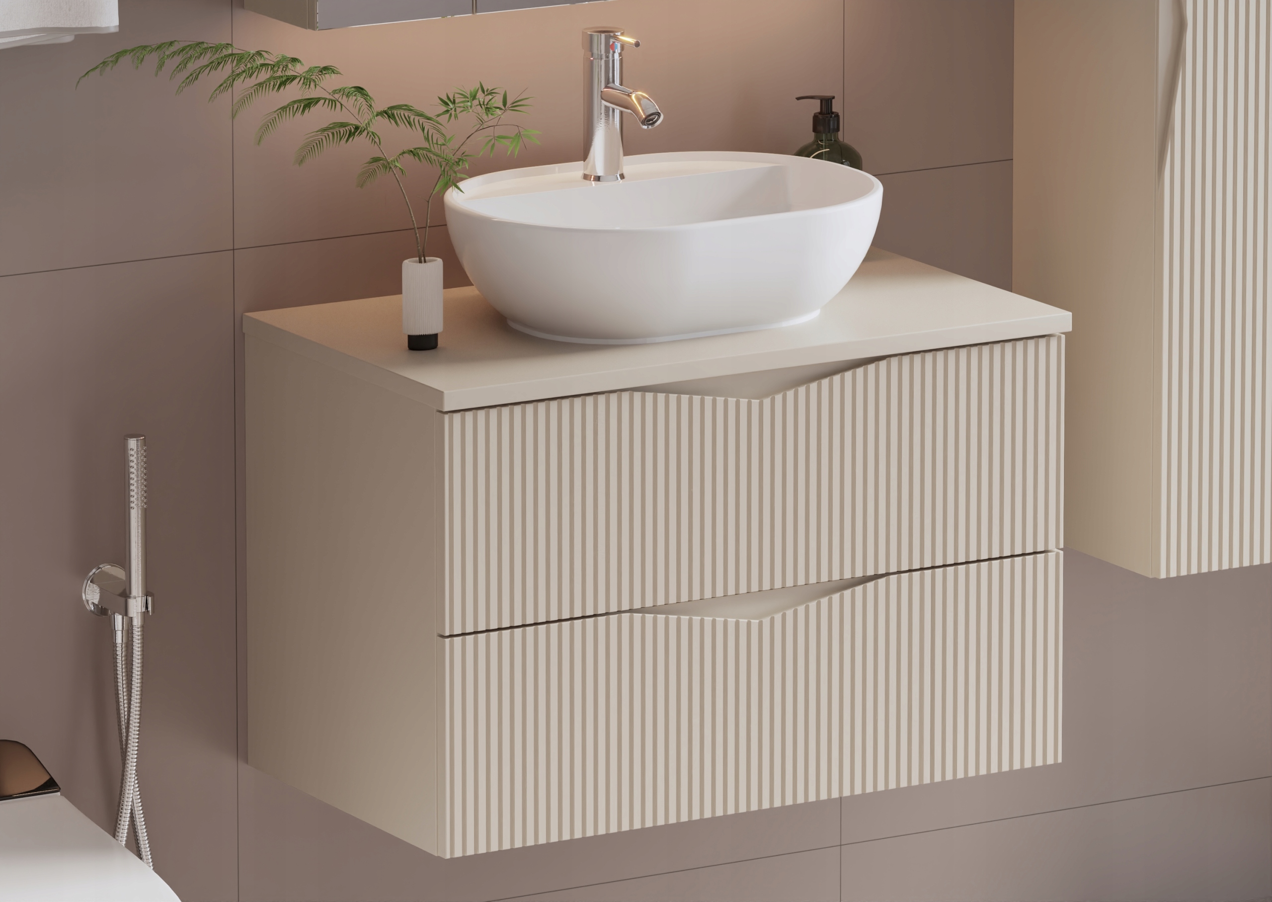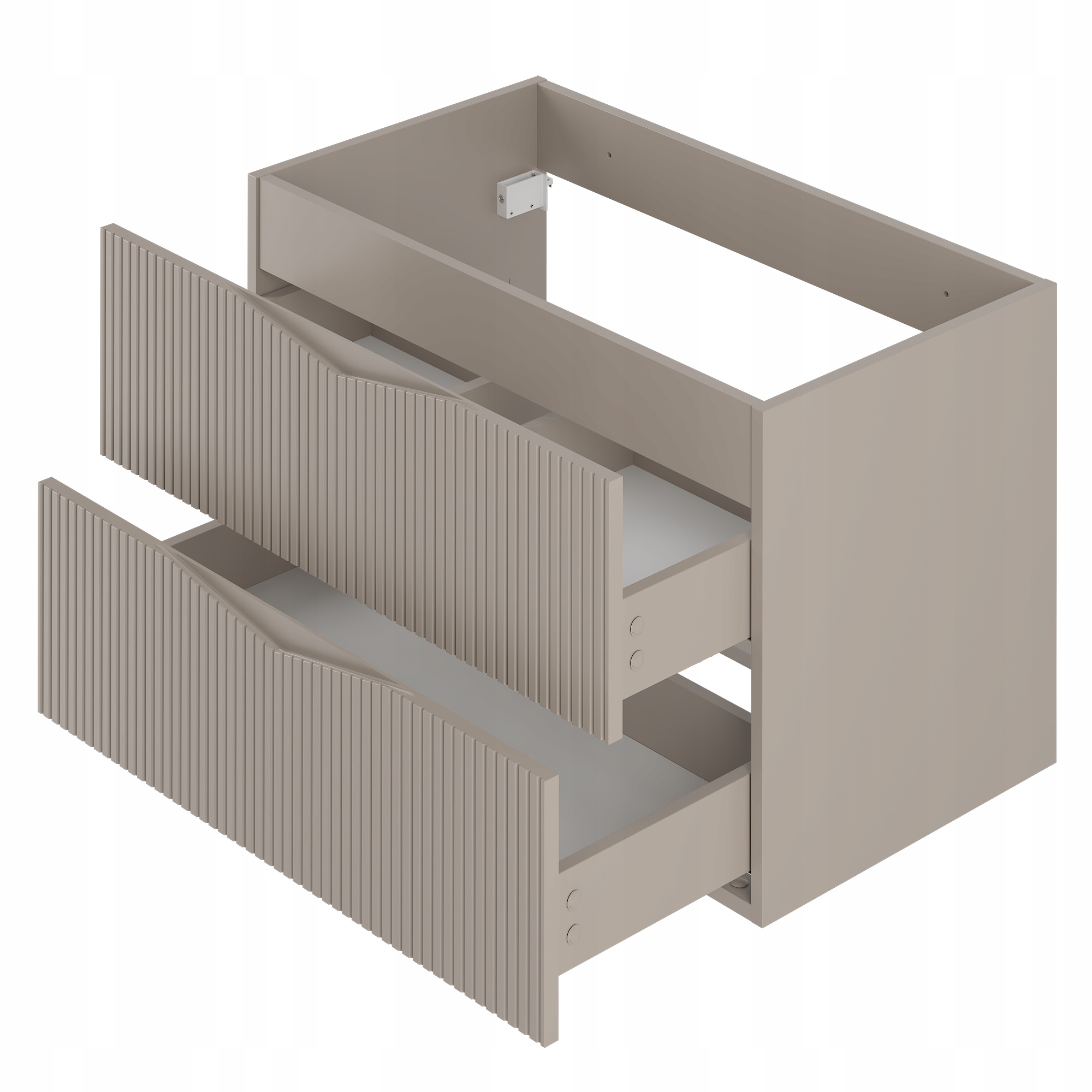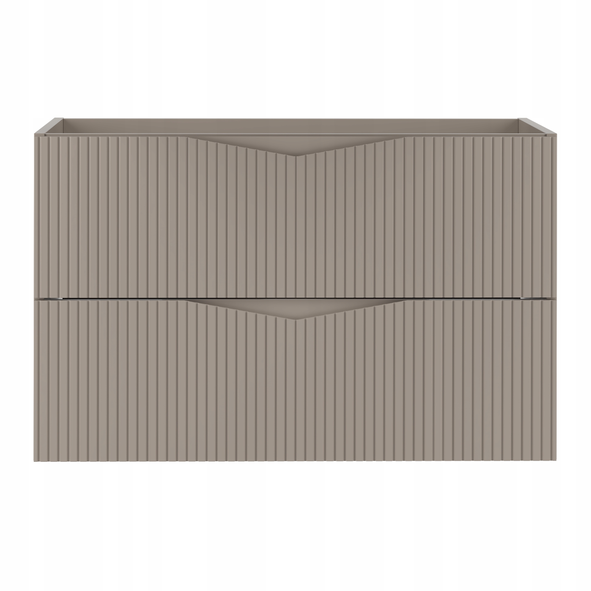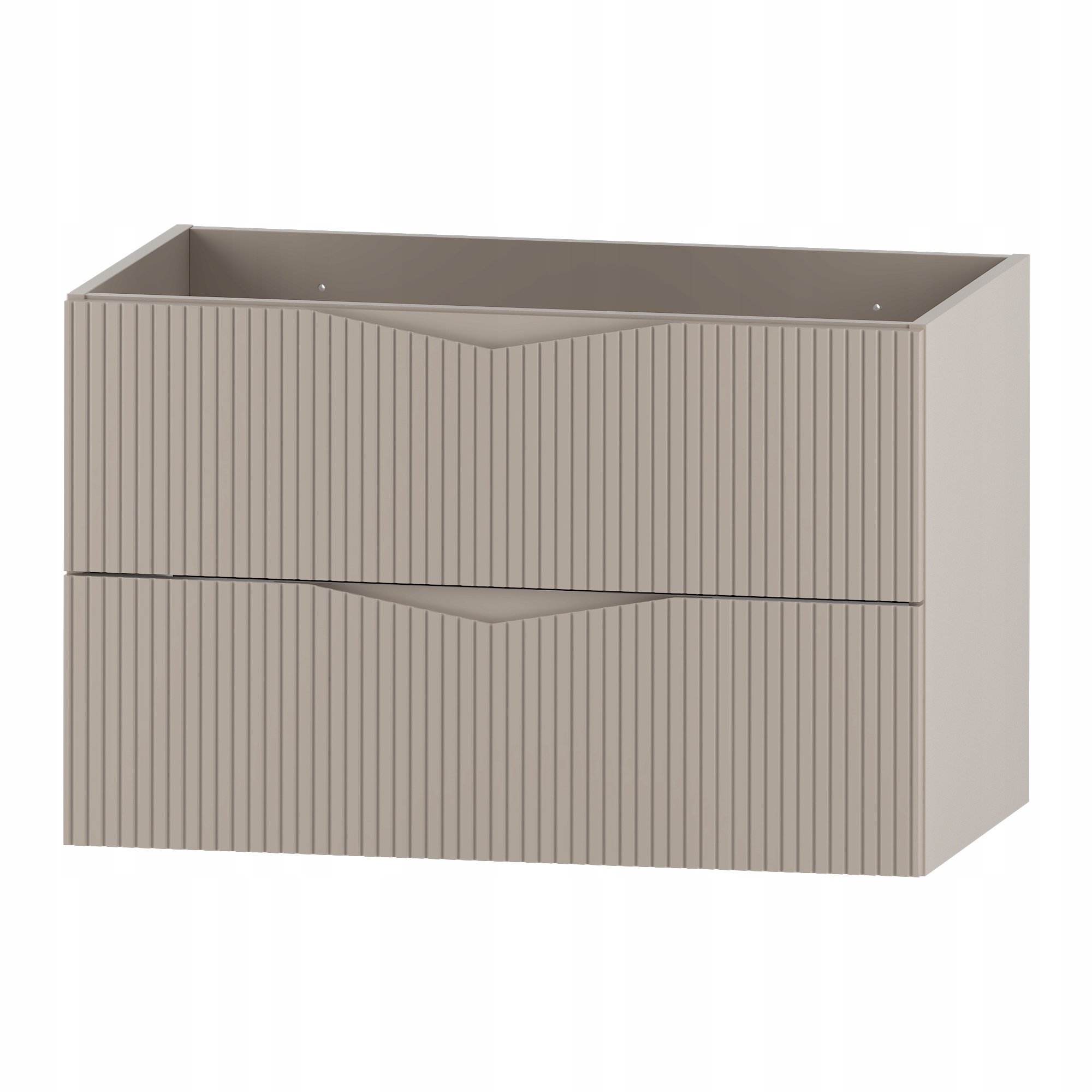 Szafka łazienkowa CLEO o szerokości 80 cm, wysokości 50 cm i głębokości 45,8 cm w kolorze beż piaskowy to eleganckie połączenie subtelnej estetyki i nowoczesnego wzornictwa. Ryflowane fronty z płyty MDF o grubości 18 mm nadają całości wyjątkowego charakteru, a zintegrowany frezowany uchwyt podkreśla minimalistyczny styl i zapewnia wygodę codziennego użytkowania.