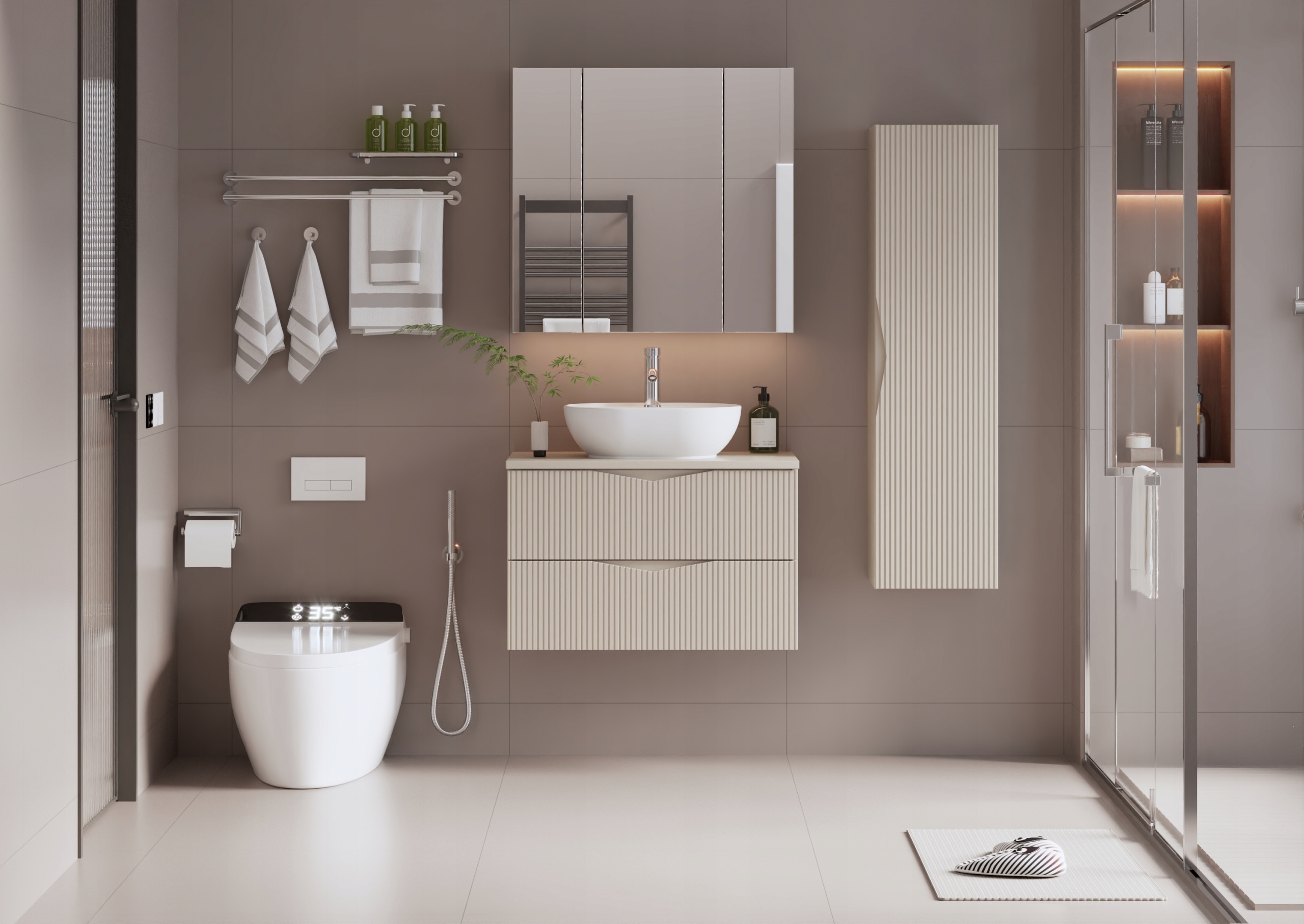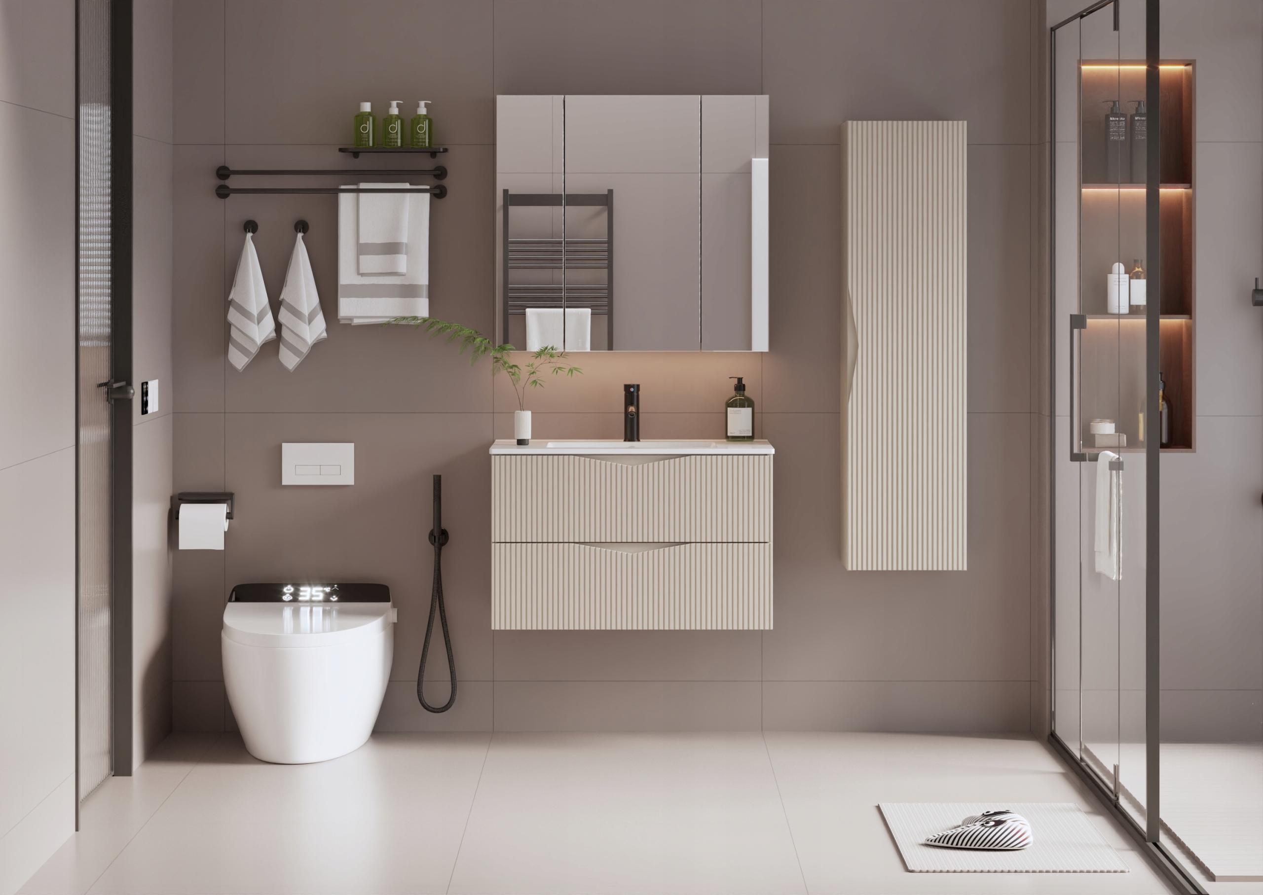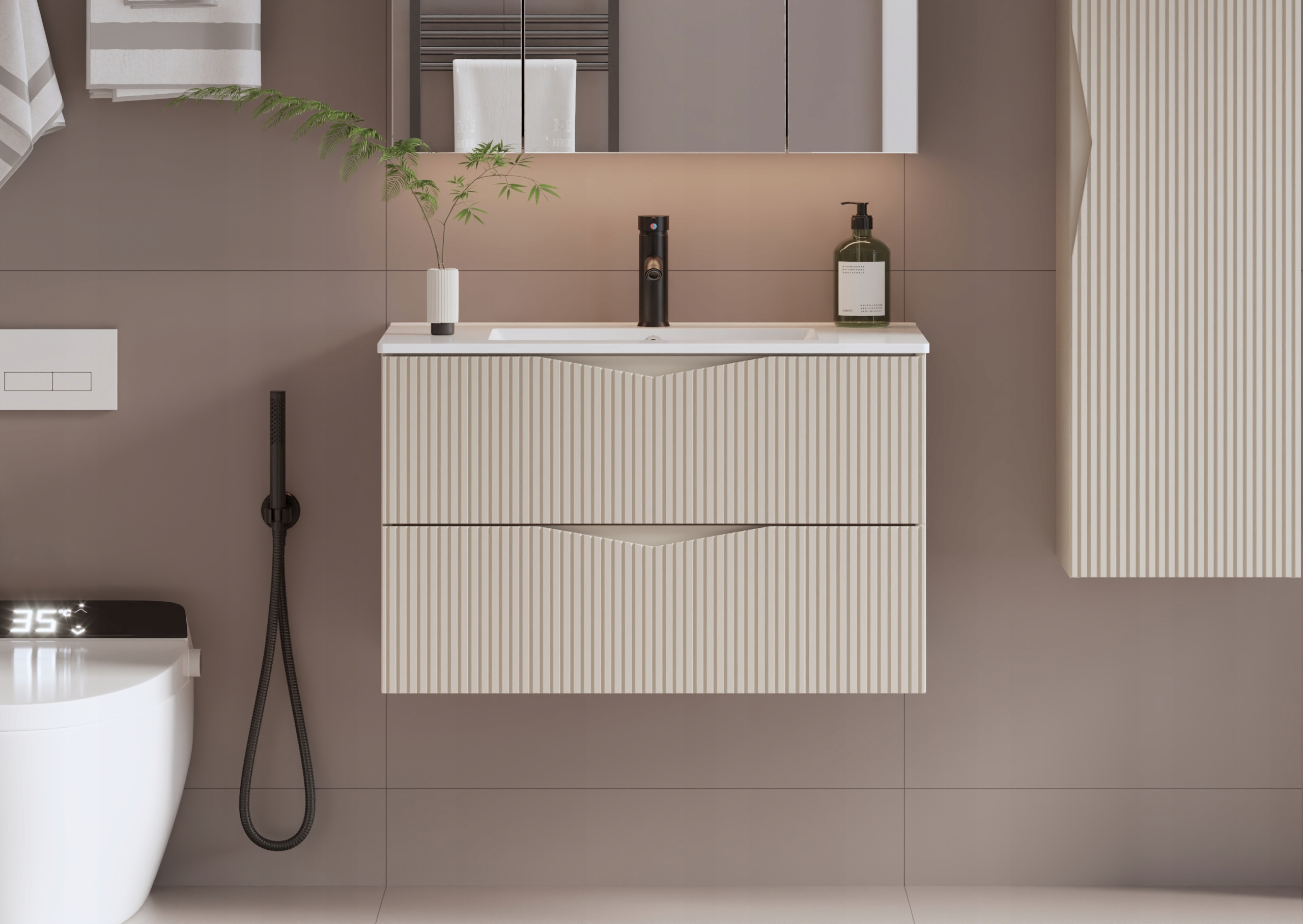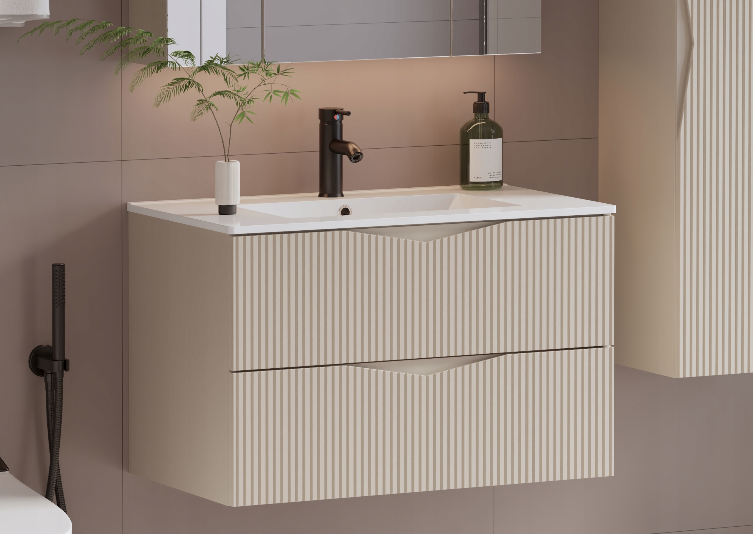 Szafka łazienkowa CLEO o szerokości 80 cm, wysokości 50 cm i głębokości 45,8 cm w kolorze beż piaskowy to eleganckie połączenie subtelnej estetyki i nowoczesnego wzornictwa. Ryflowane fronty z płyty MDF o grubości 18 mm nadają całości wyjątkowego charakteru, a zintegrowany frezowany uchwyt podkreśla minimalistyczny styl i zapewnia wygodę codziennego użytkowania.