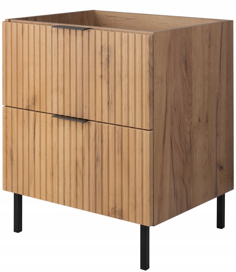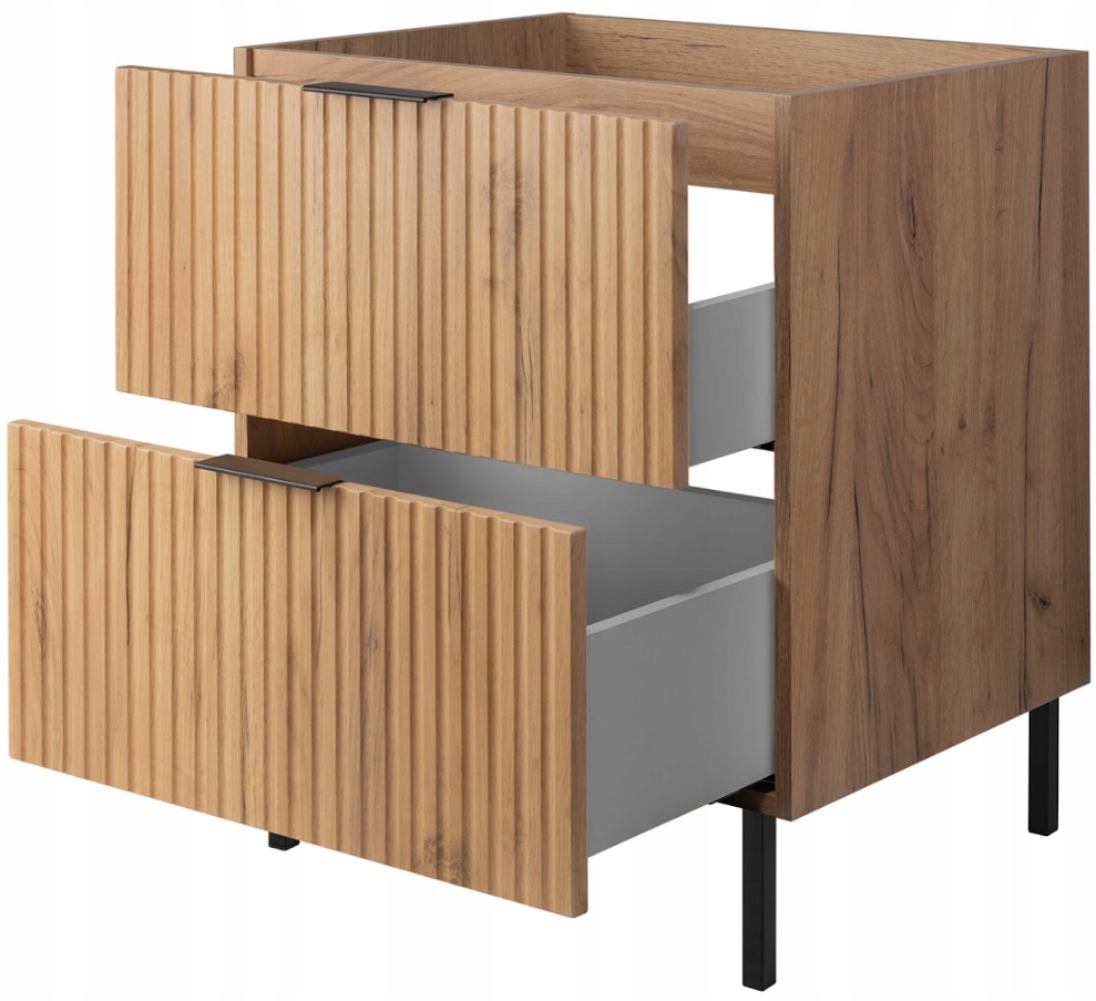 Szafka łazienkowa FLOW w dekorze dąb craft złoty to harmonijne połączenie naturalnej estetyki z nowoczesną funkcjonalnością. Ryflowane fronty w ciepłym, drewnianym wykończeniu nadają wnętrzu przytulny, elegancki charakter, a czarne, metalowe nóżki podkreślają nowoczesną linię mebla.