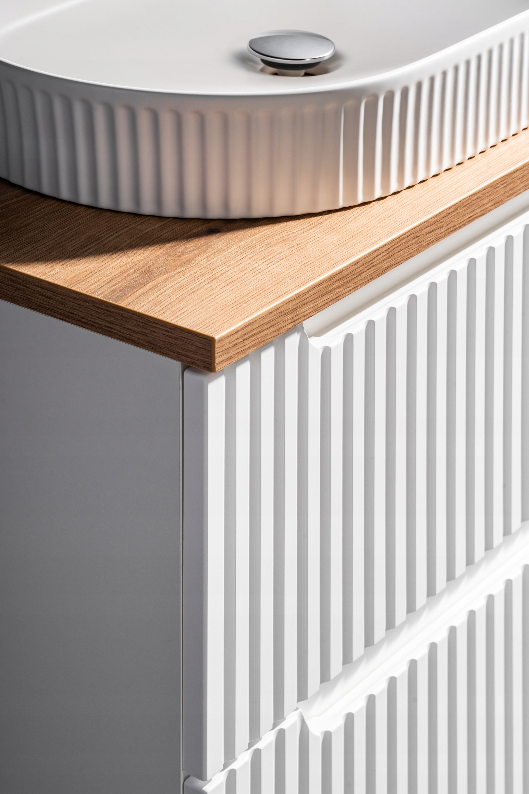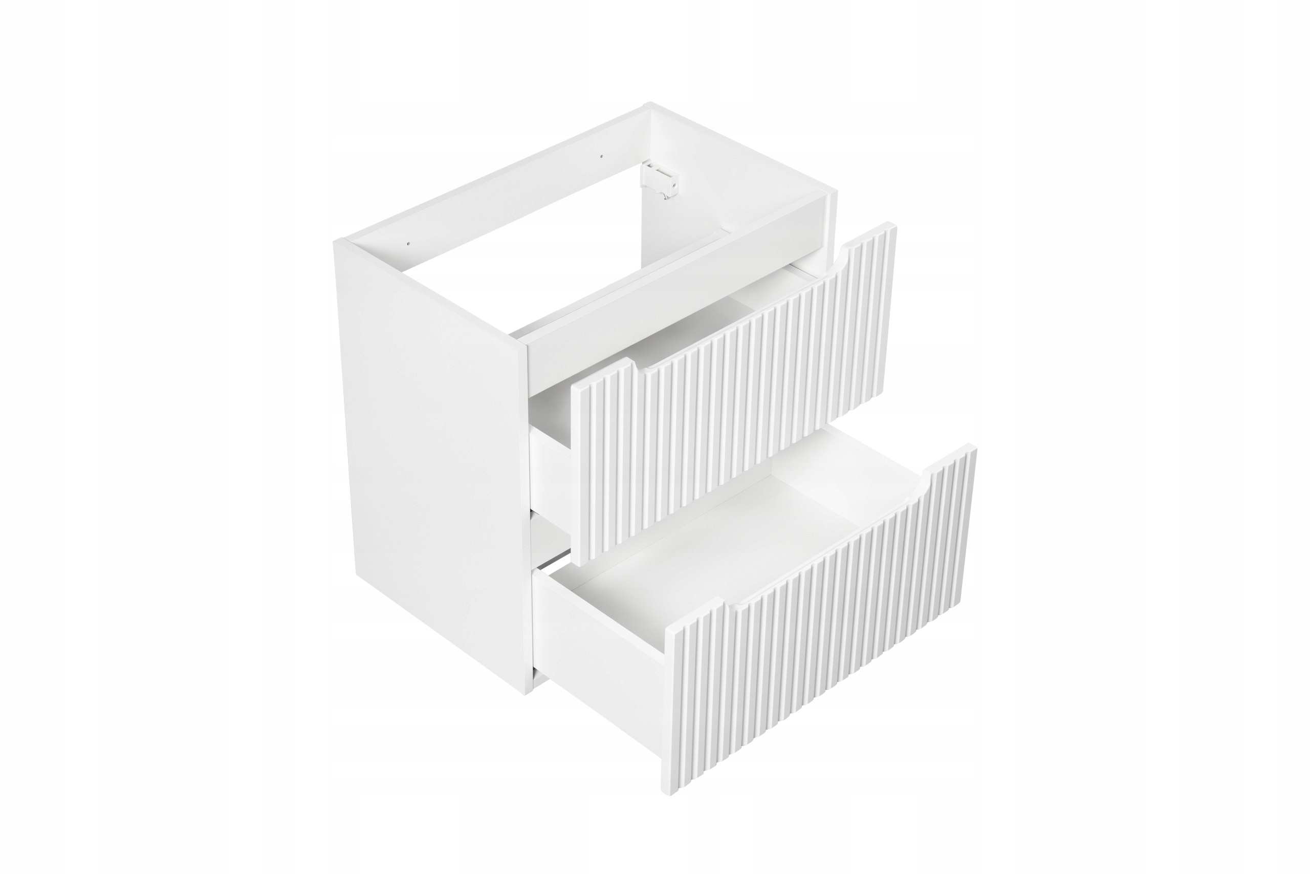 Kolekcja Nova White zachwyca minimalistycznym designem i praktycznością, idealnie pasując do współczesnych, dynamicznych wnętrz. Ryflowane fronty dodają szafce unikalnego charakteru, a geometryczne linie podkreślają nowoczesny styl, dzięki czemu szafka harmonizuje z wnętrzami o różnym charakterze.