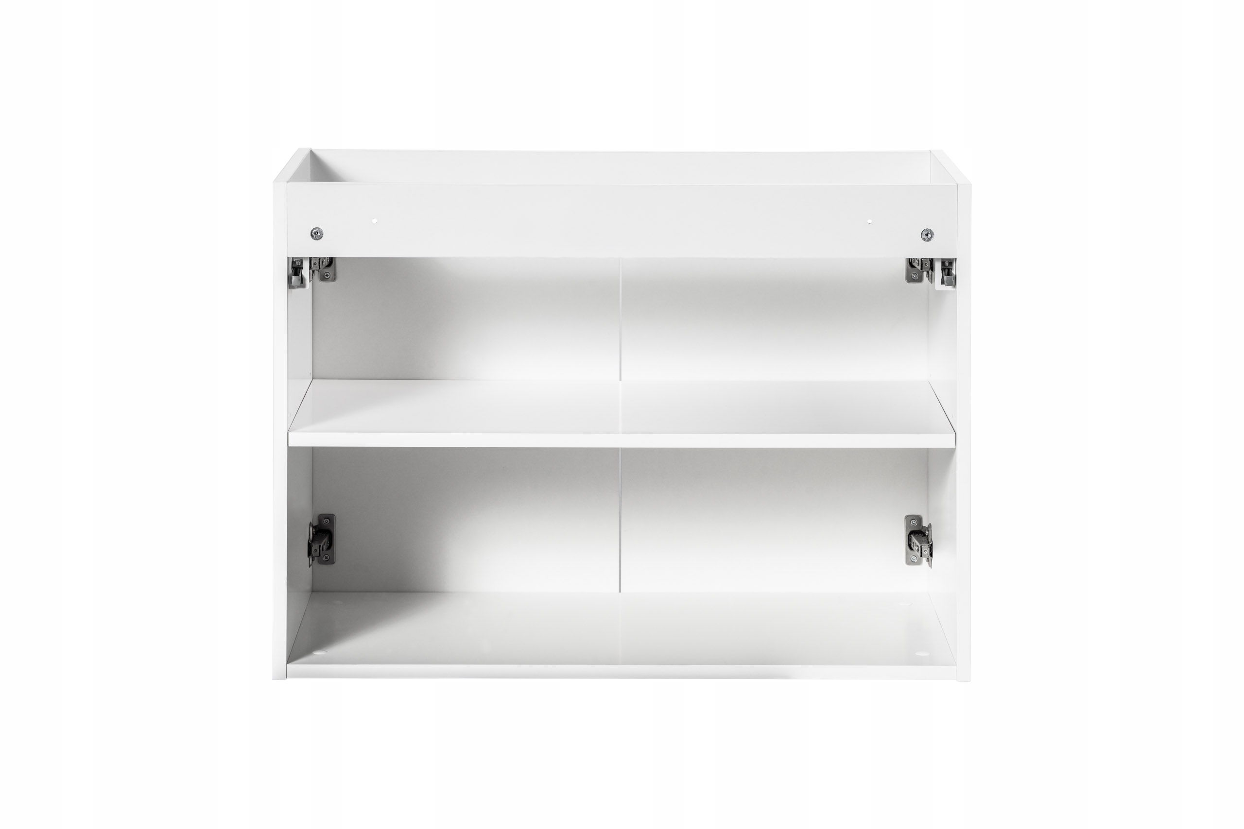 Model o szerokości 80 cm, wysokości 57 cm i głębokości 39 cm został wyposażony w dwoje drzwi z funkcją cichego domykania SOFT CLOSE. Wewnątrz znajduje się praktyczna półka, która umożliwia wygodne przechowywanie kosmetyków, ręczników i akcesoriów łazienkowych. Wisząca konstrukcja mebla dodaje lekkości wizualnej i ułatwia utrzymanie czystości, dzięki czemu idealnie sprawdzi się zarówno w małych, jak i przestronnych łazienkach.