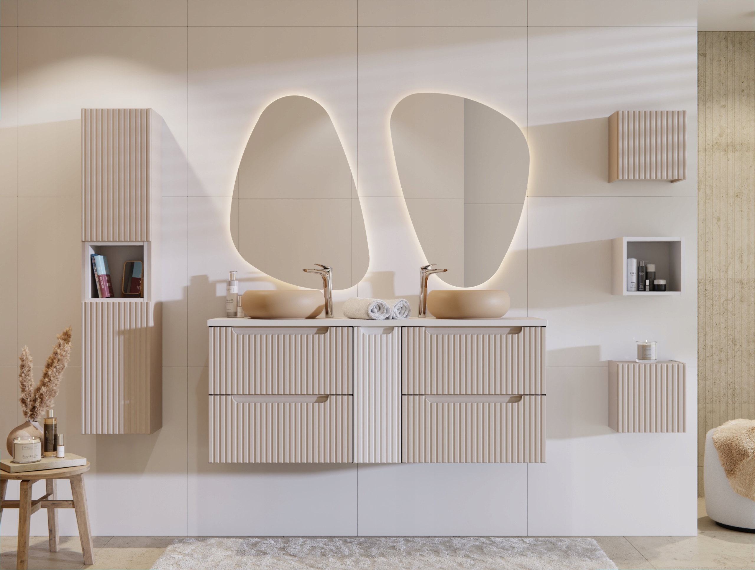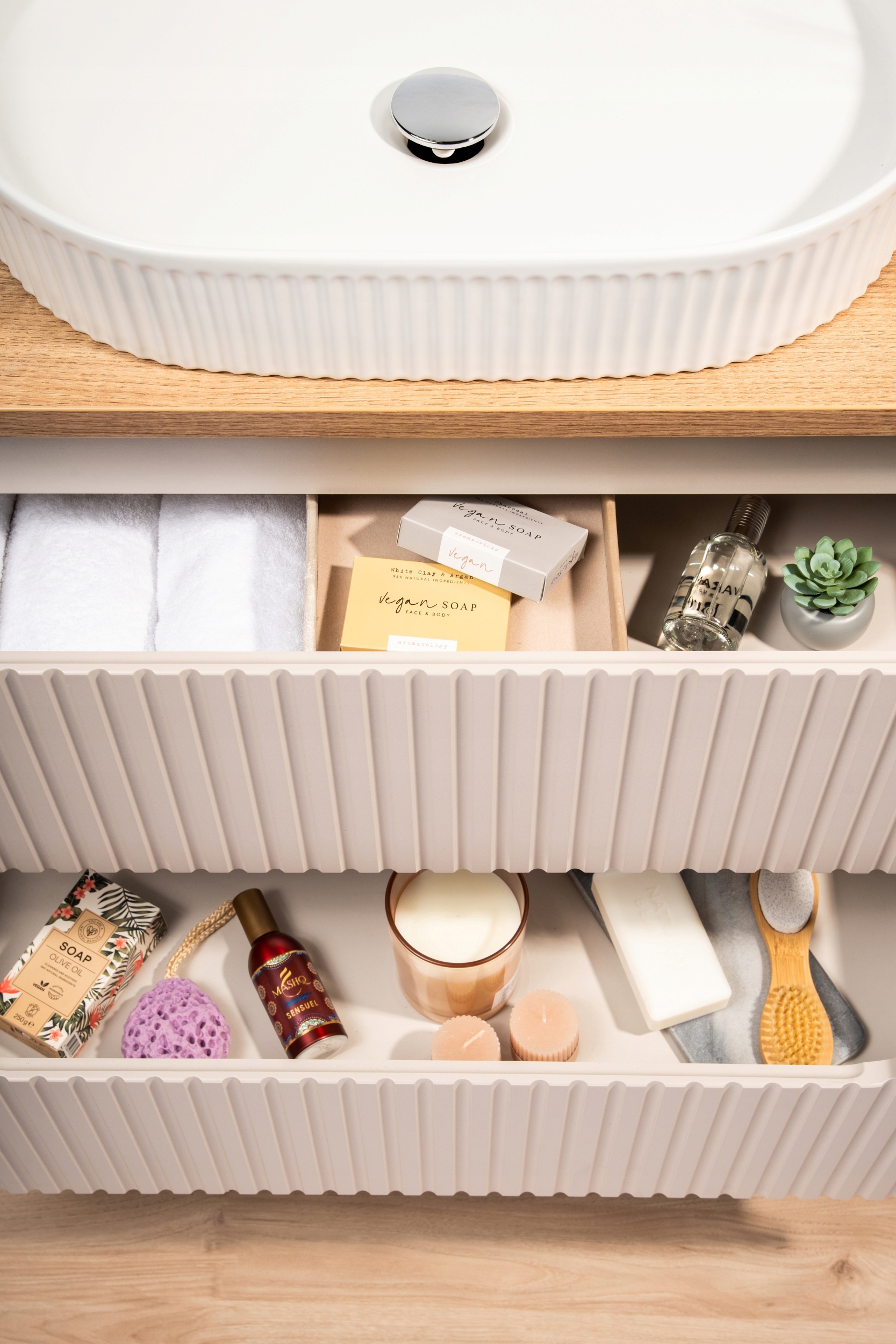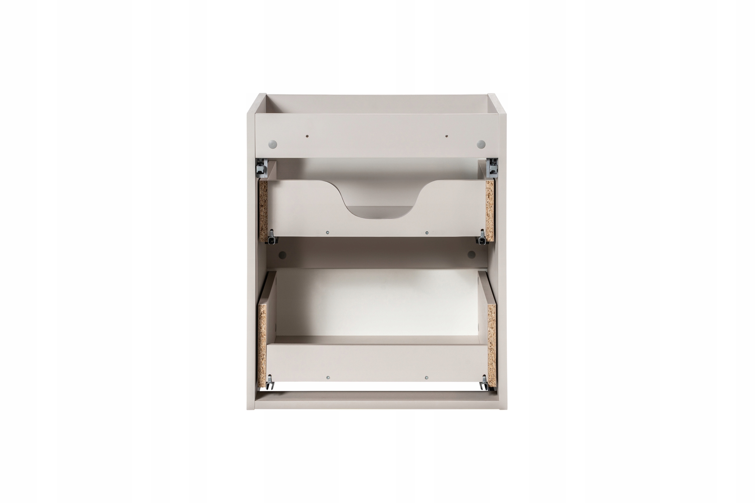 Szafka wisząca pod umywalkę z kolekcji NOVA KASZMIR to doskonałe połączenie elegancji i funkcjonalności, które idealnie dopełni każdą łazienkę. Wykończona w kaszmirowym macie, z ryflowanymi frontami oraz subtelnym frezowanym uchwytem, wnosi do wnętrza nowoczesny styl i wyjątkowy charakter. Dwie pojemne szuflady wyposażone w cichy domyk SOFT CLOSE zapewniają płynność i komfort użytkowania. Kompaktowy, przemyślany design sprawia, że szafka NOVA KASZMIR doskonale sprawdza się zarówno w mniejszych, jak i większych łazienkach, dodając im klasy i funkcjonalności.