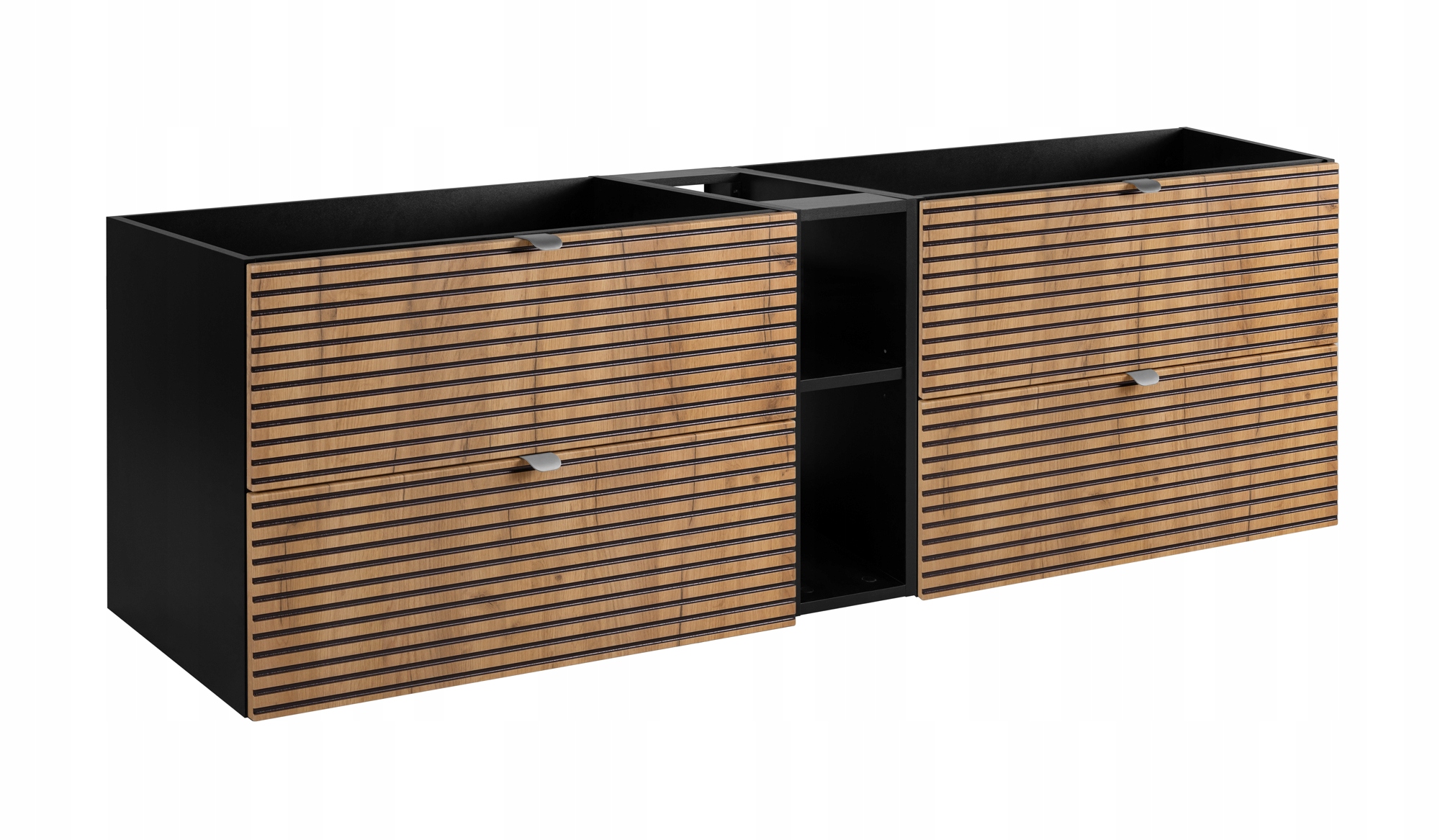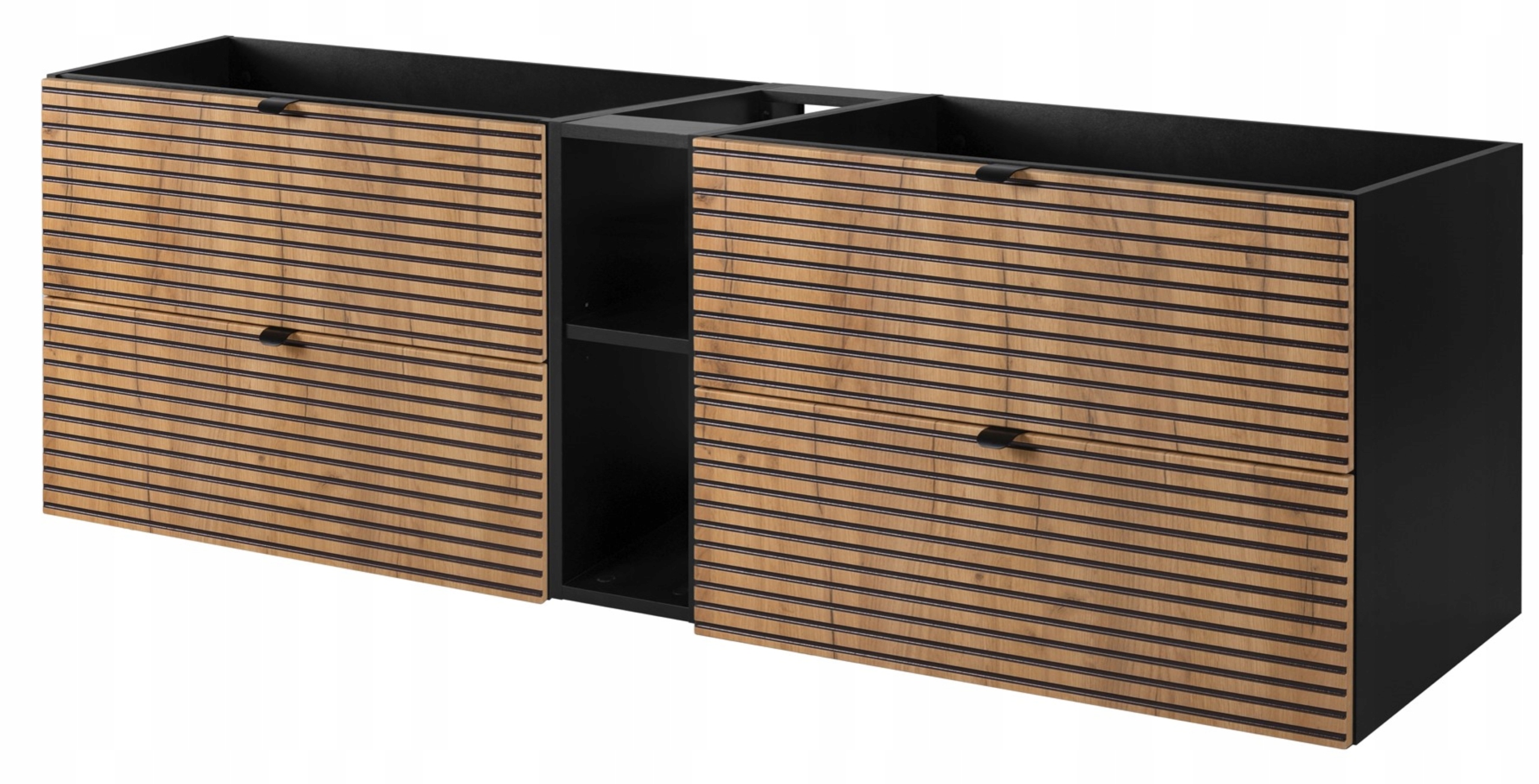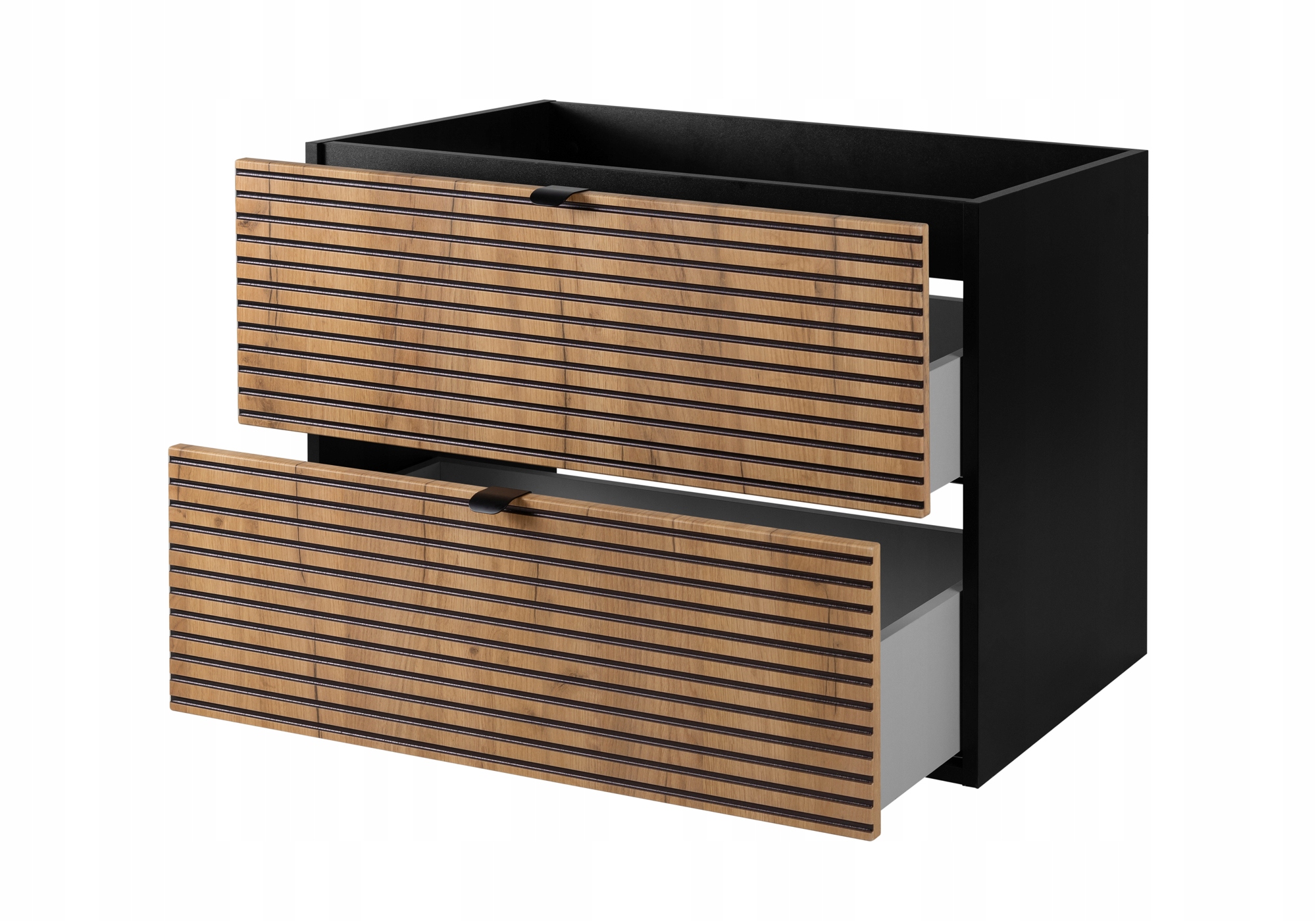 Szafka pod UMYWALKĘ AURA to doskonałe połączenie nowoczesnego designu z funkcjonalnością, które nada Twojej łazience wyjątkowego charakteru. W skład zestawu wchodzą cztery przestronne szuflady z systemem SOFT CLOSE, co zapewnia ciche i komfortowe użytkowanie. Szafki można dostosować do indywidualnych potrzeb, łącząc je z wybranym blatem i umywalką, co umożliwia pełną personalizację. Estetyka frontów w odcieniu dąb craft złoty doskonale kontrastuje z głębokim czarnym korpusem, tworząc harmonijną całość.