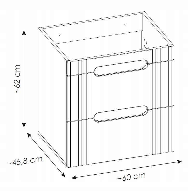 Otwieranie podchwytem i elegancko ryflowane fronty nadają tej szafce subtelności i wyjątkowego charakteru. Możliwość wyboru montażu na ścianie lub na drewnianych nóżkach (dostępnych w ofercie) pozwala dostosować mebel do indywidualnych potrzeb, zachowując spójność stylu i elegancję.
