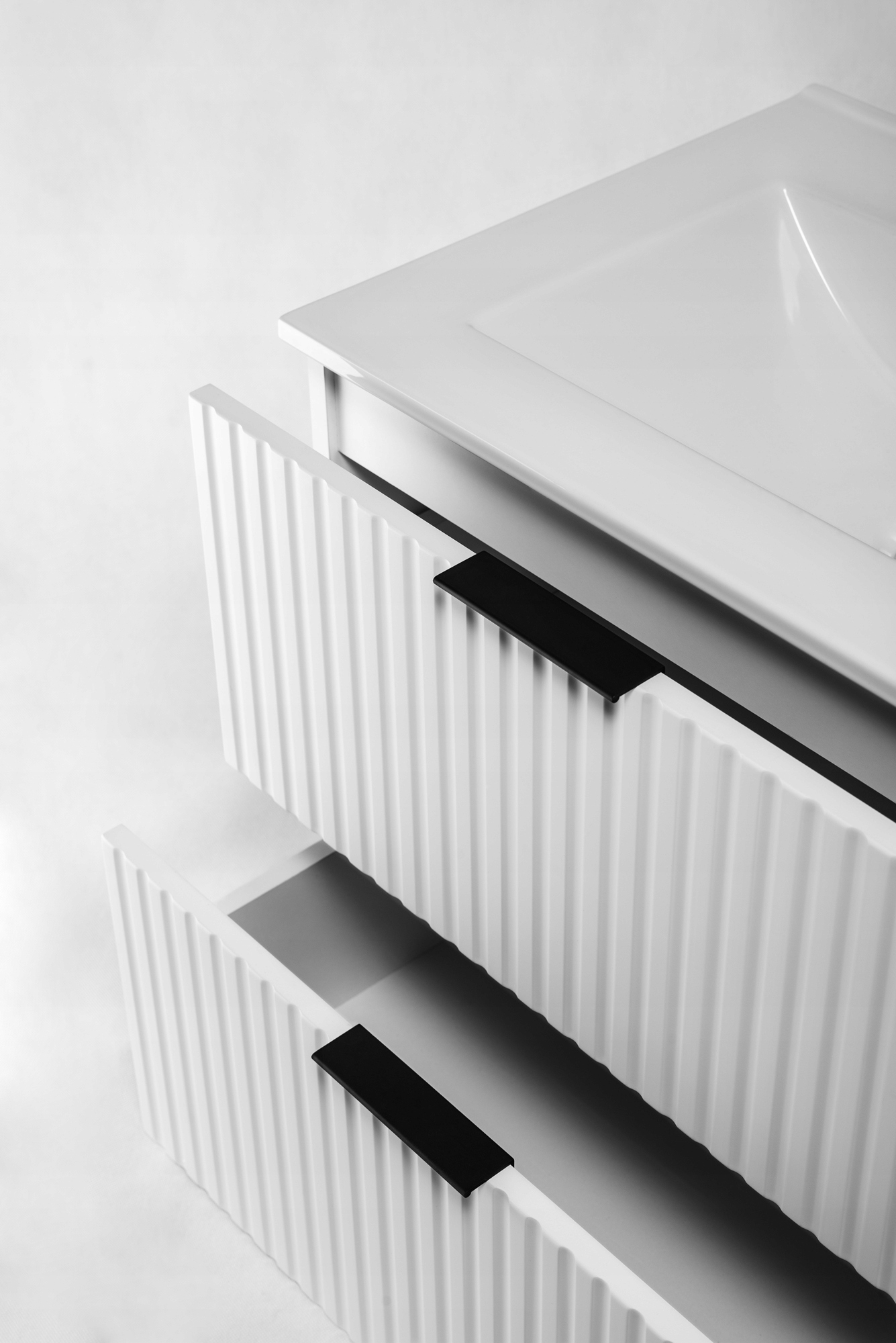 Dwie przestronne szuflady z funkcją cichego domyku SOFT CLOSE zapewniają komfort codziennego użytkowania oraz płynne i bezgłośne zamykanie. Wisząca konstrukcja nadaje bryle lekkości i ułatwia utrzymanie czystości pod meblem.
