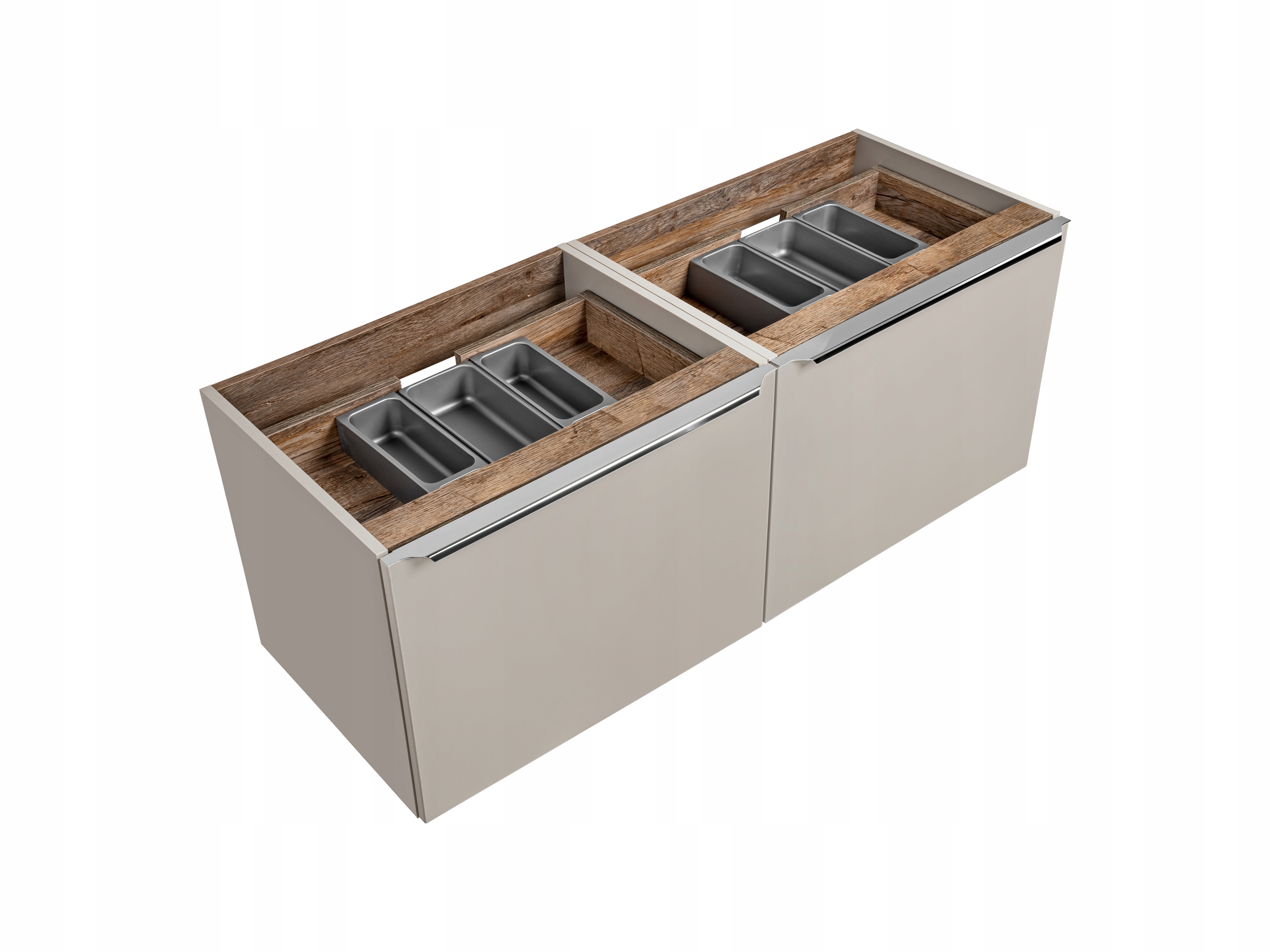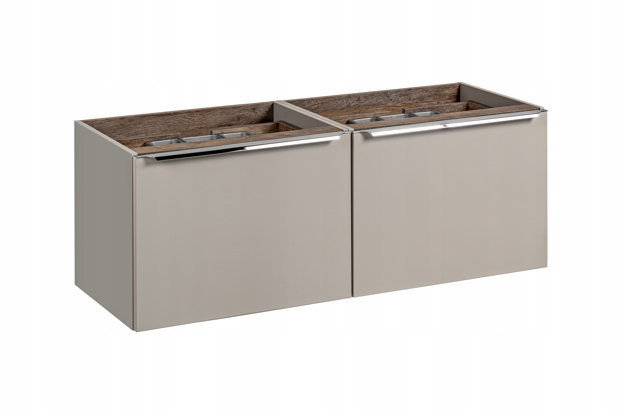 Nowoczesny zestaw łazienkowy SANTA FE TAUPE w odcieniu taupe doskonale wpasuje się w minimalistyczne i eleganckie wnętrza. Zestaw obejmuje dwie szafki o szerokości 60 cm każda, wyposażone w chromowane uchwyty oraz cichy domyk szuflad, co zapewnia wygodę i cichą pracę. Dodatkowe szuflady wewnątrz oraz funkcjonalny organizer pozwalają na doskonałe zagospodarowanie przestrzeni, dzięki czemu wszystkie niezbędne akcesoria będą zawsze na swoim miejscu. Fronty oraz korpusy wykonane w kolorze pebble gray, z wstawkami Santa Fe Oak, nadają całości lekkości i subtelnej elegancji.