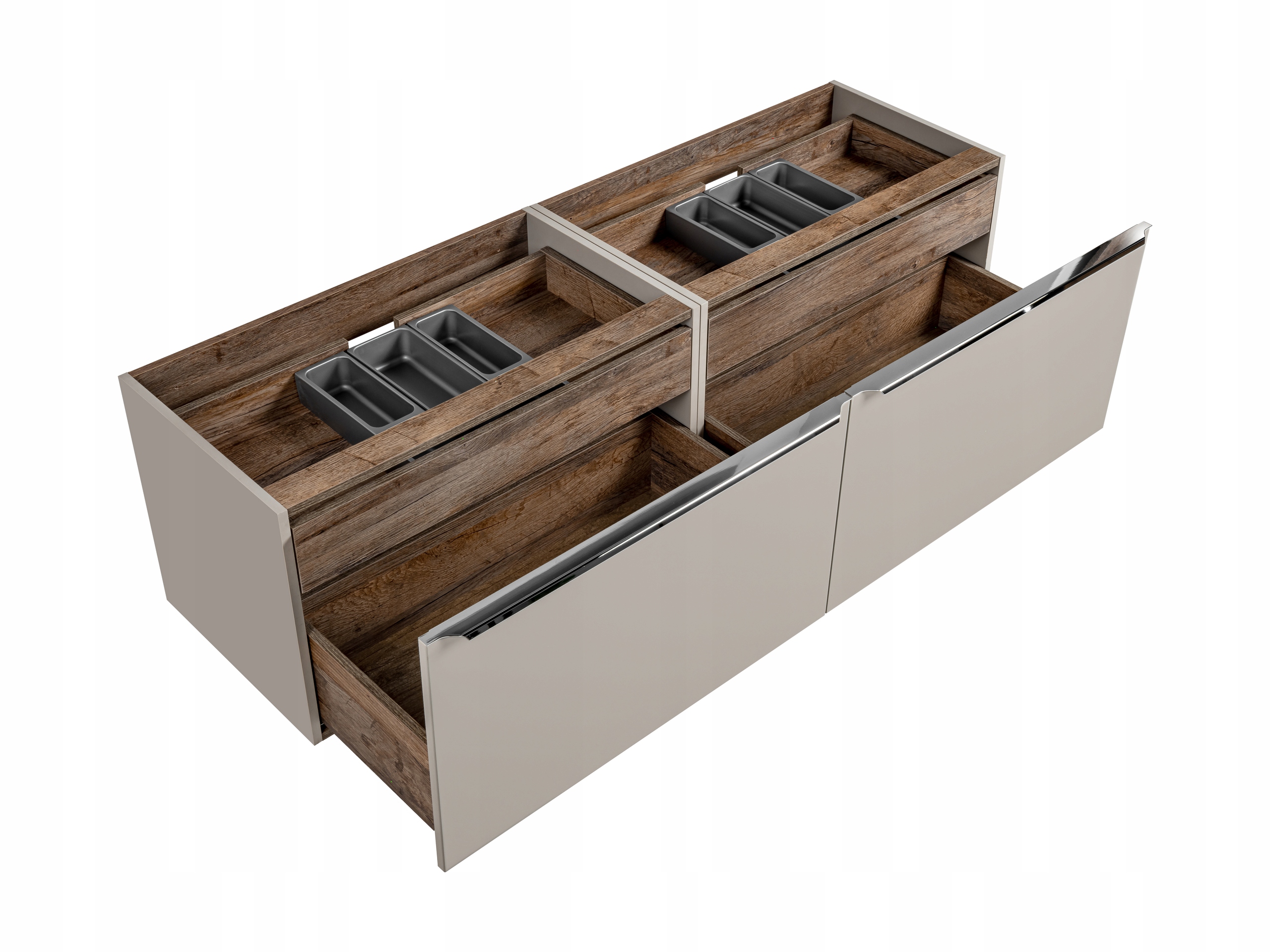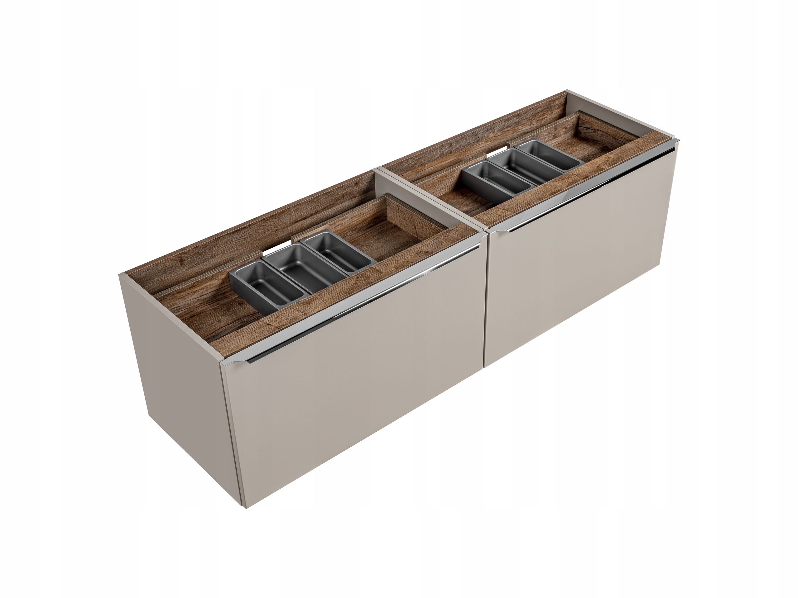 Nowoczesny zestaw łazienkowy SANTA FE TAUPE w odcieniu taupe doskonale wpasuje się w minimalistyczne i eleganckie wnętrza. Zestaw obejmuje dwie szafki o szerokości 80 cm każda, wyposażone w chromowane uchwyty oraz cichy domyk szuflad, co zapewnia wygodę i cichą pracę. Dodatkowe szuflady wewnątrz oraz funkcjonalny organizer pozwalają na doskonałe zagospodarowanie przestrzeni, dzięki czemu wszystkie niezbędne akcesoria będą zawsze na swoim miejscu. Fronty oraz korpusy wykonane w kolorze pebble gray, z wstawkami Santa Fe Oak, nadają całości lekkości i subtelnej elegancji.