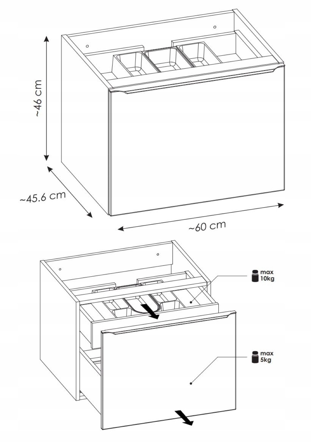 Szafka pod umywalkę wisząca 60 cm z tej kolekcji to kompaktowe, a jednocześnie funkcjonalne rozwiązanie. Posiada dwie szuflady, w tym jedną wewnętrzną z organizerem, co ułatwia przechowywanie i utrzymanie porządku w kosmetykach oraz akcesoriach. System cichego domyku zapewnia płynne i bezgłośne zamykanie, dodając codziennemu użytkowaniu komfortu i elegancji. Ta stylowa szafka świetnie komponuje się z pozostałymi elementami SANTA FE BLACK, tworząc harmonijną i luksusową przestrzeń łazienkową.