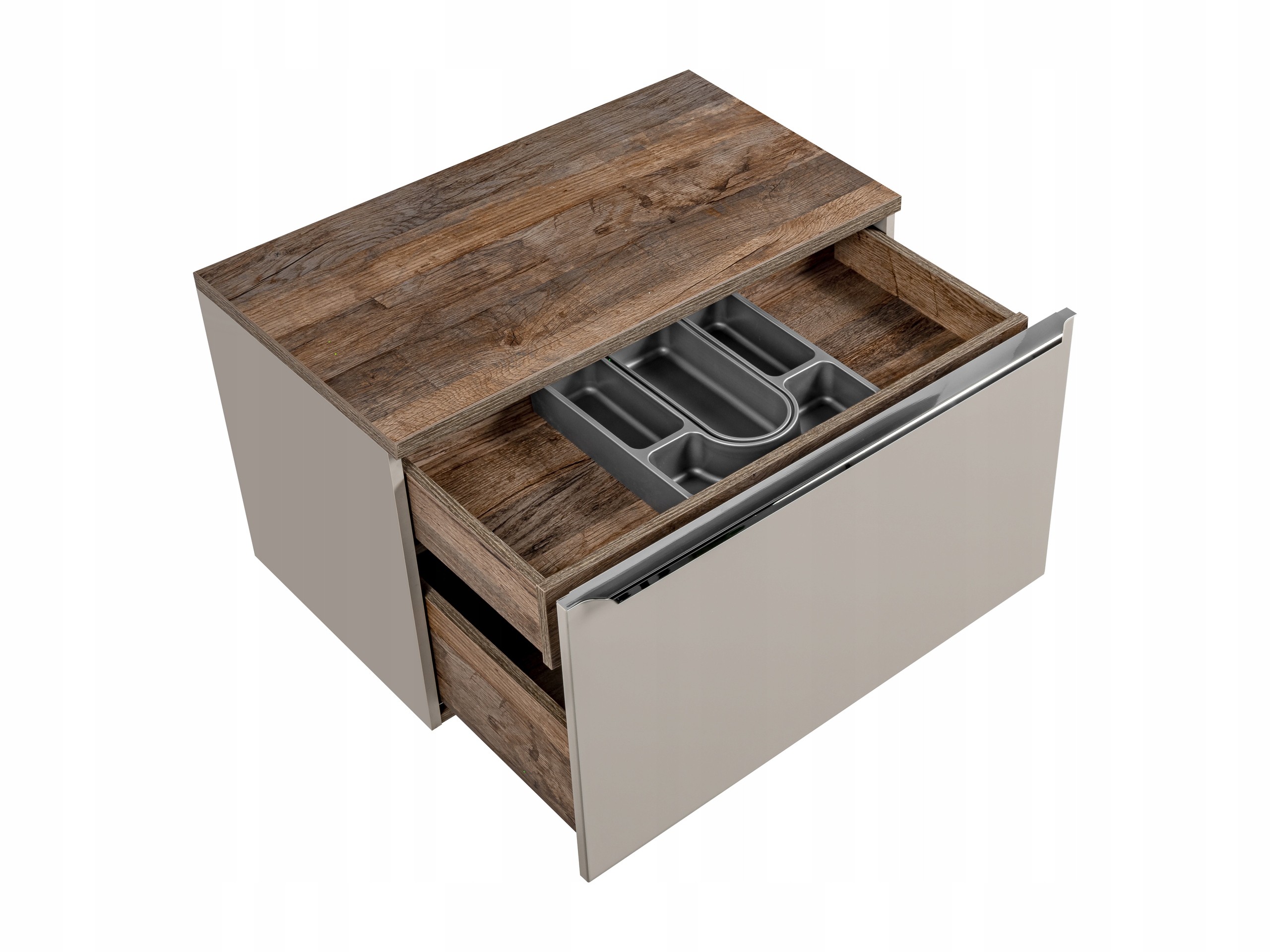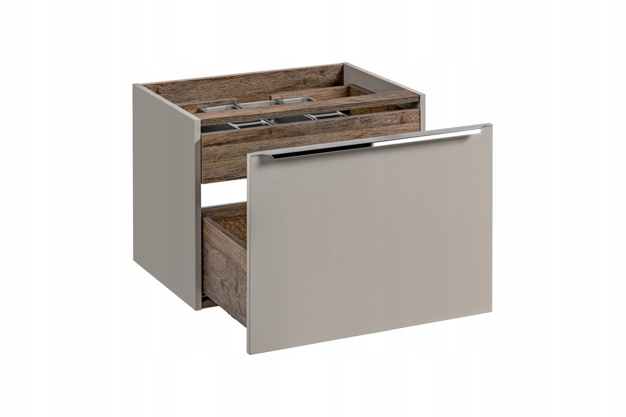 Szafka pod umywalkę w odcieniu taupe z kolekcji SANTA FE TAUPE to nowoczesne i eleganckie rozwiązanie, idealne do każdej stylowej łazienki. Fronty oraz korpus w odcieniu szarego krzemowego, połączone z chromowanymi uchwytami, nadają całości lekkiego, wyjątkowego wyglądu. Przemyślany system dwóch szuflad, w tym dodatkowa szuflada wewnętrzna, zapewnia optymalną przestrzeń na przechowywanie kosmetyków i akcesoriów łazienkowych, a funkcja cichego domyku gwarantuje komfortowe użytkowanie każdego dnia. Szafka wyposażona jest w praktyczny organizer, który dyskretnie ukrywa wycięcie na syfon i zwiększa funkcjonalność przestrzeni. Szafka sprzedawana jest bez blatu – dostępne warianty blatów można znaleźć na naszych pozostałych aukcjach, co pozwala na idealne dopasowanie do stylu Twojej łazienki.