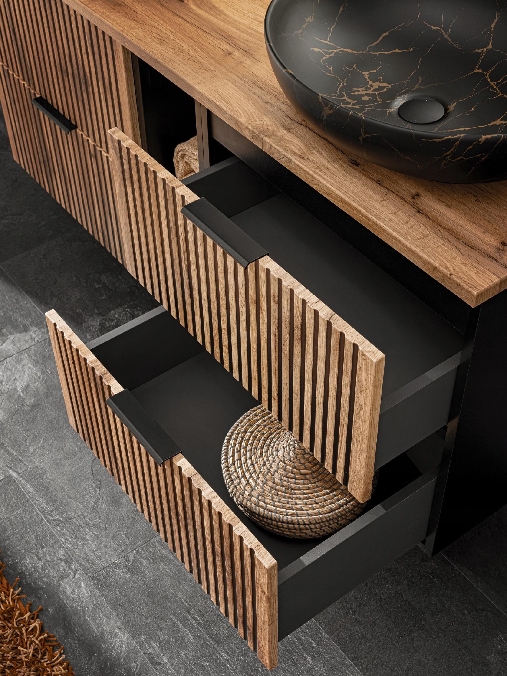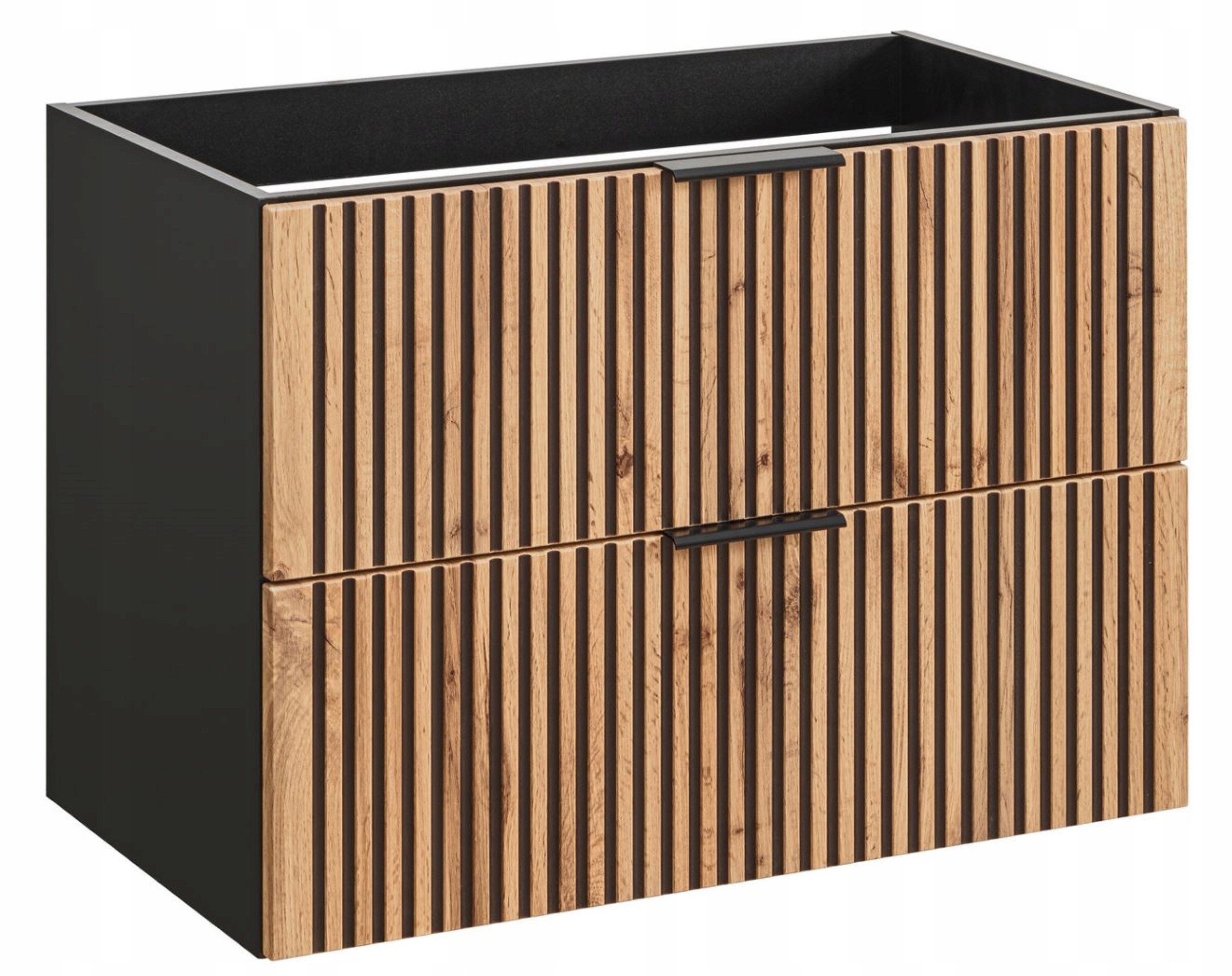 Kolekcja XILO oferuje wiszącą szafkę łazienkową, która idealnie łączy w sobie nowoczesny styl z funkcjonalnością. Ta czarna szafka o szerokości 80 cm z ryflowanymi frontami w kolorze Dąb Wotan wprowadza luksusowy akcent do każdej łazienki. Połączenie głębokiego czarnego korpusu z naturalnymi słojami drewna tworzy efekt harmonii i elegancji, doskonały dla osób ceniących wyjątkowy design.