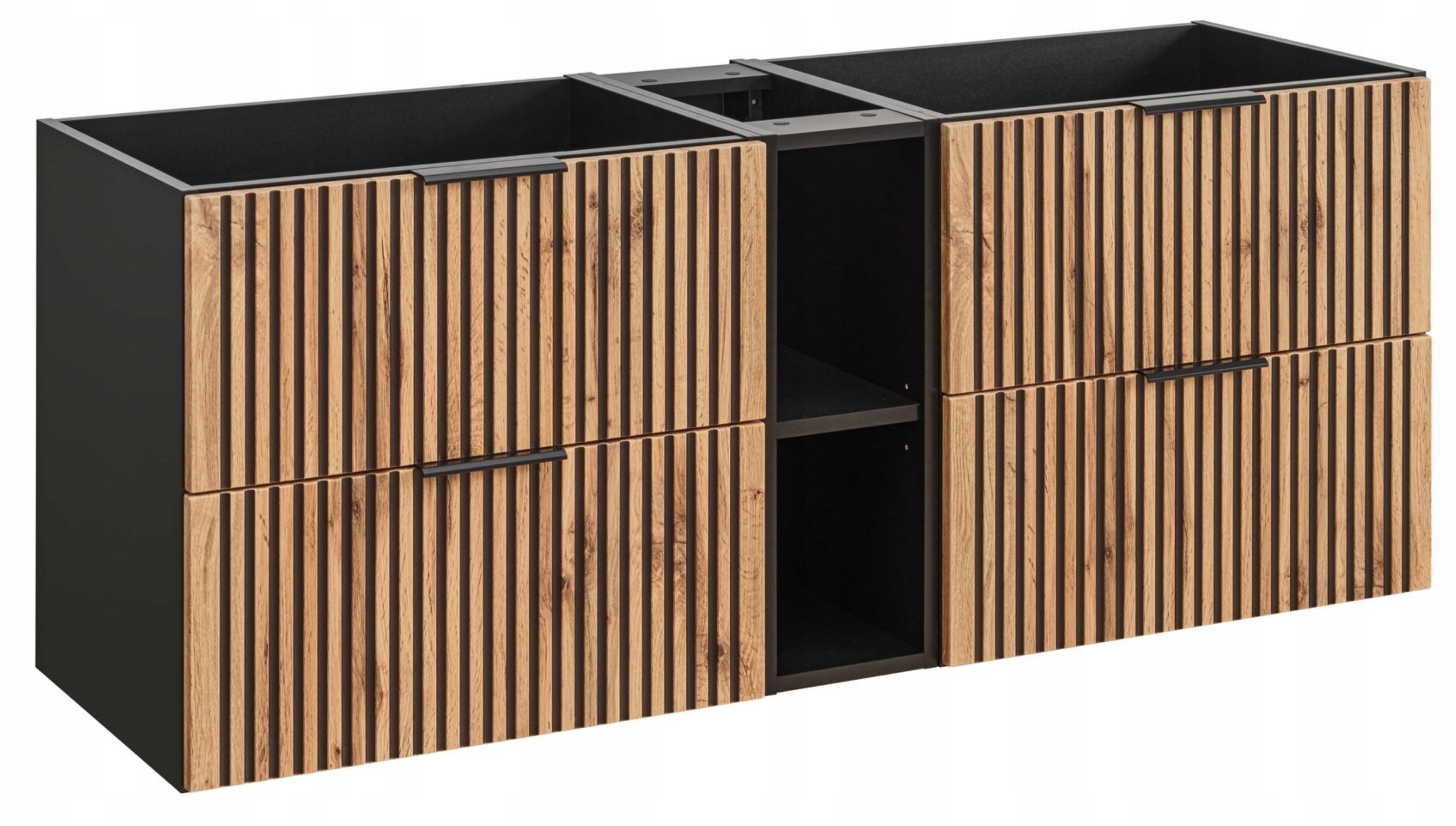 Ta wyjątkowa szafka z KOLEKCJI XILO to idealne rozwiązanie do nowoczesnej łazienki, łączące funkcjonalność z elegancją. Czarne, ryflowane fronty w połączeniu z Dębem Wotan tworzą harmonijny kontrast, nadając wnętrzu unikalnego charakteru. Wyposażona w 4 szuflady z cichym domykiem SOFT CLOSE oraz dodatkowy regał z półkami, oferuje mnóstwo przestrzeni do przechowywania.