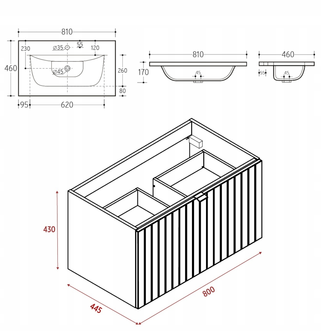 Szerokość – 80 cm, wysokość – 43 cm, głębokość – 44,5 cm. Umywalka: szerokość – 81 cm, wysokość – 1,6 cm, głębokość – 46 cm. Korpus i front w kaszmirowym półmacie, lakierowane. Umywalka ceramiczna w czarnym macie. Uchwyty metalowe w trzech wariantach kolorystycznych.