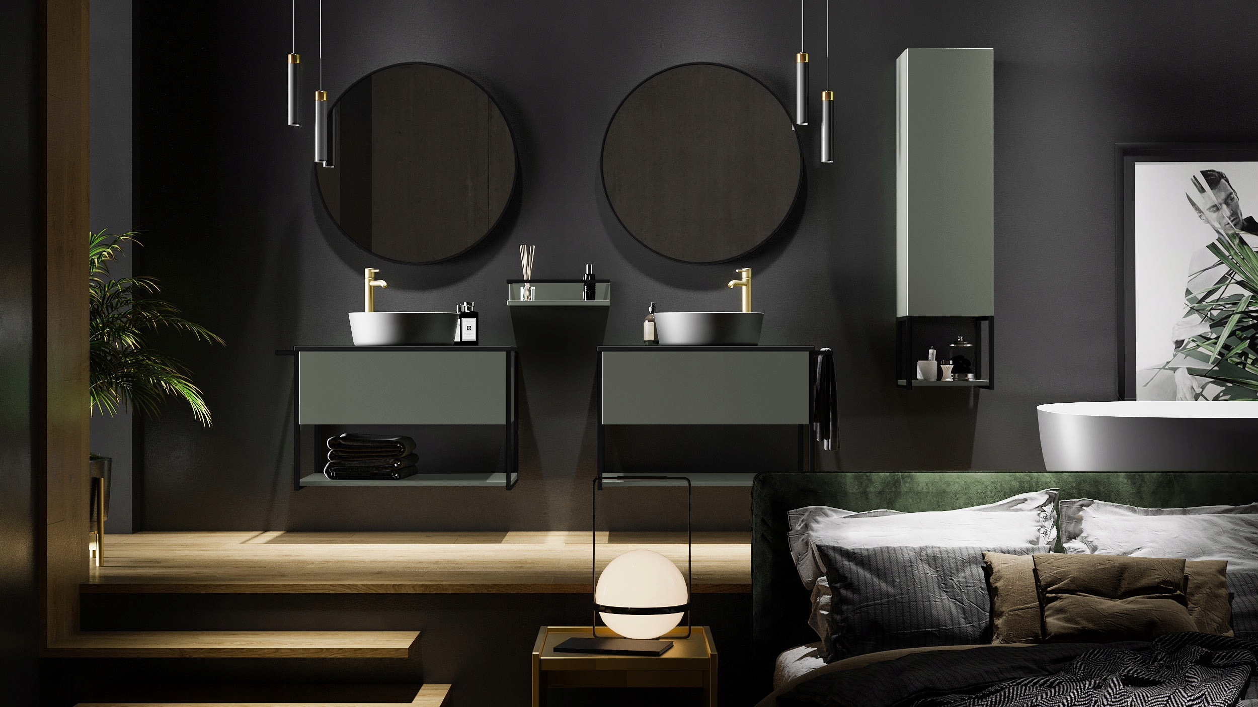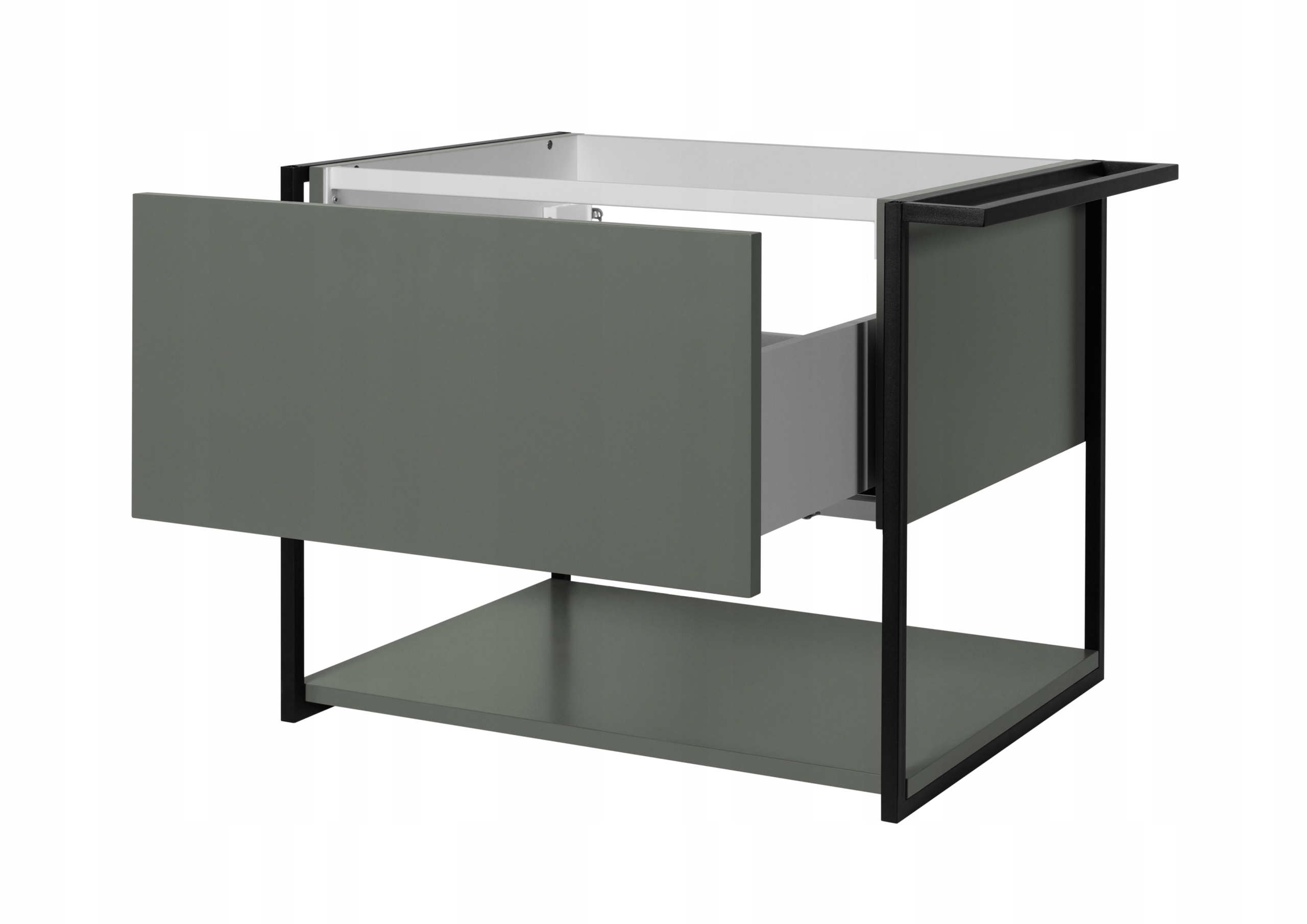 Zielona szafka łazienkowa LOV z białą umywalką wpuszczaną o szerokości sześćdziesięciu centymetrów to doskonała propozycja do nowoczesnych wnętrz, w których liczy się zarówno funkcjonalność, jak i wyjątkowy design. Lakierowana powierzchnia w półmatowym wykończeniu nadaje meblowi elegancji i subtelności, a czarne metalowe detale – w tym boczna rama oraz wieszak – wprowadzają industrialny akcent, idealnie wpisujący się w aranżacje loftowe i minimalistyczne. Wisząca forma dodaje wizualnej lekkości i ułatwia utrzymanie czystości w łazience. Pojemna szuflada z systemem push-to-open umożliwia ciche, bezuchwytowe otwieranie, a metalowy organizer wewnątrz pomaga w organizacji codziennych drobiazgów. Otwarta dolna półka świetnie sprawdza się jako przestrzeń na ręczniki lub dodatki dekoracyjne. Szafka została wyposażona w prowadnice Hettich Quadro, które zapewniają płynny i niezawodny wysuw szuflady. Do zestawu dołączono ceramiczną umywalkę w klasycznym białym połysku – trwałą, łatwą w czyszczeniu i estetycznie dopasowaną do koloru frontów. Mebel przeznaczony jest do samodzielnego montażu, z intuicyjną instrukcją w zestawie. Produkt wyprodukowany w Polsce z wysokiej jakości materiałów.