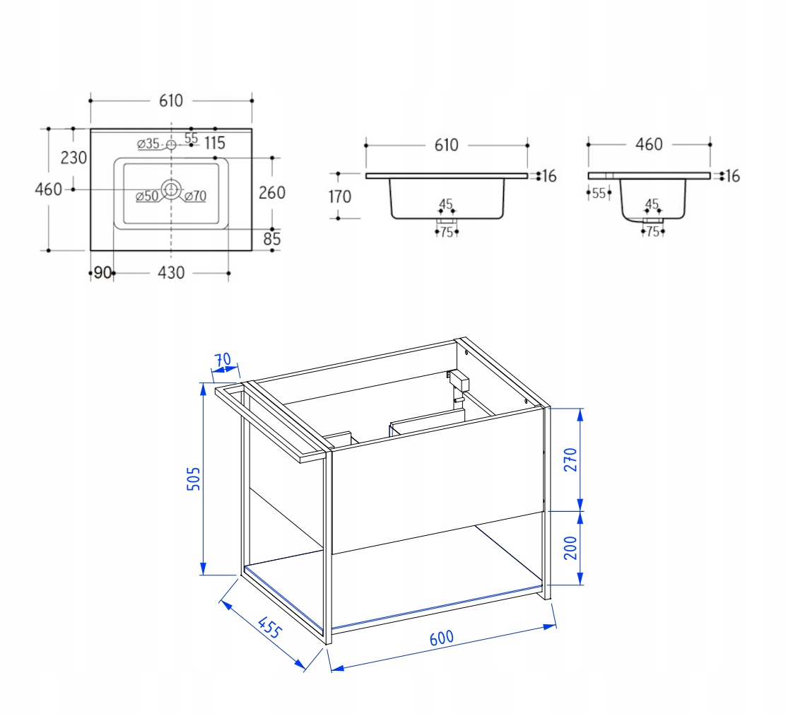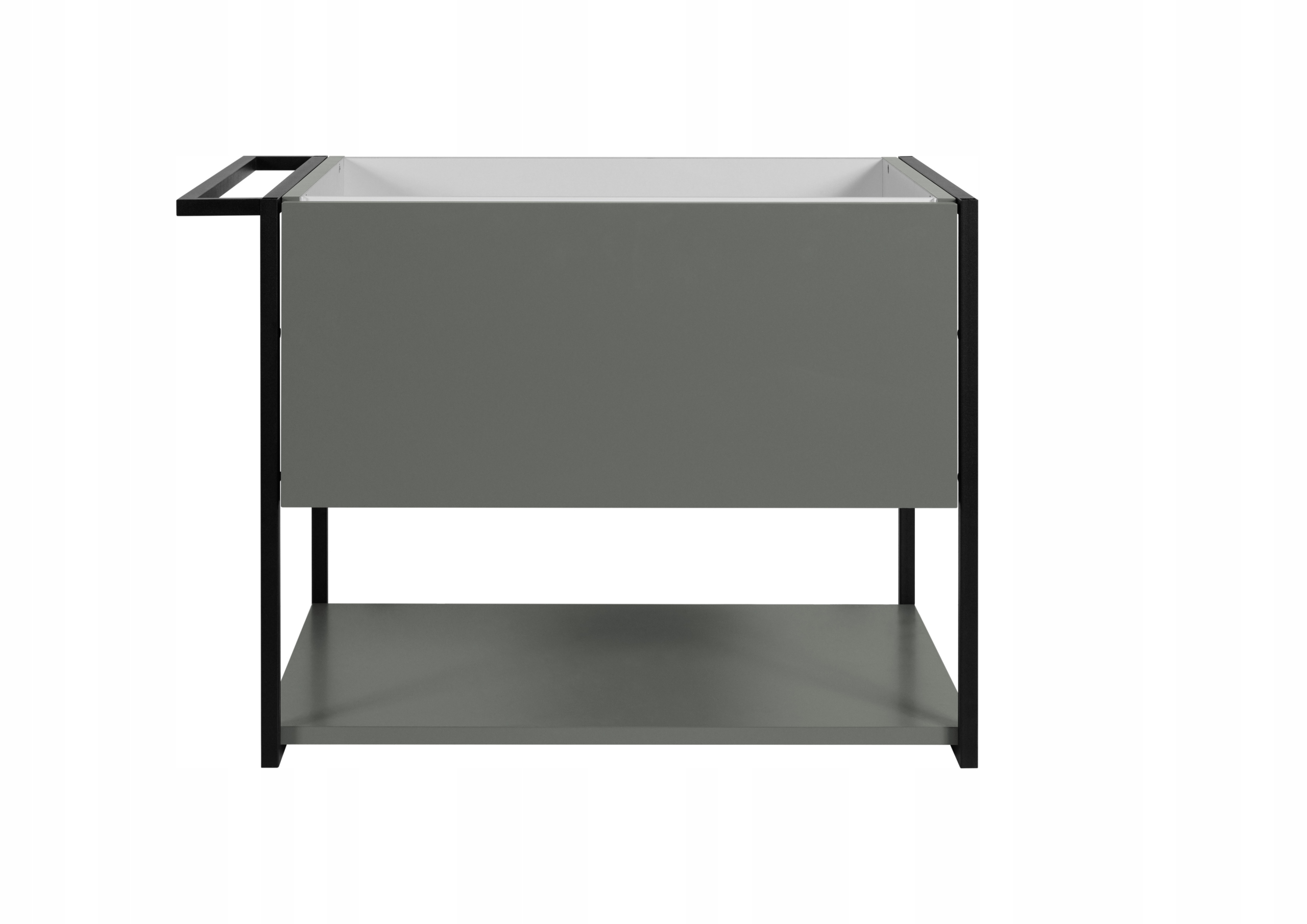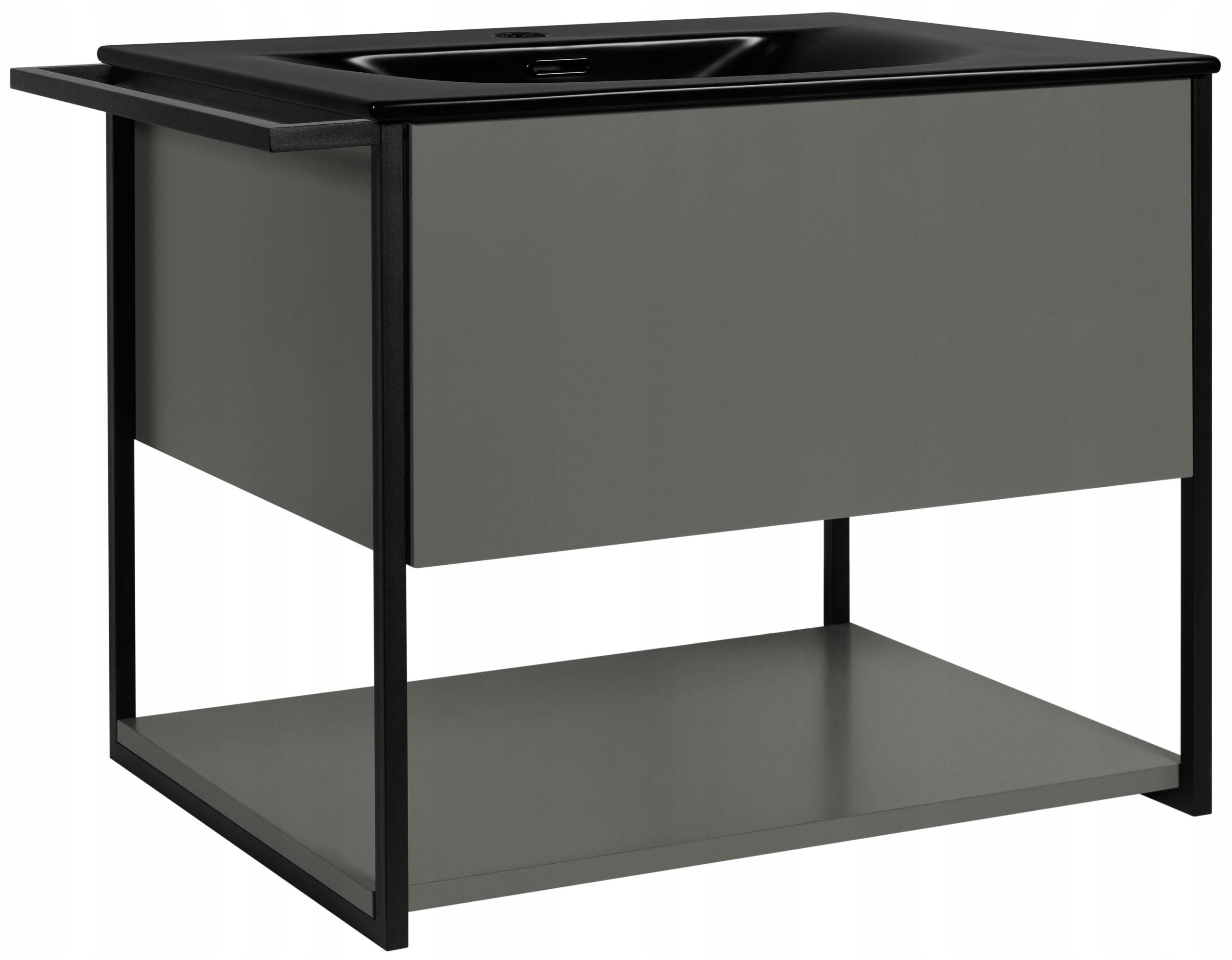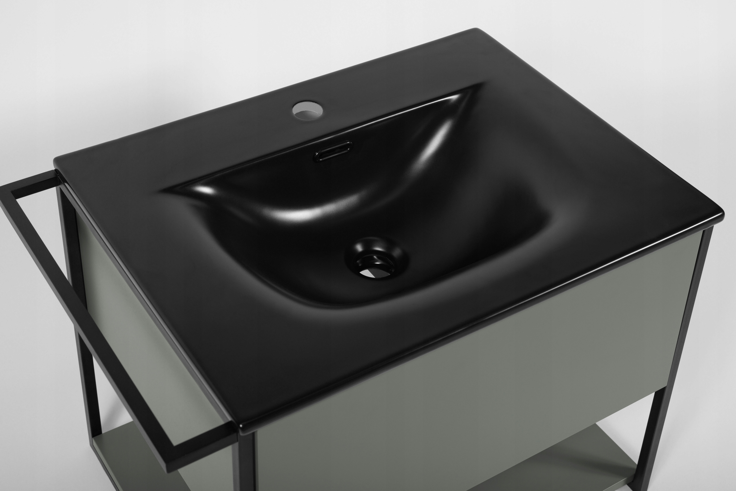 Zestaw z kolekcji LOV to funkcjonalne i stylowe rozwiązanie do nowoczesnych łazienek, które łączy industrialną estetykę z praktycznym podejściem do przechowywania. Lakierowana szafka w stonowanym, zielonym półmacie została wykonana z wysokiej jakości płyty laminowanej i wyposażona w bezuchwytowy front z systemem push-to-open oraz prowadnice Hettich Quadro, które gwarantują komfortowe, ciche otwieranie. Jej nowoczesna forma z metalowymi bokami w czarnym macie nadaje meblowi lekkości i wyjątkowego charakteru. Szafka posiada jedną pojemną szufladę z metalowym organizerem oraz otwartą dolną półkę, idealną na ręczniki lub dekoracyjne pojemniki. Zestaw dopełnia czarna umywalka wpuszczana o szerokości sześćdziesięciu centymetrów, wykonana z ceramiki sanitarnej – subtelnie kontrastująca z zielonym korpusem i idealnie dopasowana do blatu. Wieszak montowany z lewej lub prawej strony zwiększa funkcjonalność zestawu, pozwalając na wygodne zawieszenie ręczników. Konstrukcja mebla została zaprojektowana jako wisząca, co nie tylko ułatwia sprzątanie pod spodem, ale również optycznie powiększa przestrzeń. Całość została starannie wykonana z dbałością o detale i wyprodukowana w Polsce z materiałów trwałych i odpornych na wilgoć, co gwarantuje wieloletnie użytkowanie.