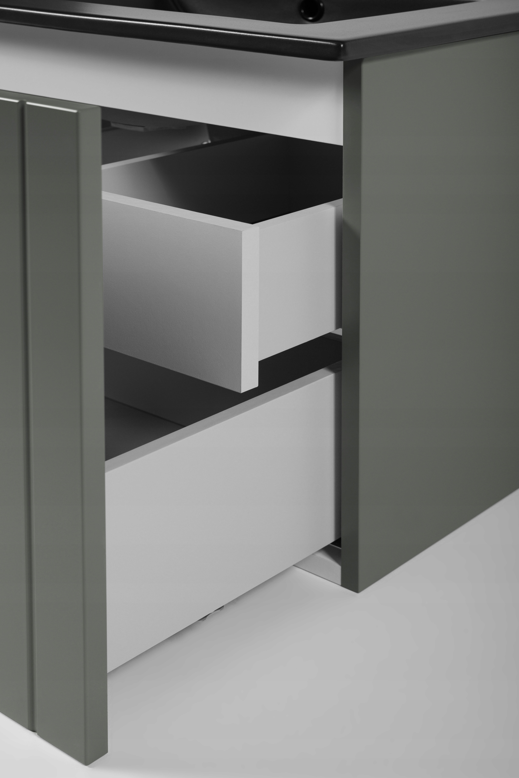 Pionowo frezowane fronty w zielonym półmacie wykonane z lakierowanej płyty MDF podkreślają subtelny i nowoczesny charakter mebla. Korpus z płyty laminowanej pokrytej trwałym lakierem zwiększa odporność na wilgoć i codzienne użytkowanie. Wszystkie szuflady zostały wyposażone w prowadnice Hettich Quadro z funkcją cichego domyku, co gwarantuje wyjątkowy komfort użytkowania.