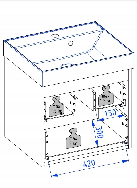 Szafka o szerokości 50 cm wyposażona jest w pojemną szufladę zewnętrzną oraz praktyczną szufladkę wewnętrzną, idealną do przechowywania kosmetyków i akcesoriów. Obie szuflady osadzono na prowadnicach Hettich Quadro z funkcją cichego domyku, co zapewnia komfort użytkowania i płynne otwieranie. Lekka, wisząca konstrukcja mebla ułatwia utrzymanie czystości pod szafką i nadaje wnętrzu wizualnej przestronności.
