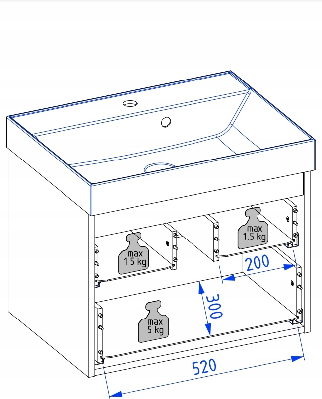 Model o szerokości 60 cm został wyposażony w pojemną zewnętrzną szufladę oraz dodatkową, ukrytą szufladkę wewnętrzną, idealną na kosmetyki i drobne akcesoria. Obie szuflady działają na prowadnicach Hettich Quadro z funkcją cichego domyku, gwarantując płynne i komfortowe użytkowanie. Wisząca konstrukcja szafki nadaje wnętrzu lekkości oraz ułatwia sprzątanie przestrzeni pod meblem.