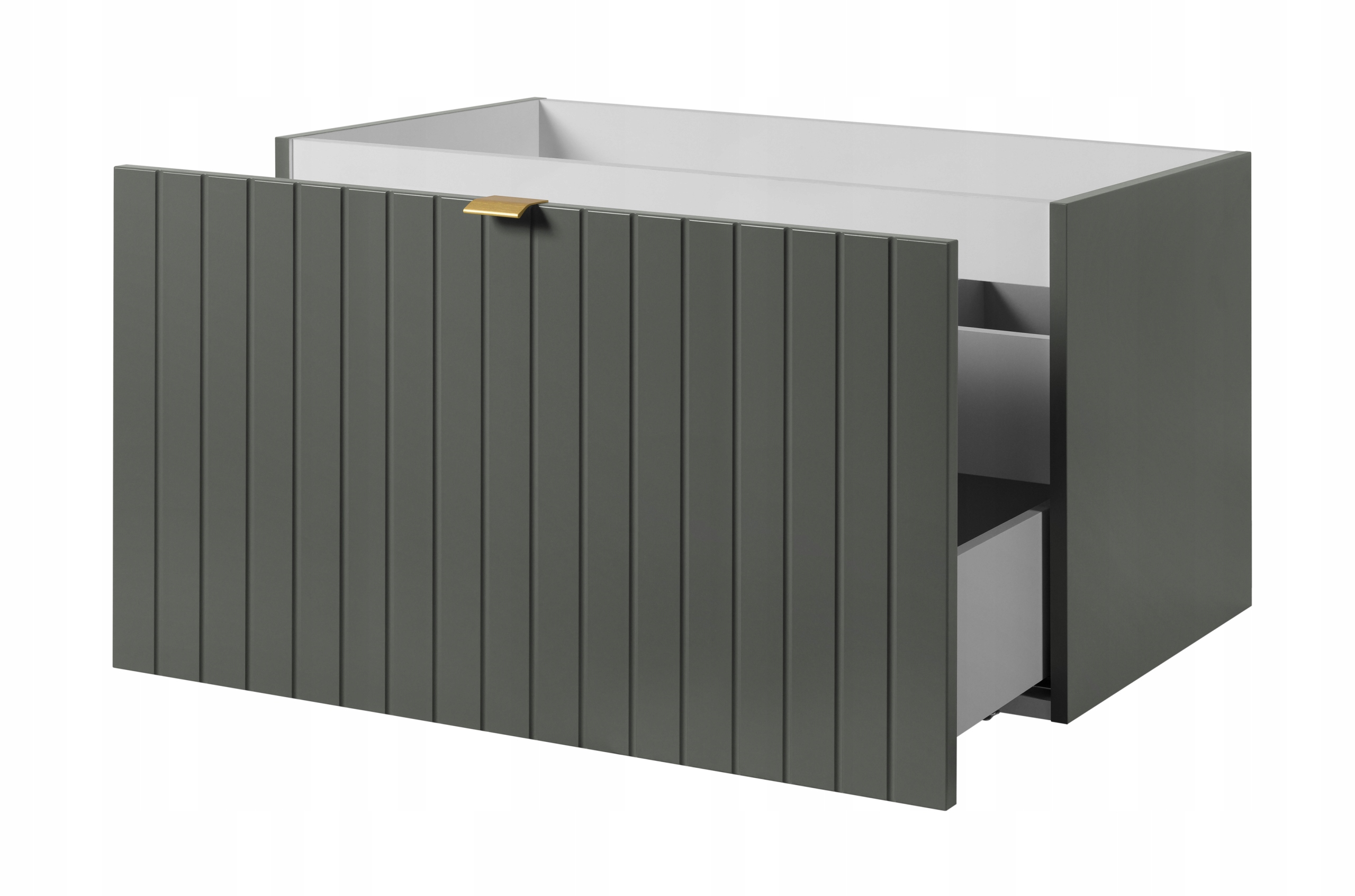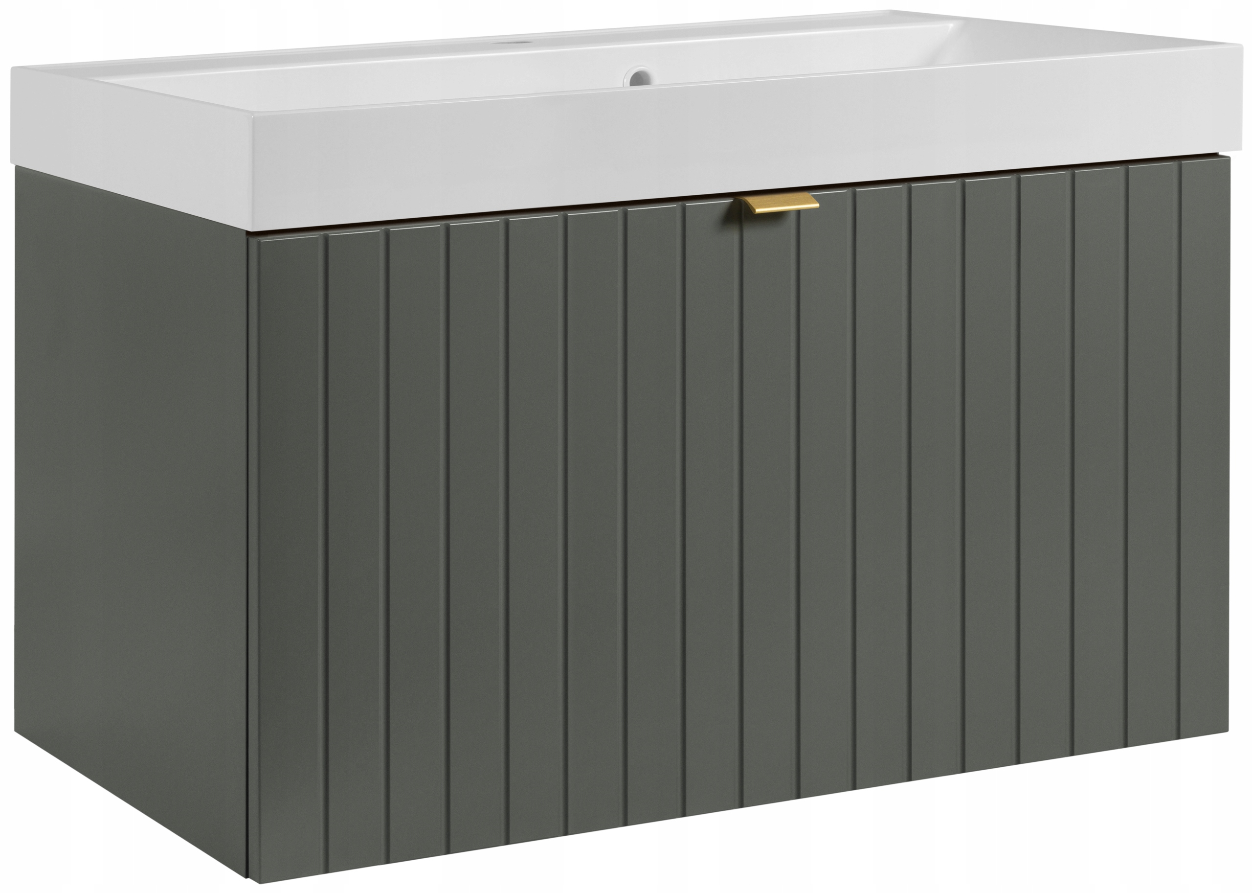 Kolekcja mebli łazienkowych HARMO to elegancja i funkcjonalność zamknięta w nowoczesnej formie. Zielona szafka pod umywalkę o szerokości 80 cm przyciąga wzrok delikatnym pionowym frezowaniem na frontach z lakierowanego MDF oraz stonowanym półmatowym wykończeniem, które nadaje wnętrzu wyjątkowego charakteru. Lakierowane powierzchnie korpusu i frontów są odporne na wilgoć, co zapewnia ich trwałość na lata.
