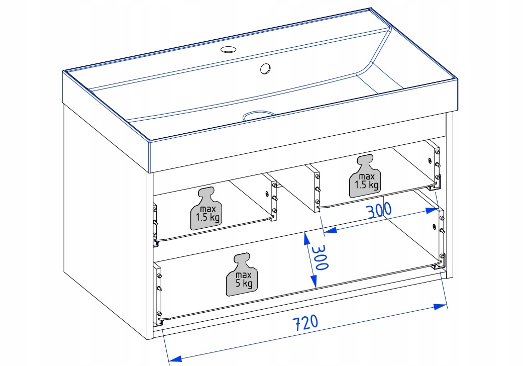 Model został wyposażony w pojemną zewnętrzną szufladę oraz dodatkową szufladkę wewnętrzną, idealną do przechowywania kosmetyków i akcesoriów. System cichego domyku w prowadnicach Hettich Quadro gwarantuje płynne i komfortowe użytkowanie. Wisząca konstrukcja szafki optycznie powiększa przestrzeń i ułatwia utrzymanie czystości pod meblem.