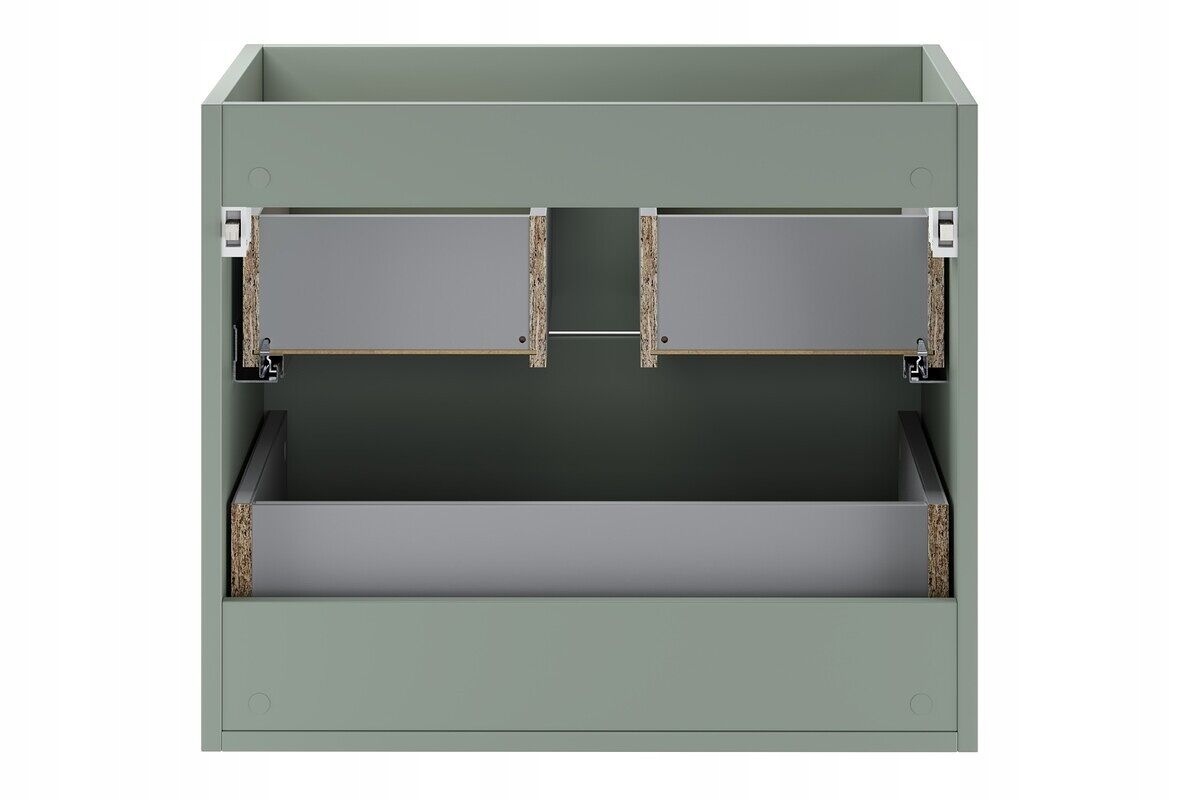 Korpus i fronty wykonane są z płyty laminowanej w kolorze Zielony Mat, co zapewnia trwałość oraz estetyczne wykończenie. Uchwyty w kolorze mebla wykonane są z tworzywa. Mebel przeznaczony jest do montażu wiszącego, co nadaje zabudowie lekkości i ułatwia utrzymanie czystości pod szafką. Konstrukcja umożliwia również montaż w wersji stojącej po zastosowaniu dodatkowych nóżek, które nie są dołączone do zestawu. Bateria, syfon oraz click-clack nie są częścią zestawu. Mebel przeznaczony jest do użytkowania w łazience w warunkach domowych – zaleca się unikanie długotrwałego kontaktu powierzchni z wodą oraz regularne wycieranie wilgoci.