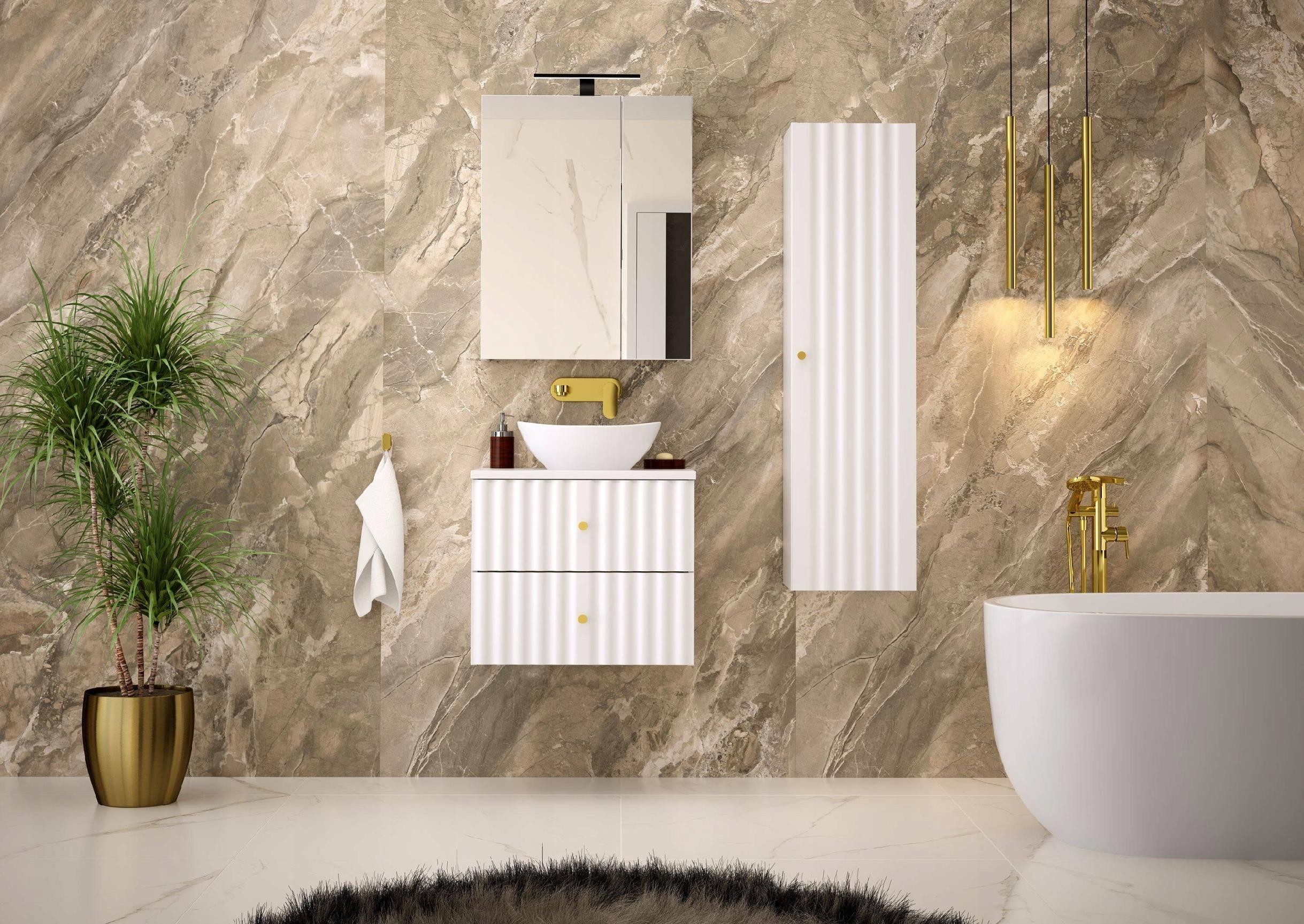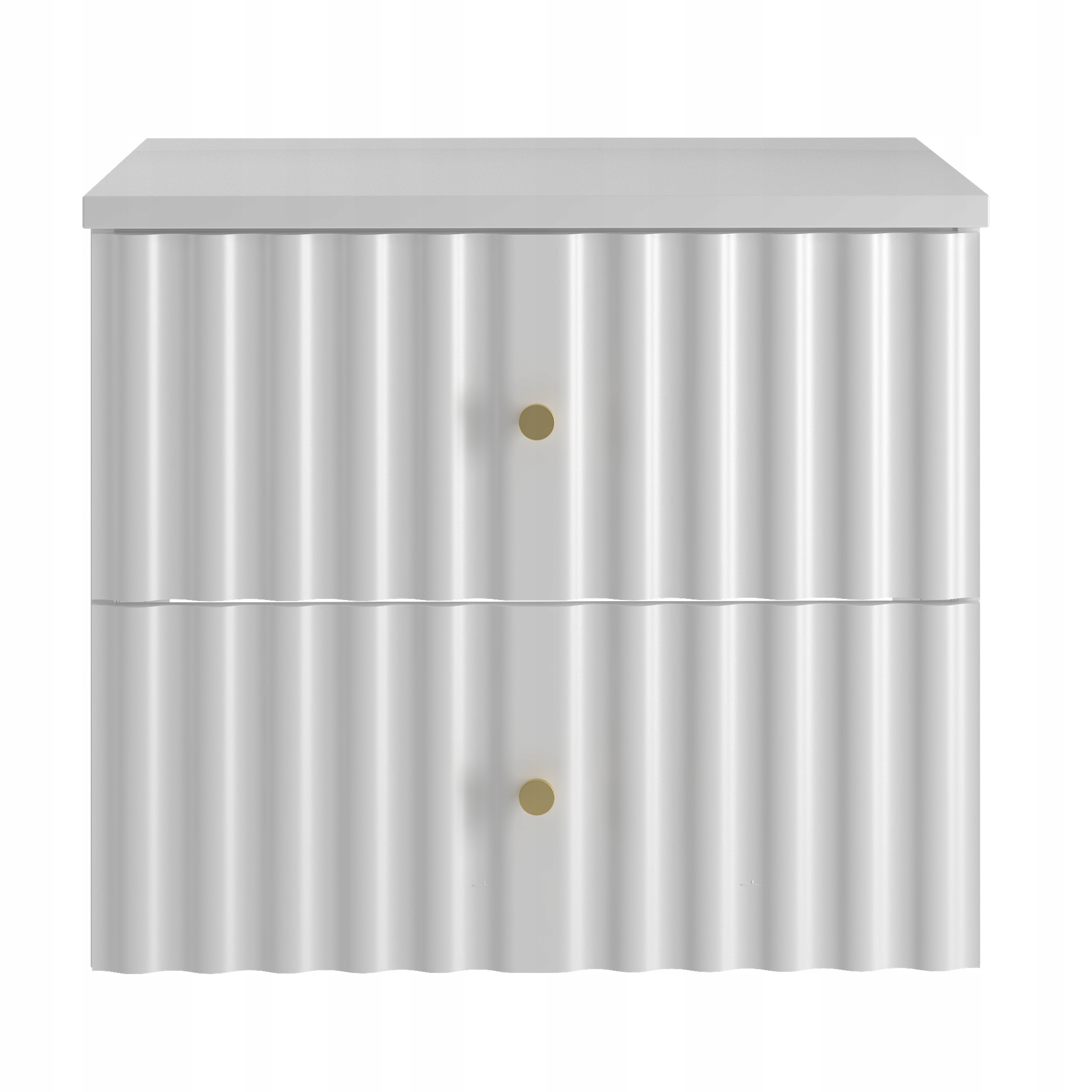 Szafka łazienkowa z kolekcji Aqua o szerokości 60 cm z dopasowanym blatem w kolorze biały mat to nowoczesne i funkcjonalne rozwiązanie dla eleganckich wnętrz. Ryflowane fronty MDF w matowym wykończeniu nadają meblowi unikalnego charakteru, a złote aluminiowe uchwyty gałkowe podkreślają jego luksusowy wygląd. Dzięki połączeniu prostoty i stylu całość doskonale wpisuje się w aranżacje nowoczesnych łazienek.