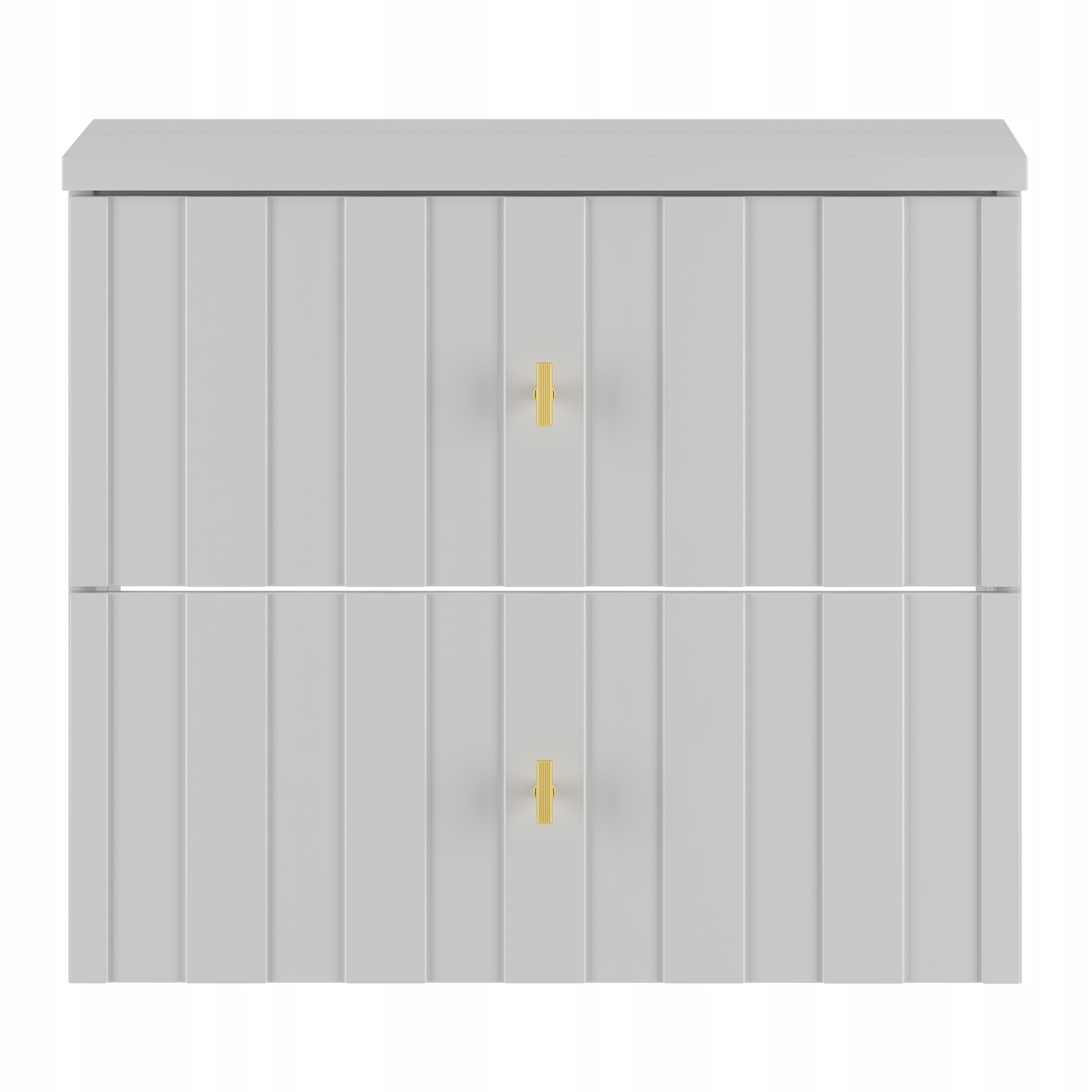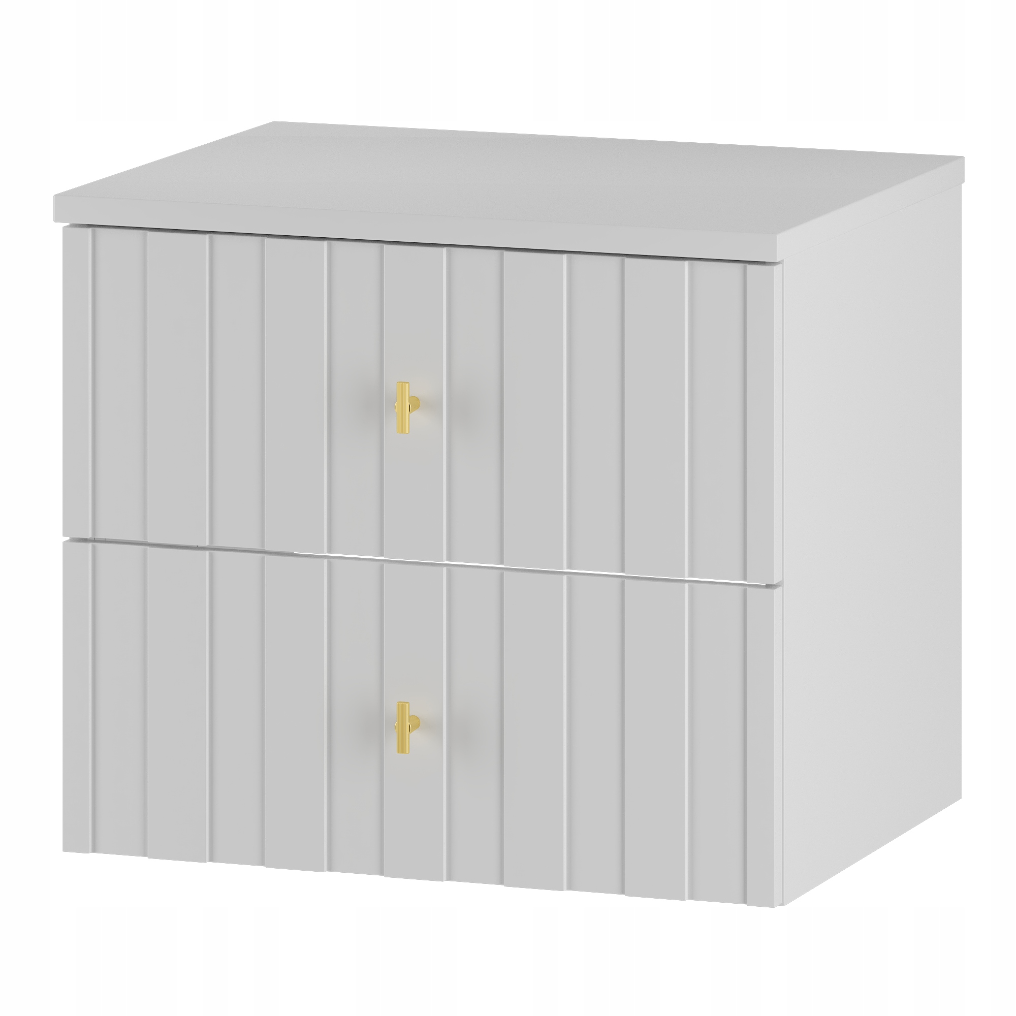 Model o szerokości 60 cm został wyposażony w dwie praktyczne szuflady z prowadnicami dolnego montażu i systemem cichego domykania, co zapewnia komfort i cichą pracę. Całość uzupełnia blat w kolorze białym, który podkreśla minimalistyczny charakter mebla i nadaje mu spójnego wyglądu. Wisząca konstrukcja sprawia, że szafka prezentuje się lekko i ułatwia sprzątanie w łazience.