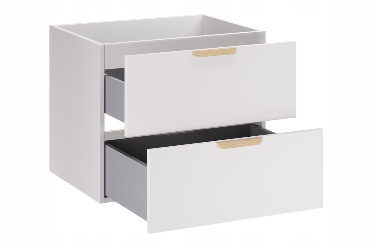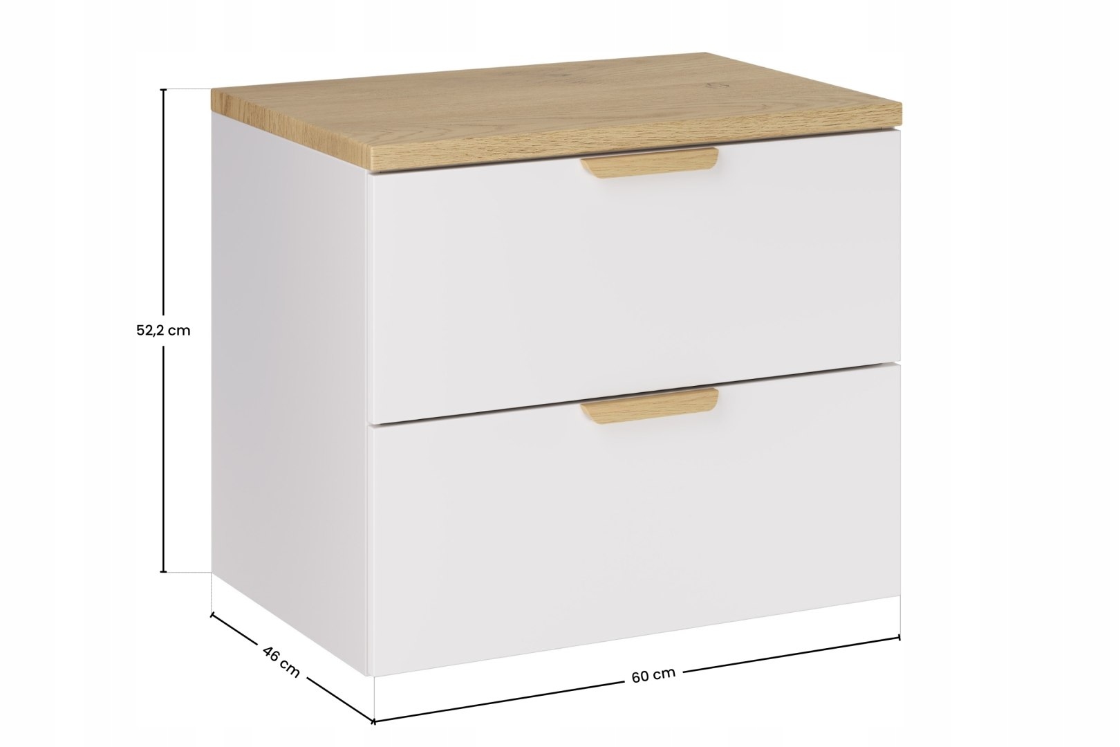 Zestaw o szerokości 60 cm to kompaktowe rozwiązanie idealne do mniejszych łazienek. Szafka wyposażona jest w dwie pojemne szuflady, które zapewniają wygodne przechowywanie kosmetyków i akcesoriów. Blat umożliwia montaż umywalki nablatowej według własnej koncepcji – nie posiada fabrycznie wyciętego otworu, dlatego należy go wykonać zgodnie z wybraną instalacją. Zestaw nie zawiera umywalki.
