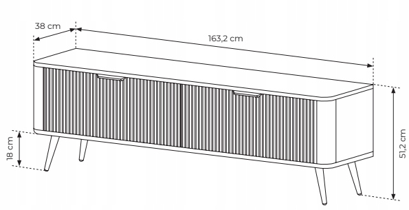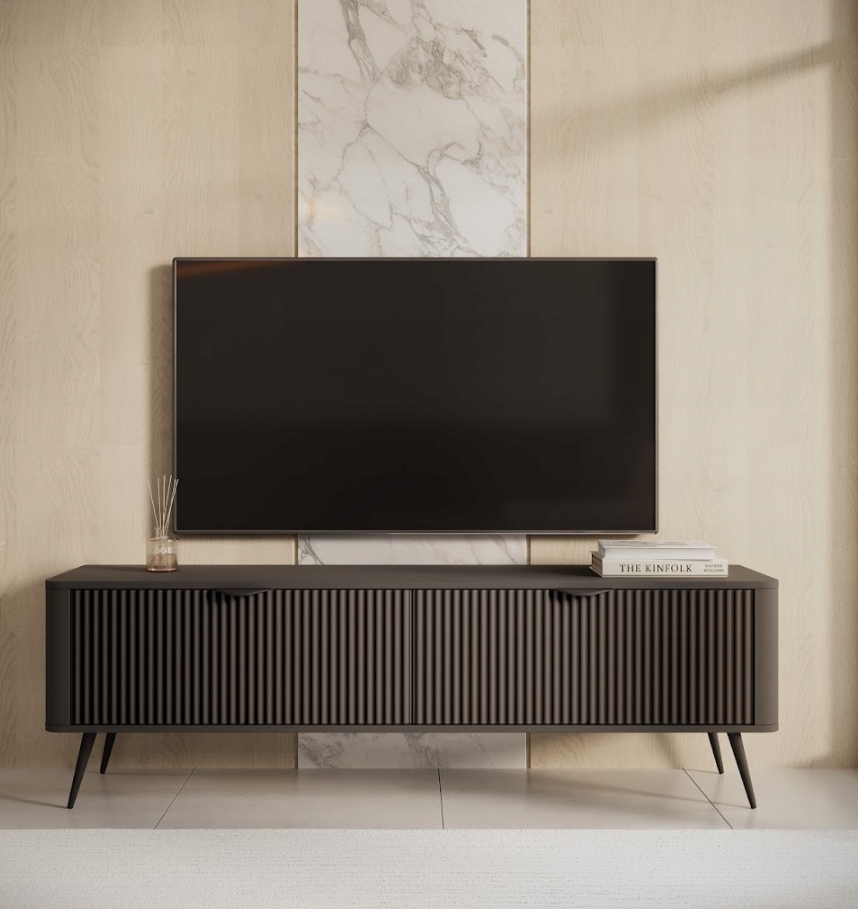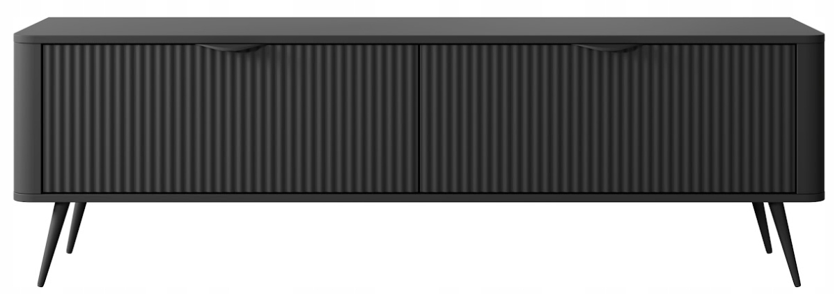 Szafka RTV LANTE o szerokości 163 cm w matowej czerni to nowoczesna propozycja dla osób poszukujących eleganckiego mebla o wyrazistym charakterze. Ryflowane fronty, zaokrąglone boki i jednolita, głęboka kolorystyka tworzą harmonijną i designerską całość, która doskonale odnajdzie się w nowoczesnych aranżacjach. Czarne metalowe uchwyty i walcowate nóżki nadają bryle lekkości i spójności, wpisując się w estetykę total black z nutą stylu glamour. Przemyślany układ dwóch zamykanych szafek oraz otwartej wnęki pozwala na wygodne przechowywanie sprzętu multimedialnego, kabli i niezbędnych akcesoriów, zachowując przy tym porządek i estetykę strefy dziennej. Mebel wykonano z trwałych materiałów – płyty MDF z frezowaniem, płyty laminowanej i metalu – co gwarantuje nie tylko atrakcyjny wygląd, ale także komfort użytkowania i stabilność. Produkt przeznaczony jest do samodzielnego montażu i został wyprodukowany w Polsce.