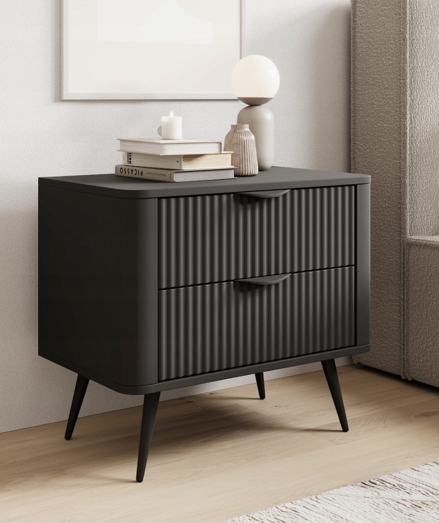 Szafka nocna LANTE w matowej czerni to elegancki dodatek do nowoczesnej sypialni, który łączy minimalistyczną formę z wyrazistym charakterem. Frezowany front i zaokrąglone krawędzie nadają bryle subtelnej lekkości, a jednolita czarna kolorystyka w połączeniu z metalowymi uchwytami i walcowatymi nóżkami tworzy spójną kompozycję w stylu total black. Szafka została wyposażona w pojemną szufladę na prowadnicy kulkowej z pełnym wysuwem, co zapewnia komfort codziennego użytkowania i łatwy dostęp do przechowywanych przedmiotów. To idealne rozwiązanie do sypialni urządzonej w stylu glamour, nowoczesnym lub minimalistycznym. Mebel wykonano z trwałych materiałów, w tym frezowanego MDF, płyty laminowanej i metalu, a całość została wykończona estetyczną i odporną na uszkodzenia okleiną ABS. Produkt przeznaczony jest do samodzielnego montażu i został wyprodukowany w Polsce.