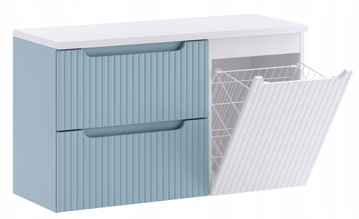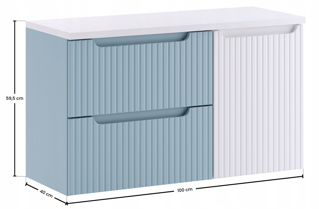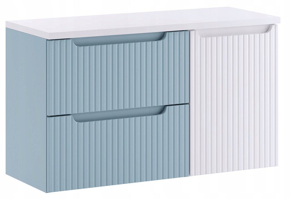 Szafka łazienkowa z kolekcji Nova w konfiguracji 100 cm to nowoczesna i funkcjonalna zabudowa strefy umywalkowej, zaprojektowana jako spójna bryła montowana pod jednym blatem. Połączenie białego matu, głębokiego koloru Denim oraz gładkiego białego blatu nadaje całości lekki, świeży charakter i doskonale sprawdza się w nowoczesnych oraz minimalistycznych aranżacjach łazienek. Ryflowane fronty oraz zintegrowane podchwyty podkreślają estetykę kolekcji i zapewniają jednolitą, elegancką linię bez widocznych uchwytów.