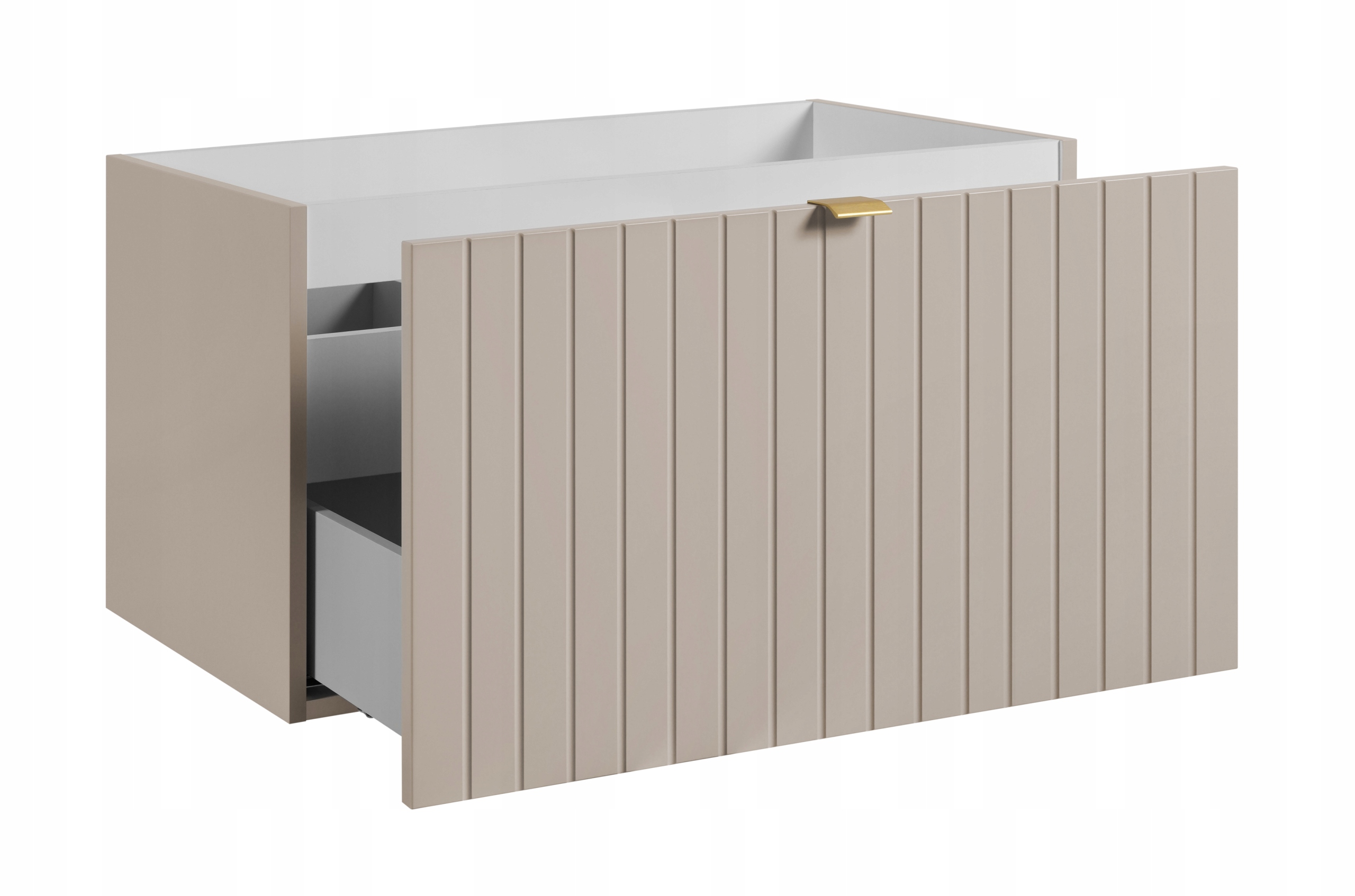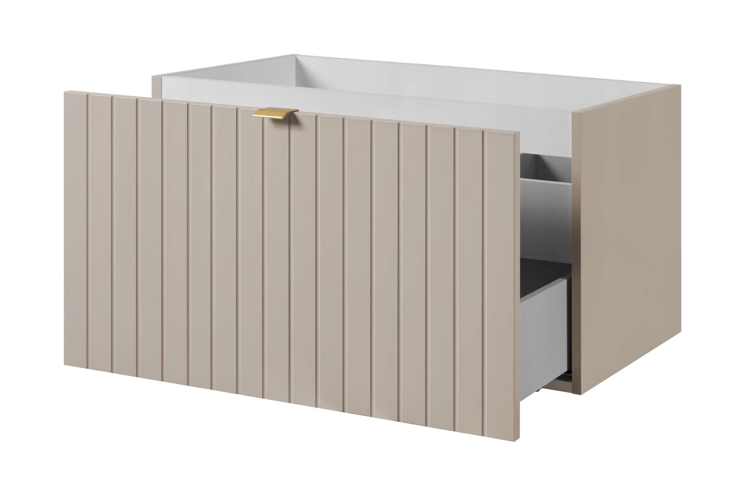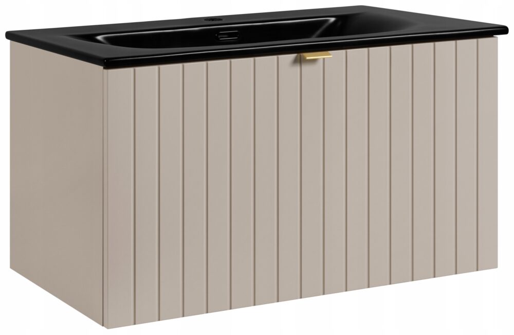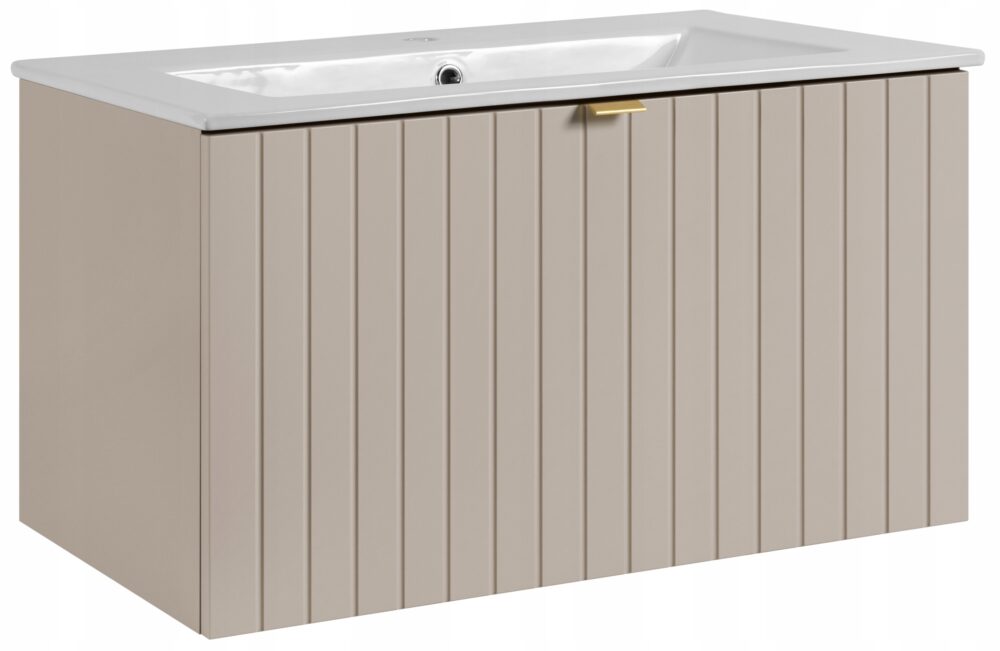 Kolekcja HARMO łączy elegancki design z funkcjonalnymi rozwiązaniami, które doskonale komponują się z nowoczesnymi łazienkami. Pionowo frezowane fronty z płyty MDF w kaszmirowym półmacie podkreślają subtelny i nowoczesny charakter mebla, a wisząca konstrukcja dodaje lekkości i ułatwia sprzątanie. Szafka o szerokości 80 cm została wyposażona w pojemną szufladę zewnętrzną na prowadnicach Hettich Quadro z funkcją cichego domyku oraz dodatkową wewnętrzną szufladkę idealną do przechowywania drobnych akcesoriów. W zestawie znajduje się umywalka z marmuru syntetycznego w białym kolorze oraz trzy warianty uchwytów: czarny, złoty i srebrny szczotkowany. Meble wyprodukowane w Polsce z wysokiej jakości materiałów.